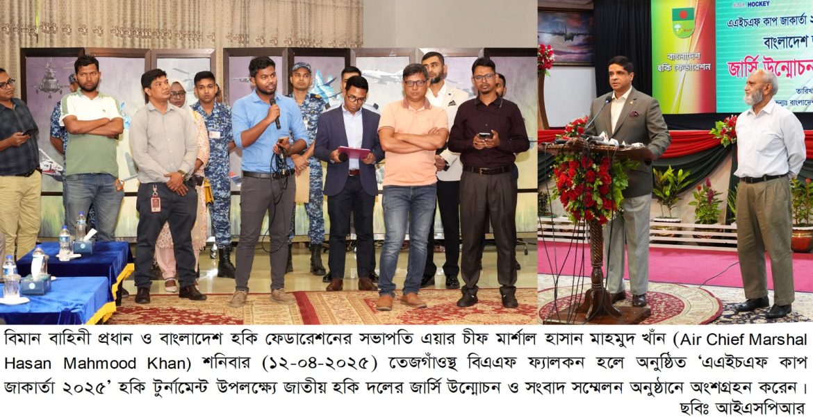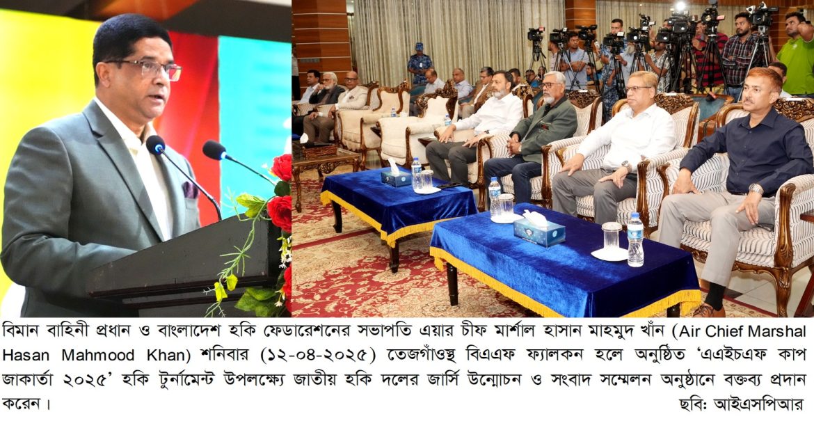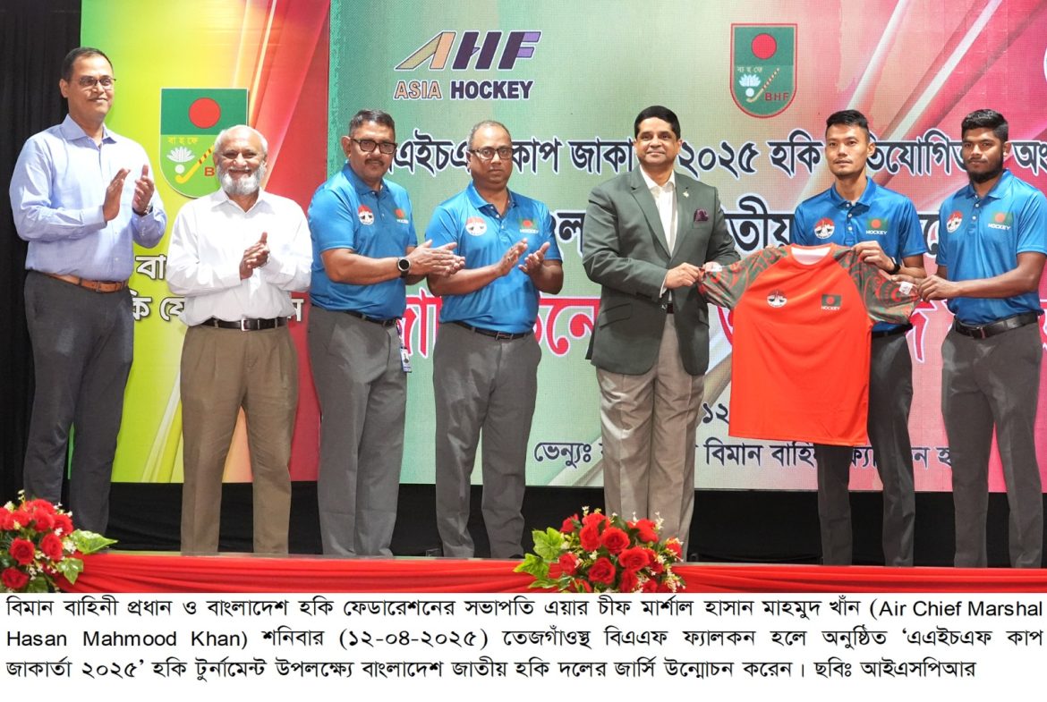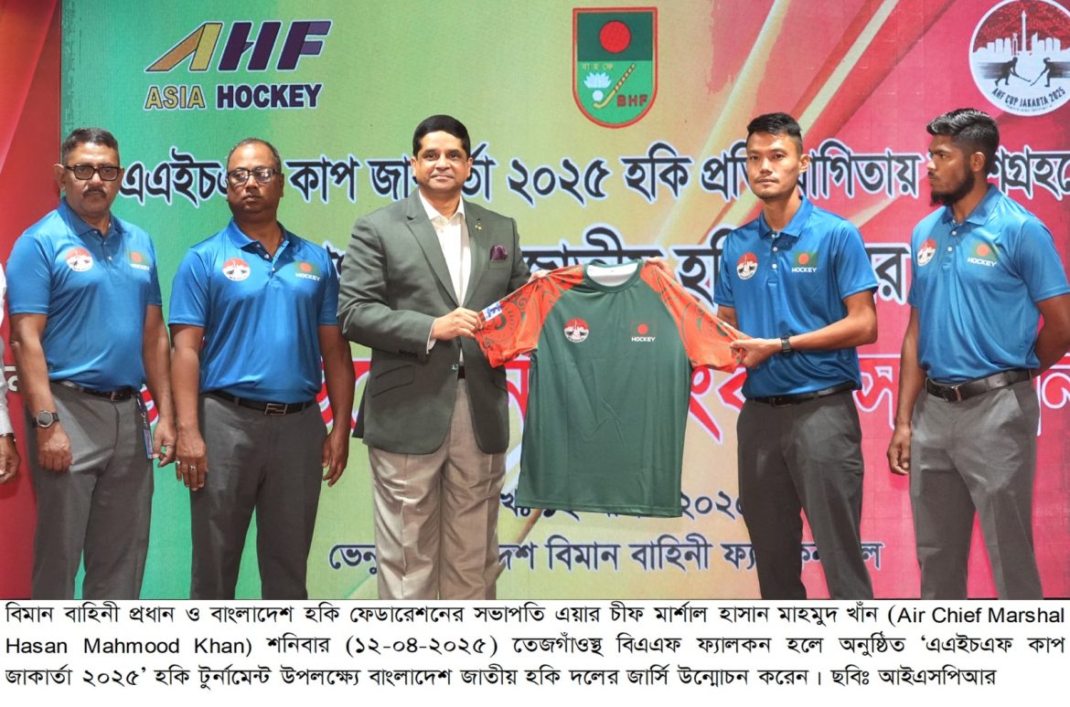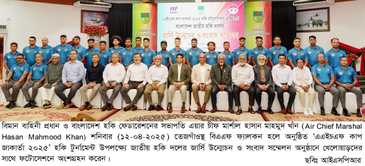 ঢাকা, ১২ এপ্রিলঃ আগামী ১৭-২৭ এপ্রিল ২০২৫ পর্যন্ত জাকার্তা, ইন্দোনেশিয়ায় অনুষ্ঠিতব্য ‘এএইচএফ কাপ জাকার্তা ২০২৫’ হকি প্রতিযোগিতায় বাংলাদেশ জাতীয় হকি দল অংশগ্রহণ করতে যাচ্ছে। উক্ত টুর্নামেন্টে অংশগ্রহণ উপলক্ষ্যে ১২ এপ্রিল ২০২৫ তারিখ, শনিবার ঢাকাস্থ বাংলাদেশ বিমান বাহিনী ফ্যালকন হলে বাংলাদেশ জাতীয় হকি দলের জার্সি উন্মোচন, ফটোসেশন এবং সংবাদ সম্মেলন (MEET THE PRESS) অনুষ্ঠান অনুষ্ঠিত হয়। উক্ত অনুষ্ঠানে প্রধান অতিথি হিসেবে উপস্থিত ছিলেন সম্মানিত বিমান বাহিনী প্রধান ও বাংলাদেশ হকি ফেডারেশনের সভাপতি এয়ার চীফ মার্শাল হাসান মাহমুদ খাঁন, বিবিপি, ওএসপি, জিইউপি, এনএসডব্লিউসি, পিএসসি (Chief of Air Staff of Bangladesh Air Force and President of Bangladesh Hockey Federation Air Chief Marshal Hasan Mahmood Khan, BBP, OSP, GUP, nswc, psc)।