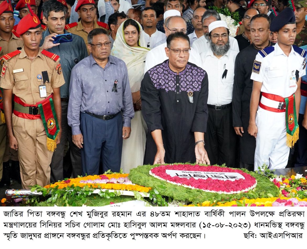 জাতির পিতা বঙ্গবন্ধু শেখ মুজিবুর রহমান এর ৪৮তম শাহাদাত বার্ষিকী পালন উপলক্ষে প্রতিরক্ষা মন্ত্রণালয়ের সিনিয়র সচিব গোলাম মোঃ হাসিবুল আলম মঙ্গলবার (১৫-০৮-২০২৩) ধানমন্ডিস্থ বঙ্গবন্ধু স্মৃতি জাদুঘর প্রাঙ্গনে বঙ্গবন্ধুর প্রতিকৃতিতে পুষ্পস্তবক অর্পণ করে।