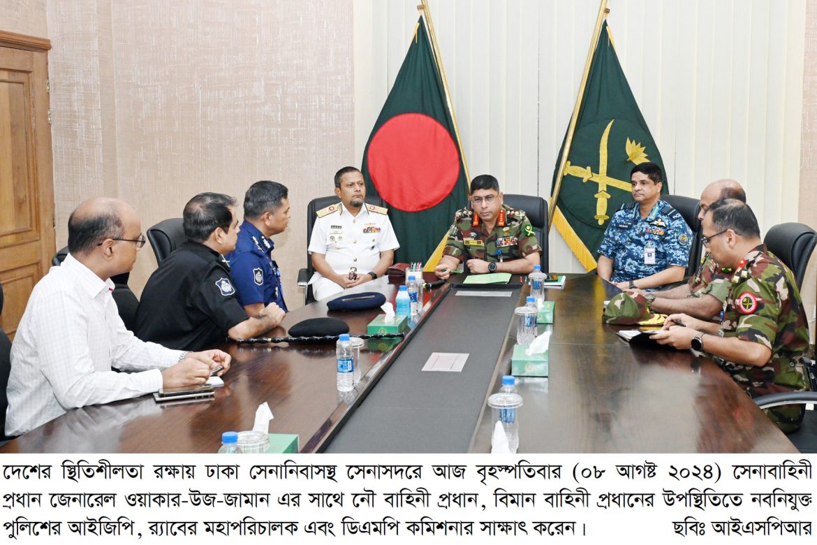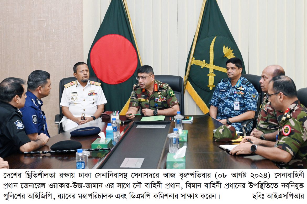 ঢাকা, ০৮ আগস্ট ২০২৪ (বৃহস্পতিবার): চলমান অরাজকতা, অগ্নি সংযোগ ও ধ্বংসাত্মক কার্যক্রম বন্ধের মাধ্যমে দেশের স্থিতিশীলতা রক্ষায় সশস্ত্র বাহিনীসহ অন্যান্য আইন-শৃঙ্খলা রক্ষাকারী বাহিনীর শক্ত অবস্থান গ্রহণের বিষয়ে বাহিনী প্রধানগণ কর্তৃক সিদ্ধান্ত গৃহিত হয়। আজ (০৮ আগস্ট ২০২৪) সেনাসদরে সেনাবাহিনী প্রধান জেনারেল ওয়াকার-উজ-জামান, ওএসপি, এসজিপি, পিএসসি এর সাথে নৌ ও বিমান বাহিনী প্রধানের উপস্থিতিতে নবনিযুক্ত পুলিশের আইজিপি, র্যাবের মহাপরিচালক এবং ডিএমপি কমিশনার সাক্ষাৎ করেন। এসময় আগামী ২৪ ঘন্টার মধ্যে সেনাবাহিনীর সহায়তায় দেশের সকল থানার কার্যক্রম শুরু করার বিষয়ে আলোচনা হয়। এ ব্যাপারে সকলের সহযোগিতা কাম্য।