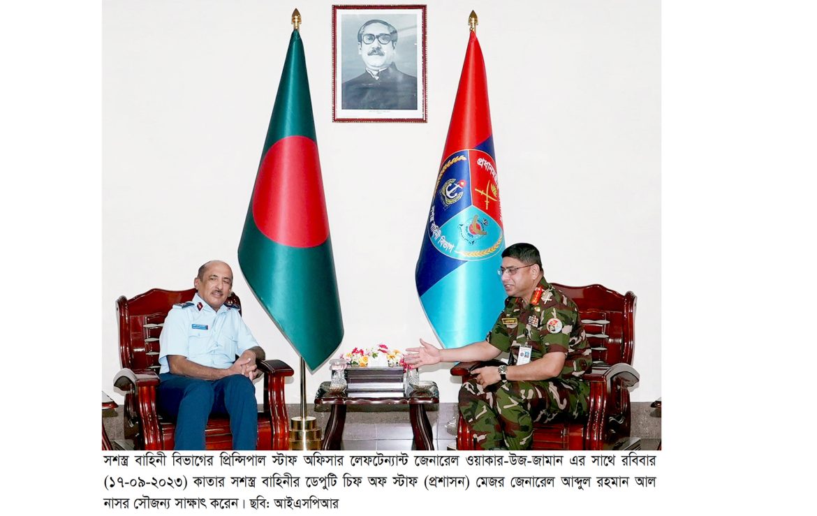 ঢাকা, ১৭ সেপ্টেম্বর ২০২৩: প্রিন্সিপাল স্টাফ অফিসার, সশস্ত্র বাহিনী বিভাগ লেফটেন্যান্ট জেনারেল ওয়াকার-উজ-জামান এর সাথে আজ রবিবার (১৭-০৯-২০২৩) কাতার সশস্ত্র বাহিনীর ডেপুটি চিফ অফ স্টাফ (প্রশাসন) মেজর জেনারেল আব্দুল রহমান আল নাসর এর নেতৃত্বে একটি প্রতিনিধিদল সৌজন্য সাক্ষাৎ করেন। উক্ত সৌজন্য সাক্ষাতে বাংলাদেশ ও কাতারের মধ্যে পারস্পারিক বন্ধুত্বপূর্ণ এবং প্রতিরক্ষা খাতে দ্বিপাক্ষিক সম্পর্ক আরো সুদৃঢ় করার বিষয়ে আলোচনা হয়।
