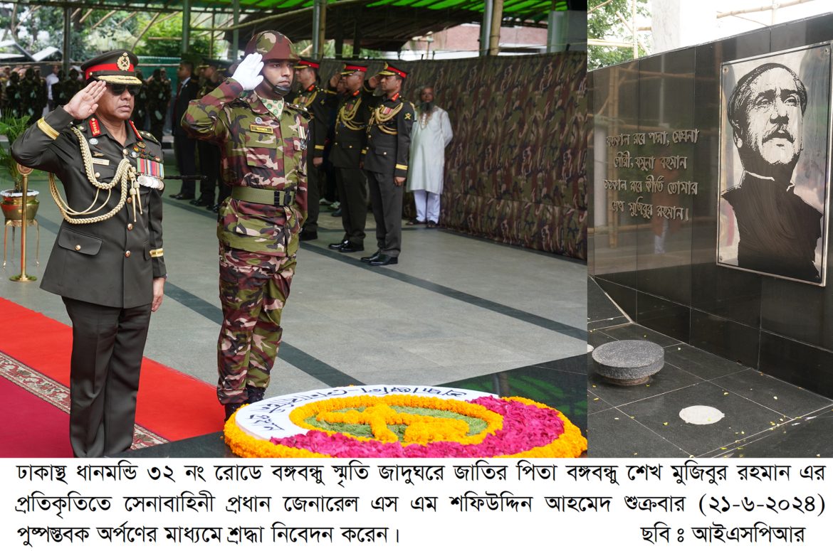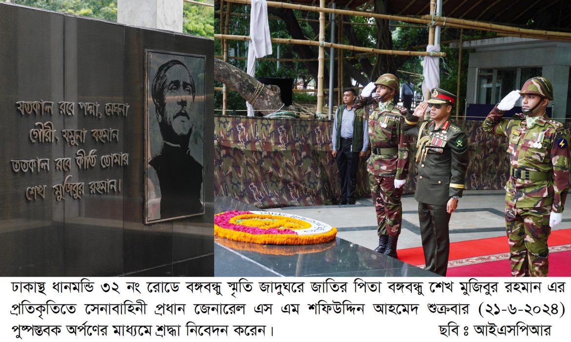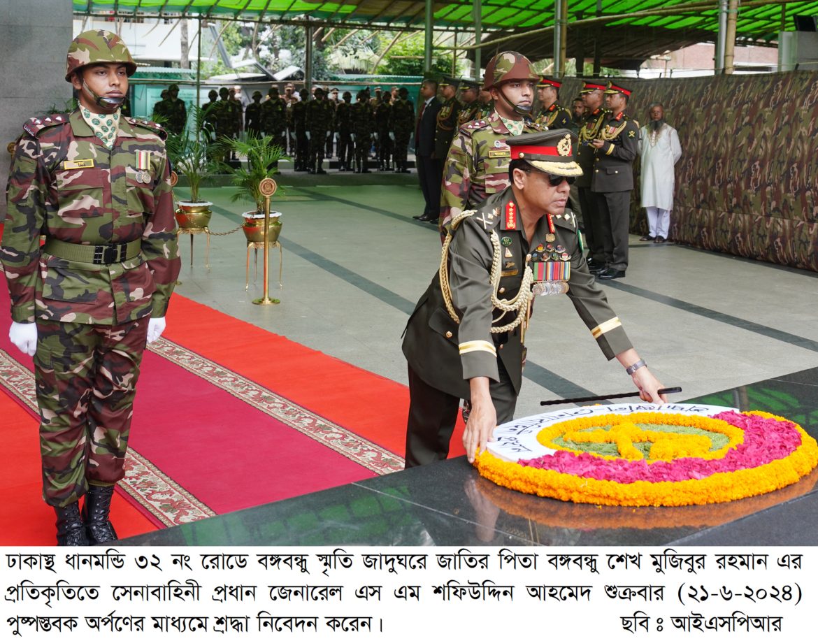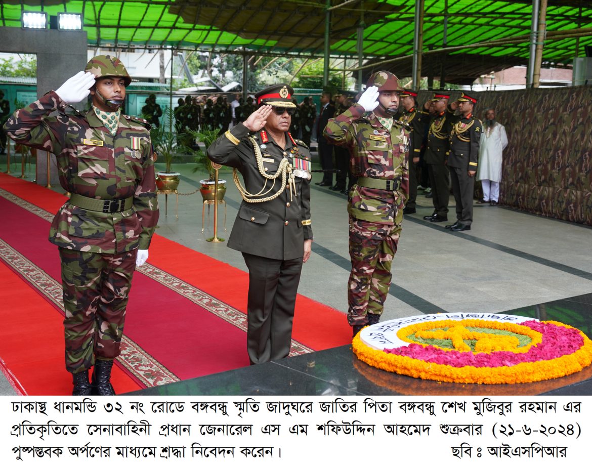 বঙ্গবন্ধু স্মৃতি জাদুঘরে জাতির পিতার প্রতিকৃতিতে পুষ্পস্তবক অর্পণ করলেন সেনাবাহিনী প্রধান