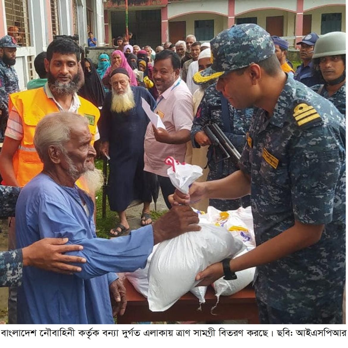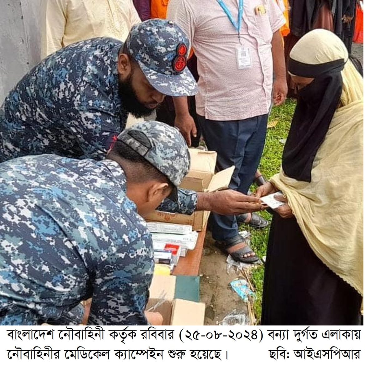 এছাড়াও বিশেষজ্ঞ ডাক্তারের সমন্বয়ে ৭টি অস্থায়ী মেডিকেল টিমের মাধ্যমে সর্বমোট ২,৩৫৭ জনকে চিকিৎসা সহায়তা প্রদান করা হয়েছে। ভোলার রাজাপুর ইউনিয়নে পানি বিপদ সীমার উপর দিয়ে অতিবাহিত হয়ে স্থানীয় এলাকাসমূহ প্লাবিত হওয়ায় বন্যার্তদের মাঝে ত্রাণ, ওষুধ ও চিকিৎসা সেবা প্রদান করছে বাংলাদেশ নৌবাহিনী।