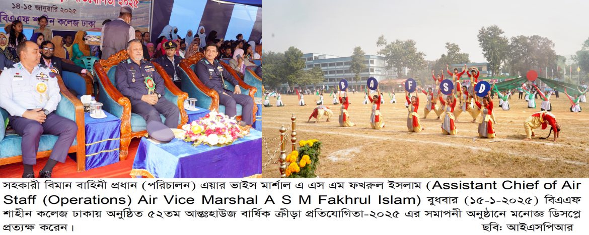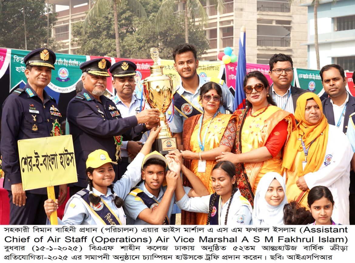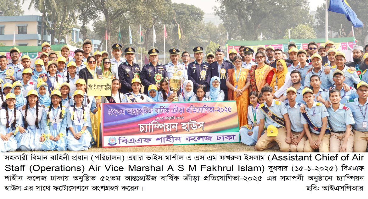 ঢাকা, ১৫ জানুয়ারিঃ বিএএফ শাহীন কলেজ ঢাকা এর ৫২তম আন্তঃহাউজ বার্ষিক ক্রীড়া প্রতিযোগিতা-২০২৫ এর সমাপনী অনুষ্ঠান বুধবার (১৫-১-২০২৫) কলেজের খেলার মাঠে অনুষ্ঠিত হয়। সমাপনী অনুষ্ঠানে প্রধান অতিথি হিসেবে উপস্থিত ছিলেন সহকারী বিমান বাহিনী প্রধান (পরিচালন) এয়ার ভাইস মার্শাল এ এস এম ফখরুল ইসলাম, বিবিপি, ওএসপি, জিইউপি, এনডিসি, এএফডব্লিউসি, পিএসসি (Assistant Chief of Air Staff (Operations) Air Vice Marshal A S M Fakhrul Islam, BBP, OSP, GUP, ndc, afwc, psc)।