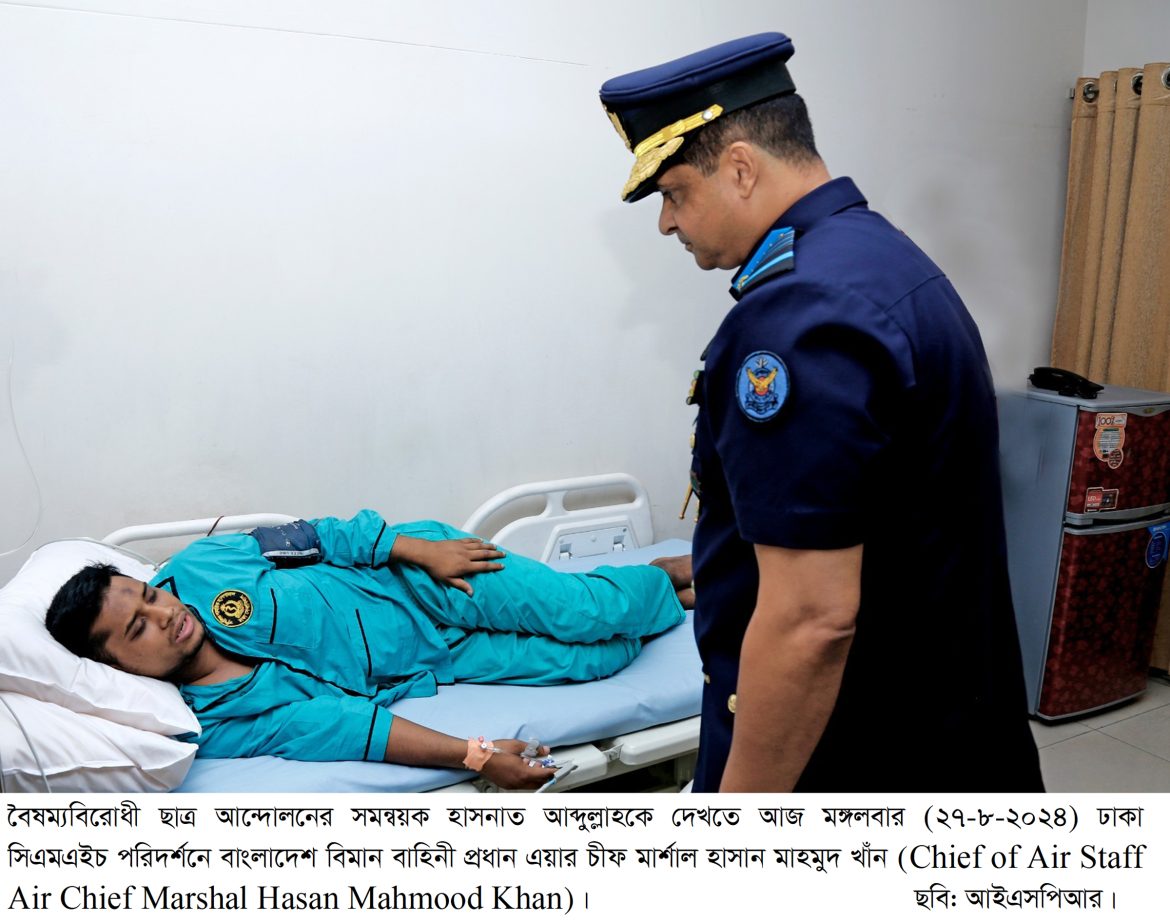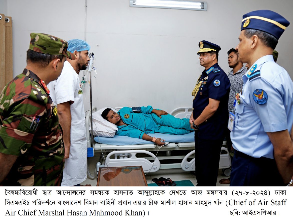 ঢাকা, ২৭ আগস্টঃ রাজধানীর সচিবালয় এলাকায় আনসার সদস্যদের সঙ্গে শিক্ষার্থীদের সংঘর্ষে গুরুতর আহত বৈষম্যবিরোধী ছাত্র আন্দোলনের অন্যতম সমন্বয়ক হাসনাত আব্দুল্লাহকে দেখতে ২৭ আগস্ট ২০২৪ তারিখে ঢাকা সিএমএইচ পরিদর্শনে যান বাংলাদেশ বিমান বাহিনী প্রধান এয়ার চীফ মার্শাল হাসান মাহমুদ খাঁন, বিবিপি, ওএসপি, জিইউপি, এনএসডব্লিউসি, পিএসসি (Chief of Air Staff Air Chief Marshal Hasan Mahmood Khan, BBP, OSP, GUP, nswc, psc)। এসময় বিমান বাহিনী প্রধান তার শারিরীক অবস্থার খোঁজখবর নেন।
