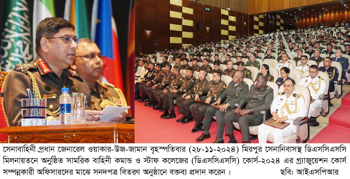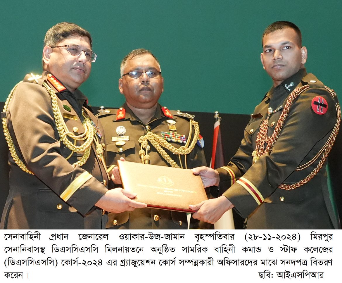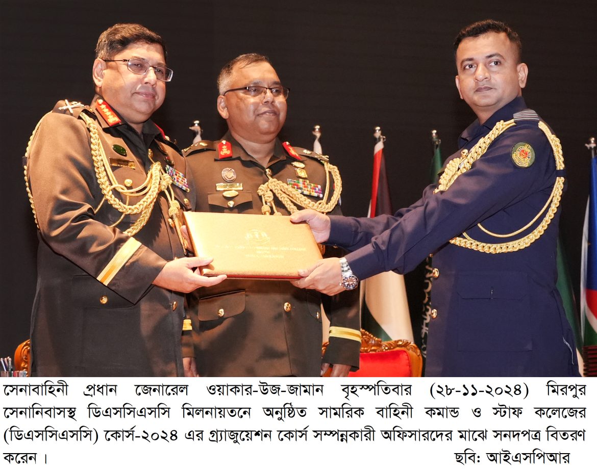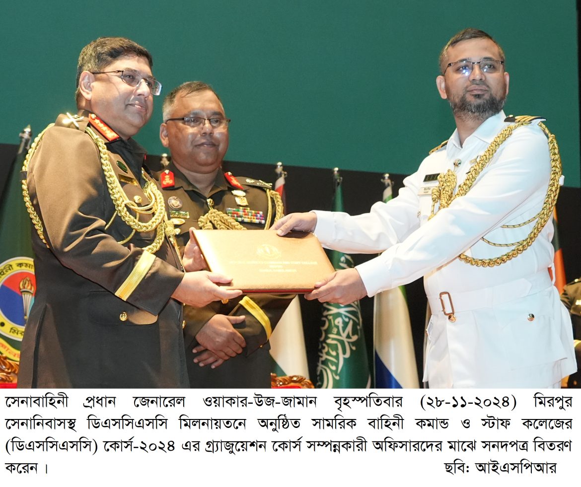 সম্মানিত সেনাবাহিনী প্রধান জেনারেল ওয়াকার-উজ-জামান, ওএসপি, এসজিপি, পিএসসি এই অনুষ্ঠানে প্রধান অতিথি হিসেবে উপস্থিত থেকে কোর্স সম্পন্নকারী অফিসারদের মাঝে গ্র্যাজুয়েশন (পিএসসি) সনদপত্র বিতরণ করেন। অনুষ্ঠানের শুরুতে সেনাবাহিনী প্রধান বলেন, দেশী ও বিদেশী সামরিক কর্মকর্তাদের কৌশলগত দক্ষতা বৃদ্ধিতে ও আন্তর্জাতিক সহযোগিতা উন্নয়নে ডিএসসিএসসির ভূমিকা অনস্বীকার্য। গ্র্যাজুয়েশন সম্পন্নকারী অফিসারগণকে অভিনন্দন জানিয়ে তিনি তাদের এই কোর্সে অর্জিত প্রজ্ঞা, সংকল্প ও পরিকল্পনাকে জাতির অগ্রগতিতে কাজে লাগানোর পরামর্শ দেন। তিনি সামরিক বাহিনী কমান্ড ও স্টাফ কলেজের কমান্ড্যান্টকে ডিএসসিএসসি কোর্স-২০২৪ এর সফল সমাপ্তির জন্য ধন্যবাদ জ্ঞাপন করেন।