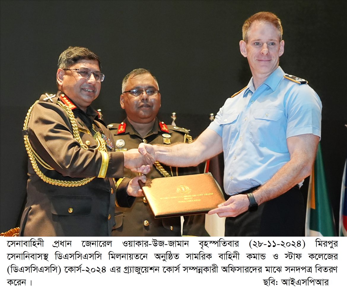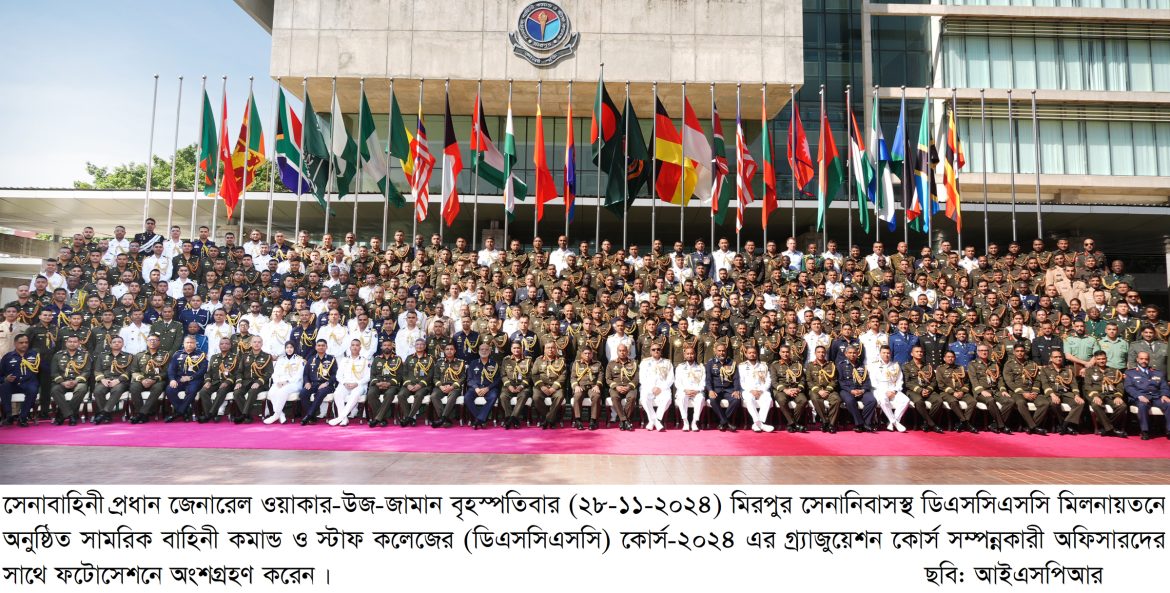 ঢাকা, ২৮ নভেম্বর : সামরিক বাহিনী কমান্ড ও স্টাফ কলেজের (ডিএসসিএসসি) কোর্স-২০২৪ এর গ্র্যাজুয়েশন সনদ বিতরণ অনুষ্ঠান আজ বৃহস্পতিবার (২৮-১১-২০২৪) ডিএসসিএসসি মিলনায়তন, ডিএসসিএসসি, মিরপুর সেনানিবাস, ঢাকায় অনুষ্ঠিত হয়।
