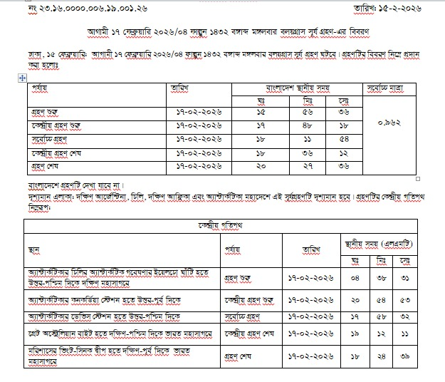 আন্তঃবাহিনী সংস্থাব্রেকিং নিউজহোম আগামী ১৭ ফেব্রুয়ারি ২০২৬/০৪ ফাল্গুন ১৪৩২ বঙ্গাব্দ মঙ্গলবার বলয়গ্রাস সূর্য গ্রহণ-এর বিবরণ Author: আইএসপিআর ফেব্রুয়ারি ১৫, ২০২৬ Author: আইএসপিআর ফেব্রুয়ারি ১৫, ২০২৬ ২০ 0 FacebookTwitterPinterestEmail আইএসপিআর এই সংবাদটি আন্তঃবাহিনী জনসংযোগ পরিদপ্তর কর্তৃক যাচাইকৃত ও প্রকাশিত। Before Post ‘ভূমিকম্প ও ও অন্যান্য দুর্যোগকালে অনুসন্ধান, উদ্ধার অভিযান পরিচালনা এবং জন্মরি যোগাযোগের জন্য যন্ত্রপাতি সংগ্রহ (৩য় পর্যায়)’ শীর্ষক প্রকল্পের আওতায় ক্রয়কৃত দুর্যোগ সক্ষমতা সরঞ্জাম সশস্ত্র বাহিনী বিভাগকে হস্তান্তর সম্পর্কিত পোস্ট ‘ভূমিকম্প ও ও অন্যান্য দুর্যোগকালে অনুসন্ধান, উদ্ধার অভিযান... ফেব্রুয়ারি ১০, ২০২৬ নৌবাহিনীর অভিযানে টেকনাফে ০৫ লক্ষ পিস ইয়াবা জব্দ ফেব্রুয়ারি ৯, ২০২৬ রাসায়নিক অস্ত্র কনভেনশন (CWC) এর উপর কৃত্রিম বুদ্ধিমত্তার... ফেব্রুয়ারি ৯, ২০২৬ অবাধ ও সুষ্ঠু নির্বাচন নিশ্চিতে মাঠ পর্যায় পরিদর্শনে... ফেব্রুয়ারি ৮, ২০২৬ নৌবাহিনীর জন্য হাইড্রোগ্রাফিক ও ওশানোগ্রাফিক জরিপ জাহাজ ক্রয়... ফেব্রুয়ারি ৮, ২০২৬ ৫ম ক্রাউন সিমেন্ট ভাষা দিবস গলফ কাপ টুর্নামেন্ট-২০২৬... ফেব্রুয়ারি ৮, ২০২৬ যৌথ বাহিনী কর্তৃক পরিচালিত উল্লেখযোগ্য অভিযানসমূহের সারসংক্ষেপ (৩০... ফেব্রুয়ারি ৬, ২০২৬ ত্রয়োদশ জাতীয় সংসদ নির্বাচন ও গণভোট- ২০২৬ উপলক্ষ্যে... ফেব্রুয়ারি ৫, ২০২৬ অবাধ ও সুষ্ঠু নির্বাচন নিশ্চিতে মাঠ পর্যায় পরিদর্শনে... ফেব্রুয়ারি ৪, ২০২৬ ত্রয়োদশ জাতীয় সংসদ নির্বাচন ও গণভোট-২০২৬ উপলক্ষ্যে সেনাবাহিনী... ফেব্রুয়ারি ৩, ২০২৬