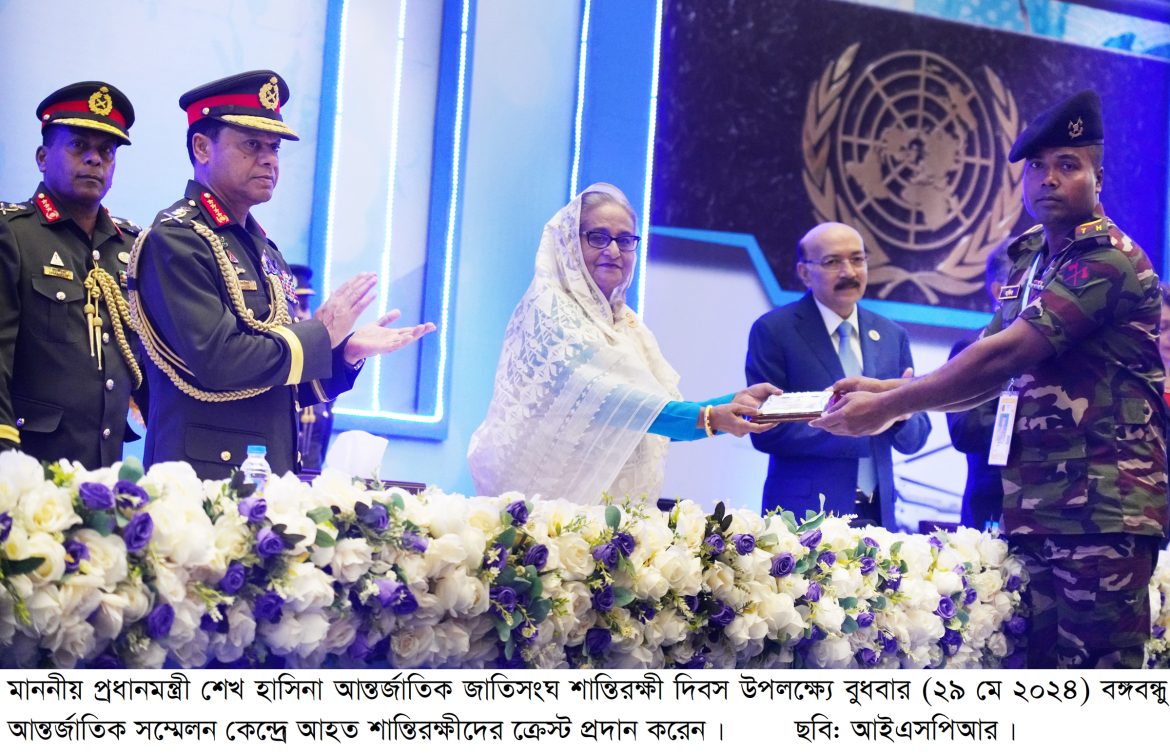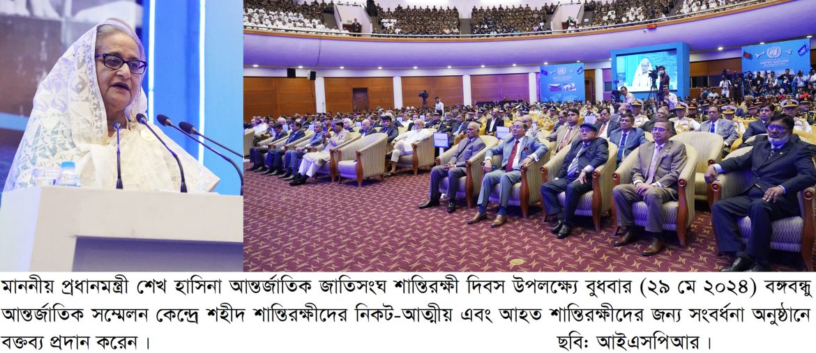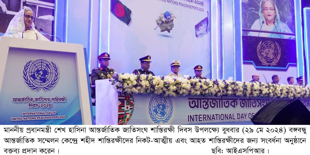 শান্তিরক্ষী দিবসের কর্মসূচির অংশ হিসেবে ২৯ মে ২০২৪ (বুধবার) সকাল ১১০০ ঘটিকায় বঙ্গবন্ধু আন্তর্জাতিক সম্মেলন কেন্দ্রে শহীদ শান্তিরক্ষীদের নিকট-আত্মীয় এবং আহত শান্তিরক্ষীদের জন্য সংবর্ধনা প্রদান করা হয়। সংবর্ধনায় মাননীয় প্রধানমন্ত্রী শেখ হাসিনা প্রধান অতিথি হিসেবে উপস্থিত ছিলেন। মাননীয় প্রধানমন্ত্রী শেখ হাসিনা তাঁর ভাষণে বলেন, ——————— (ভাষণের কপি সংযুক্ত) ——————।