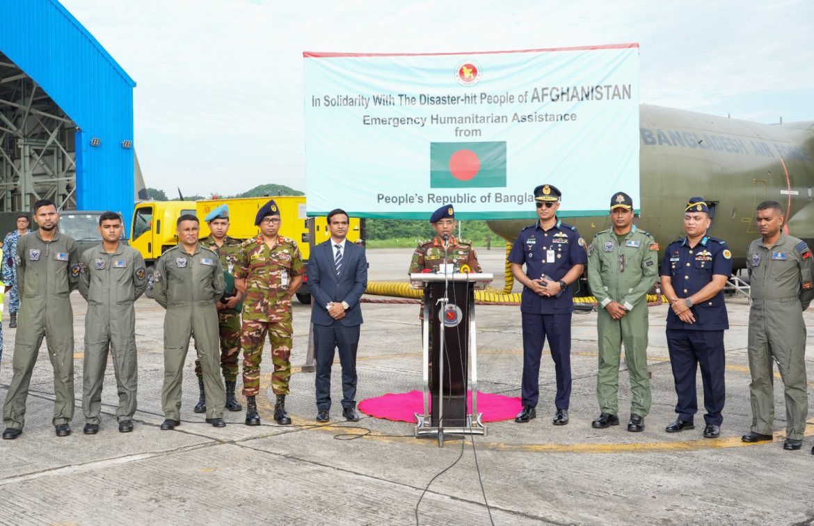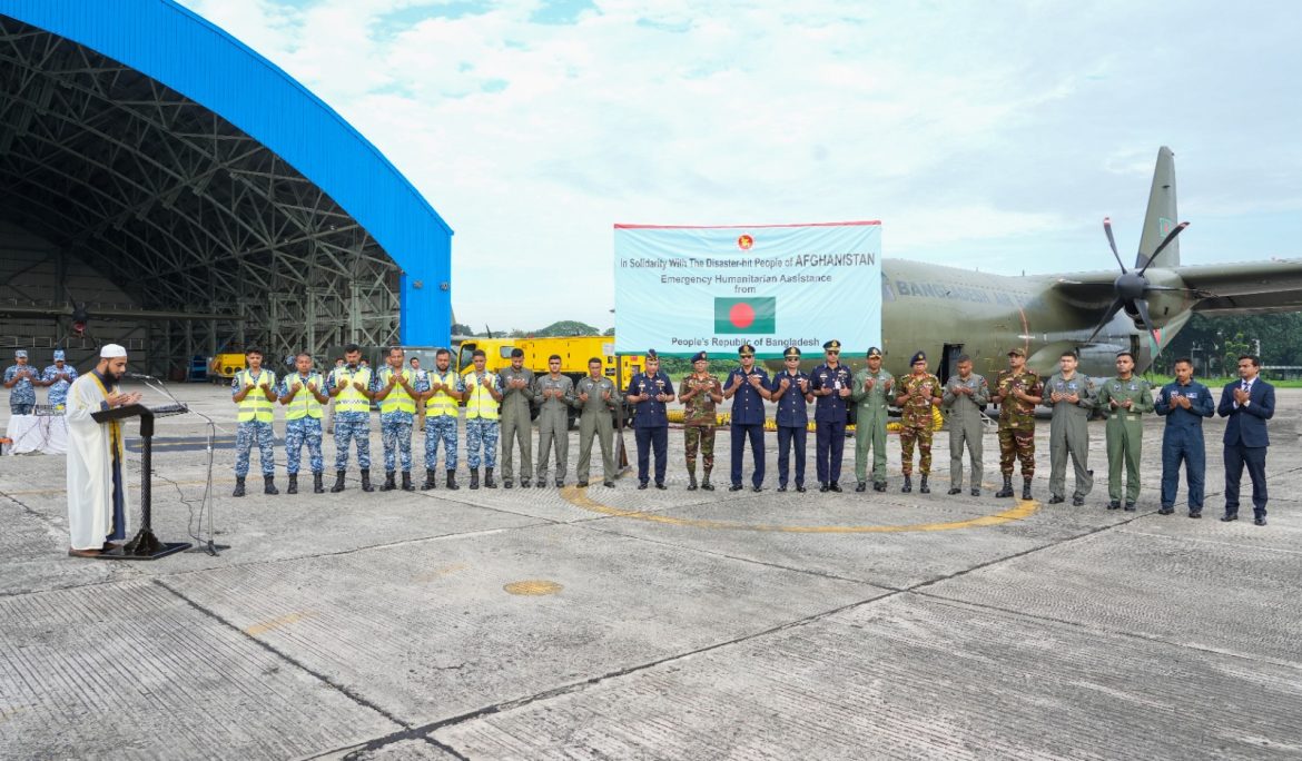 মাননীয় প্রধান উপদেষ্টার নির্দেশে ভূমিকম্পে সৃষ্ট আকস্মিক দুর্যোগ মোকাবেলায় আফগান জনগণের জন্য বাংলাদেশ সরকারের পক্ষ থেকে জরুরি মানবিক সহায়তা প্রদানের উদ্যোগ গ্রহণ করা হয়েছে। এরই ধারাবাহিকতায়, আজ ০৫ সেপ্টেম্বর ২০২৫ (শুক্রবার)  সকাল ০৮০০ ঘটিকায় বাংলাদেশ বিমান বাহিনীর একটি পরিবহন বিমান জরুরি ত্রাণ সামগ্রীসহ আফগানিস্তানের কাবুলের উদ্দেশ্যে গমন করে। আজ প্রেরণকৃত ১১.২২৭ টন ত্রাণ সহায়তার মধ্যে রয়েছে তাঁবু, কম্বল, শীতবস্ত্র, খাবার পানি, শুকনো খাবার, কাপড়, বিস্কুট, মিল্ক পাউডার, নুডুলস  এবং ঔষধ। এসব ত্রাণ সামগ্রী হস্তান্তর শেষে বিমান বাহিনীর পরিবহন বিমানটি আজই বাংলাদেশে প্রত্যাবর্তন করবে।
