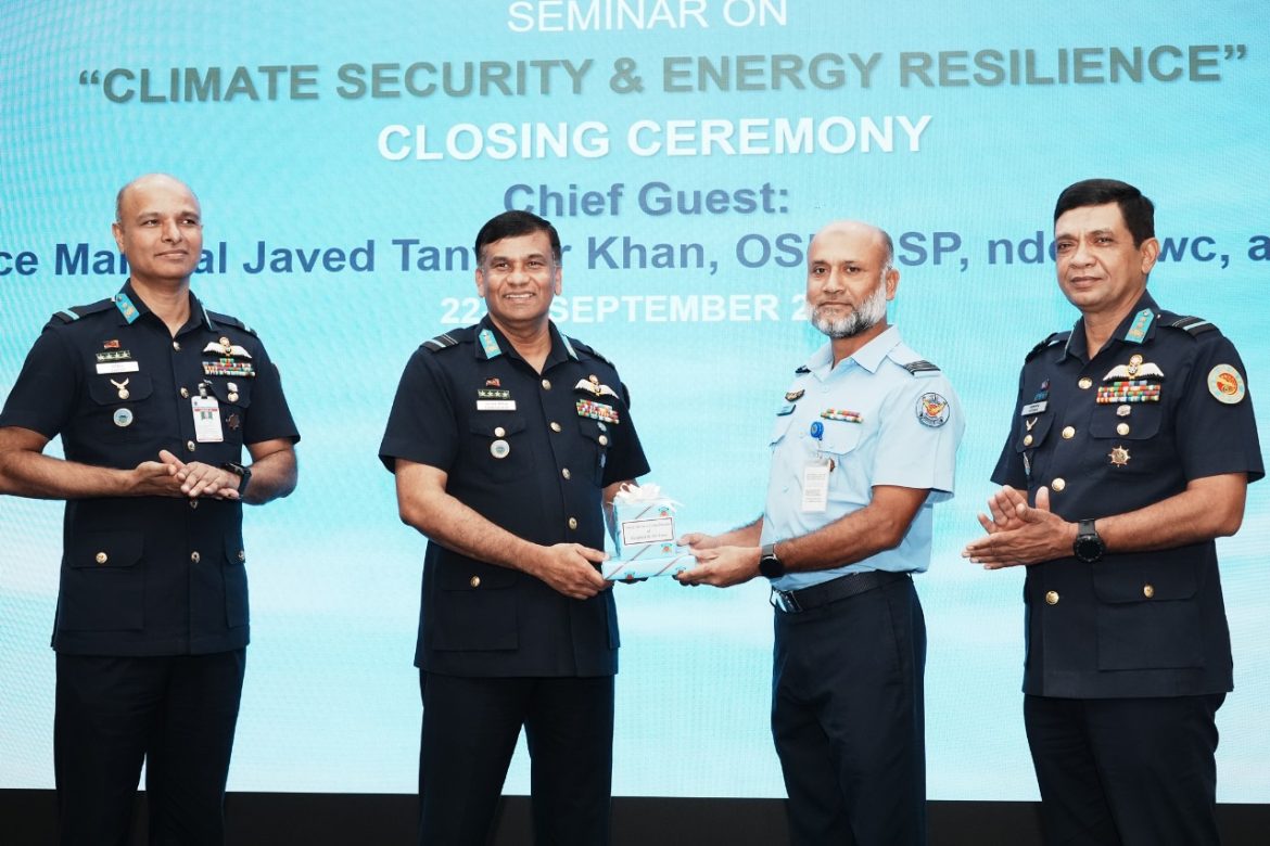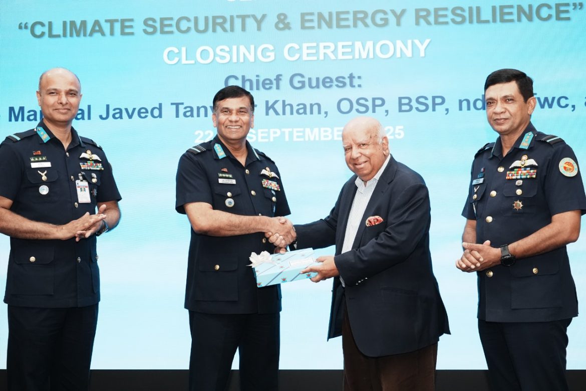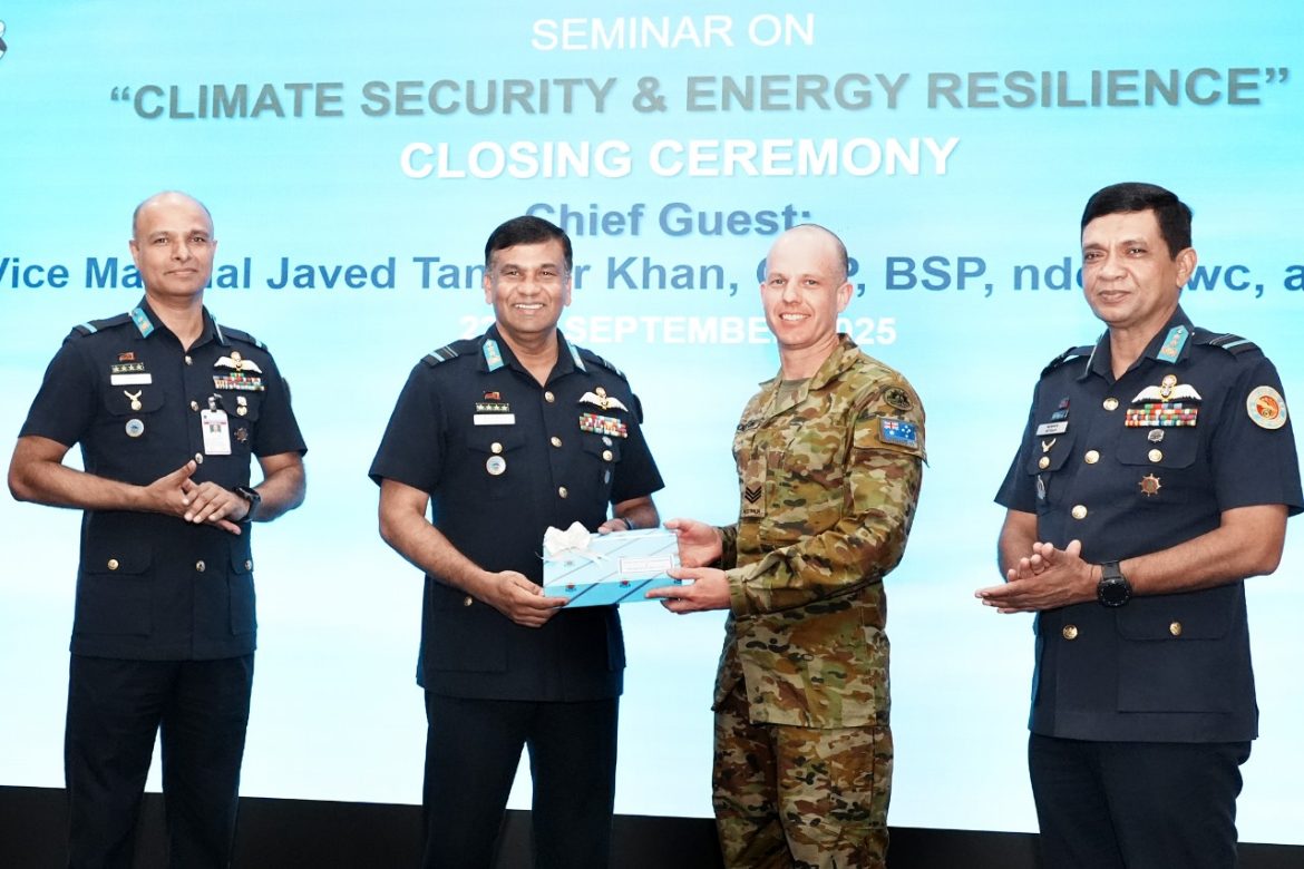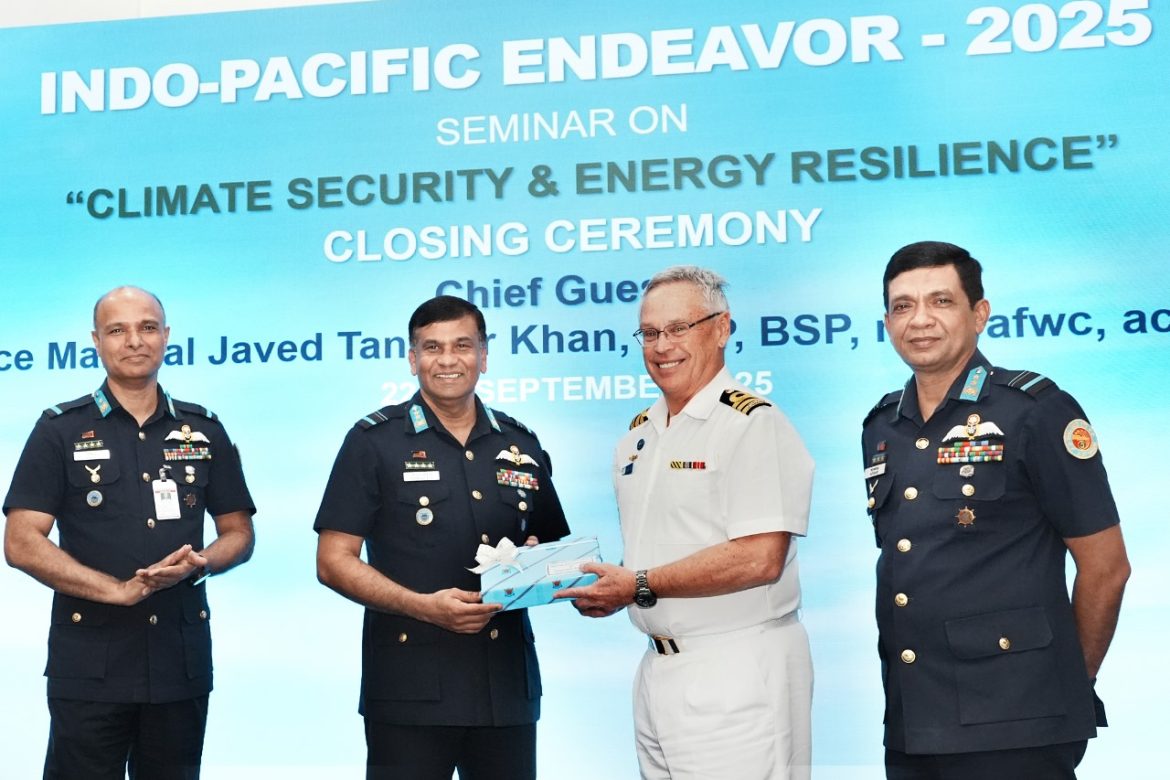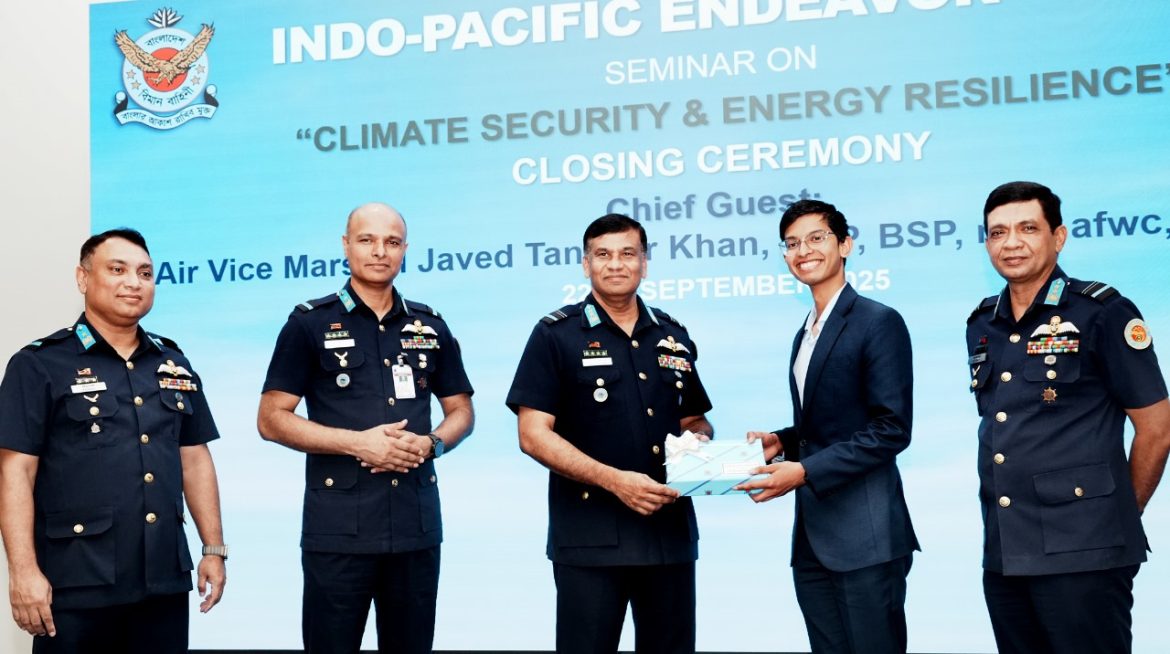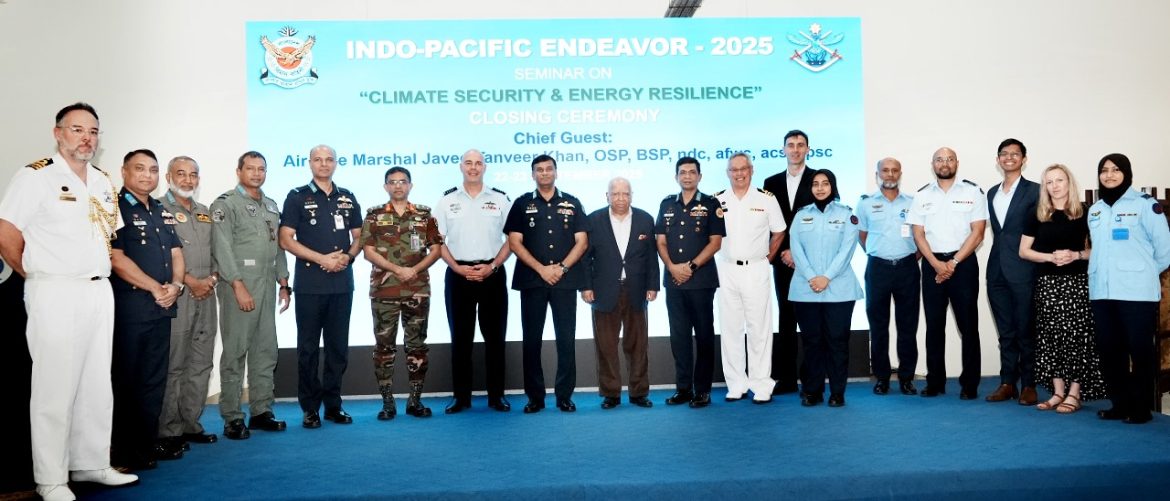 ঢাকা, ২৩ সেপ্টেম্বর : অস্ট্রেলিয়ান ডিফেন্স ফোর্স এবং বাংলাদেশ সশস্ত্র বাহিনীর মধ্যে ইন্দো-প্যাসিফিক এন্ডেভার (IPE)-২০২৫ প্রথম পর্যায়ের যৌথ কার্যক্রমের অংশ হিসেবে বাংলাদেশ বিমান বাহিনীর তত্ত্বাবধানে জলবায়ু নিরাপত্তা ও জ্বালানি স্থিতিস্থাপকতা বিষয়ক সেমিনার ঢাকা কুর্মিটোলাস্থ বিমান বাহিনী ঘাঁটি বীর উত্তম এ কে খন্দকার এ আজ মঙ্গলবার (২৩-৯-২০২৫) সমাপ্ত হয়। সহকারী বিমান বাহিনী প্রধান (পরিচালন) এয়ার ভাইস মার্শাল জাভেদ তানভীর খান, ওএসপি, বিএসপি, এনডিসি, এএফডব্লিউসি, এসিএসসি, পিএসসি (Air Vice Marshal Javed Tanveer Khan) প্রধান অতিথি হিসেবে সমাপনী অনুষ্ঠানে উপস্থিত ছিলেন।এ ছাড়াও উপস্থিত ছিলেন বাংলাদেশ বিমান বাহিনী ঘাঁটি বীর উত্তম এ কে খন্দকার এর এয়ার অধিনায়ক এবং সশস্ত্র বাহিনীর জ্যেষ্ঠ কর্মকর্তাগণ ও বিভিন্ন প্রতিষ্ঠানের ছাত্রছাত্রীবৃন্দ।