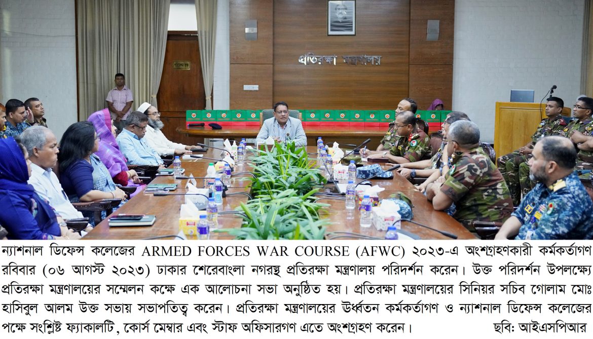 ঢাকা, ০৬ আগস্ট: ন্যাশনাল ডিফেন্স কলেজ (এনডিসি)-এর ARMED FORCES WAR COURSE (AFWC) 2023-এ অংশগ্রহণকারী কর্মকর্তাগণ কোর্সের অংশ হিসেবে ০৬ আগস্ট ২০২৩ তারিখ রবিবার ঢাকার শেরেবাংলা নগরস্থ প্রতিরক্ষা মন্ত্রণালয় পরিদর্শন করেন। উক্ত পরিদর্শন উপলক্ষ্যে প্রতিরক্ষা মন্ত্রণালয়ের সম্মেলন কক্ষে এক আলোচনা সভা অনুষ্ঠিত হয়। প্রতিরক্ষা মন্ত্রণালয়ের সিনিয়র সচিব গোলাম মোঃ হাসিবুল আলম উক্ত সভায় সভাপতিত্ব করেন। প্রতিরক্ষা মন্ত্রণালয়ের ঊর্ধ্বতন কর্মকর্তাগণ ও ন্যাশনাল ডিফেন্স কলেজের পক্ষে সংশ্লিষ্ট ফ্যাকালটি, কোর্স মেম্বার এবং স্টাফ অফিসারগণ এতে অংশগ্রহণ করেন।
