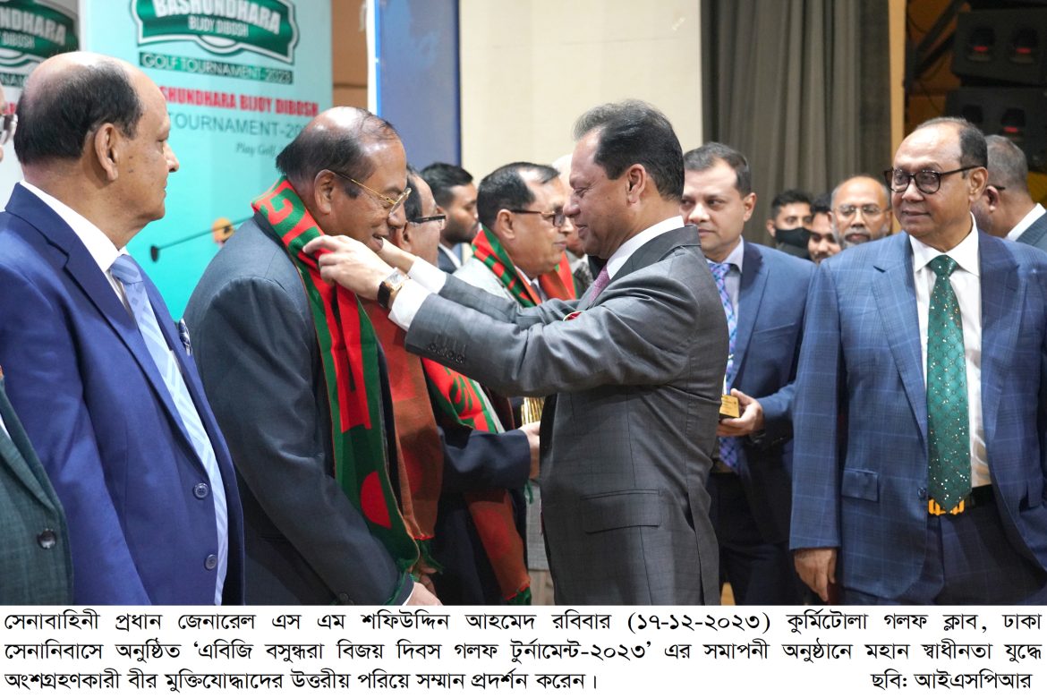ঢাকা, ১৭ ডিসেম্বর ২০২৩ (রবিবার)ঃ তিন দিনব্যাপী ‘এবিজি বসুন্ধরা বিজয় দিবস গলফ টুর্নামেন্ট-২০২৩’ এর পুরস্কার বিতরণী অনুষ্ঠান আজ রবিবার (১৭-১২-২০২৩) কুর্মিটোলা গলফ ক্লাব, ঢাকা সেনানিবাসে অনুষ্ঠিত হয়। অনুষ্ঠানে সেনাবাহিনী প্রধান জেনারেল এস এম শফিউদ্দিন আহমেদ, এসবিপি (বার), ওএসপি, এনডিইউ, পিএসসি, পিএইচডি প্রধান অতিথি হিসেবে উপস্থিত থেকে বিজয়ীদের মাঝে পুরস্কার বিতরণ করেন। উল্লেখ্য, গত ১৪ ডিসেম্বর ২০২৩ তারিখ হতে শুরু হওয়া এই টুর্নামেন্টের উদ্বোধন করেন কুর্মিটোলা গলফ ক্লাবের ভাইস প্রেসিডেন্ট ও সেনাবাহিনীর মাস্টার জেনারেল অব দি অর্ডন্যান্স মেজর জেনারেল মোঃ জহিরুল ইসলাম, এসজিপি, এনডিসি, পিএসসি।