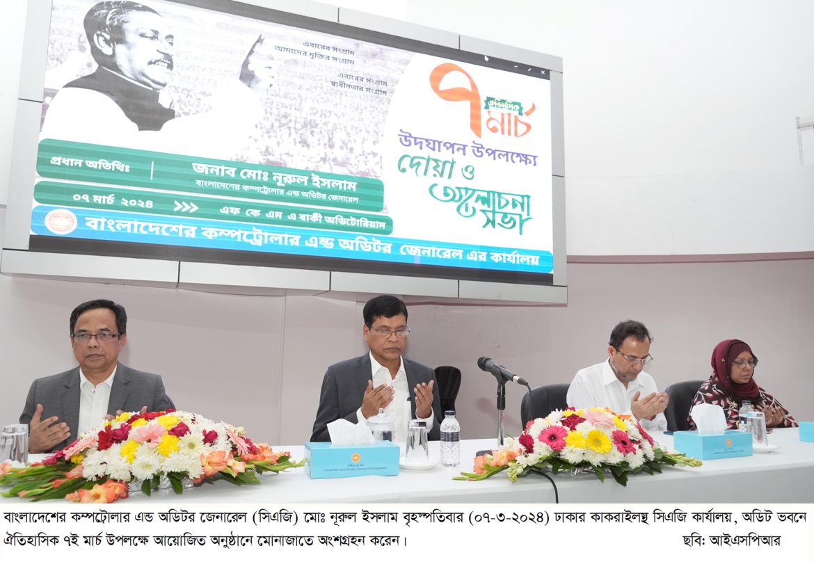 ঢাকা, ৭ মার্চ ২০২৪: বাংলাদেশের কম্পট্রোলার এন্ড অডিটর জেনারেল (সিএজি) এর কার্যালয়ে ঐতিহাসিক ৭ই মার্চ যথাযোগ্য মর্যাদায় পালন করা হয়। দিবসটি উপলক্ষ্যে এক আলোচনা সভা ও দোয়া সিএজি মোঃ নূরুল ইসলাম এর সভাপতিত্বে অনুষ্ঠিত হয়। উক্ত অনুষ্ঠানে কন্ট্রোলার জেনারেল ডিফেন্স ফাইন্যান্স জনাব কামরুন নাহার, সিনিয়র ফাইন্যান্স কন্ট্রোলার (আর্মি) জনাব রেফায়েত উল্লাহ ও হিসাব মহানিয়ন্ত্রক (সিজিএ) জনাব আবুল কালাম আজাদ সহ অডিট এন্ড অ্যাকাউন্টস বিভাগের উর্দ্ধতন কর্মকর্তাগণ উপস্থিত ছিলেন।
