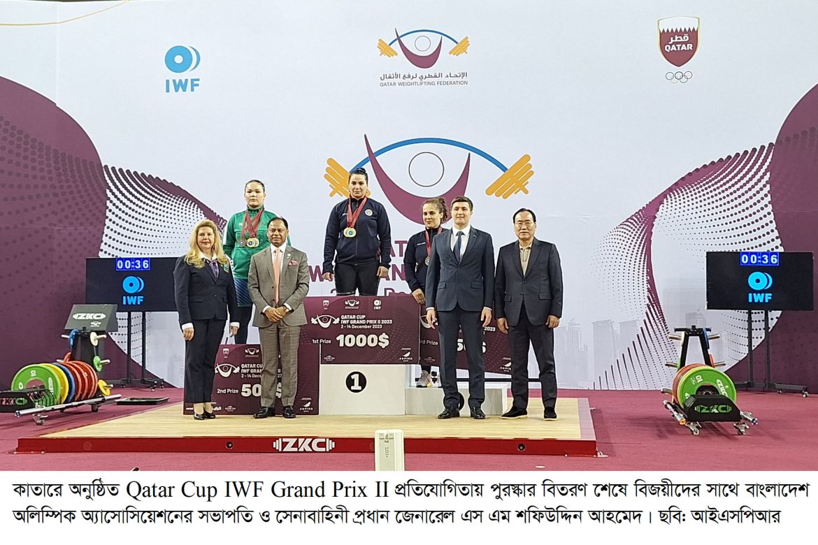 ঢাকা, ১৪ ডিসেম্বর ২০২৩ঃ কাতারে অনুষ্ঠিত ‘আইডব্লিউএফ-গ্র্যান্ড প্রিক্স-২’ বুধবার (১৩-১২-২০২৩) অবলোকন এবং পুরস্কার বিতরণ করেন বাংলাদেশ অলিম্পিক অ্যাসোসিয়েশন এর সভাপতি ও সেনাবাহিনী প্রধান জেনারেল এস এম শফিউদ্দিন আহমেদ। প্রতিযোগিতা শেষে খেলোয়াড় ও টুর্নামেন্টে অংশগ্রহণকারী প্রতিনিধিদের সম্মাননা প্রদান অনুষ্ঠিত হয়। অনুষ্ঠানে কাতার অলিম্পিক কমিটির ফার্স্ট ভাইস প্রেসিডেন্ট এবং কাতার ভারোত্তলন ফেডারেশন এর প্রেসিডেন্ট মোহাম্মেদ ইউসেফ আলমানা, কাতারি ও আরব এশিয়ান ভারোত্তলন ফেডারেশনের সভাপতি নায়েফ সালেহ আল বাকরি, ইয়েমেনের মাননীয় যুব ও ক্রীড়া মন্ত্রী খালেদ আল এবং ইয়েমেনি অলিম্পিক কমিটির প্রথম ভাইস প্রেসিডেন্ট নাসের আবদুল্লাহ আল হাজরি উপস্থিত ছিলেন।