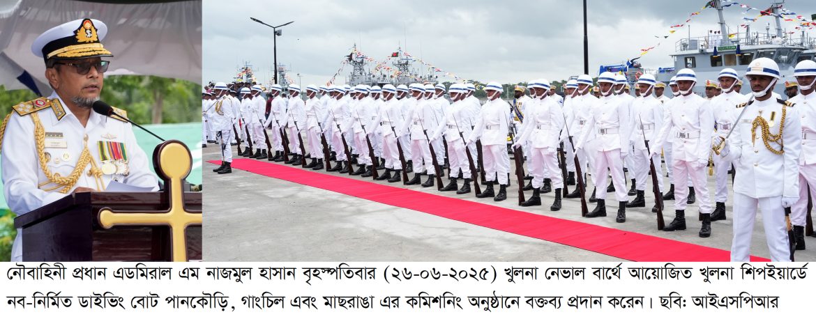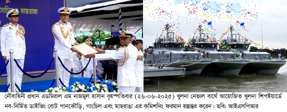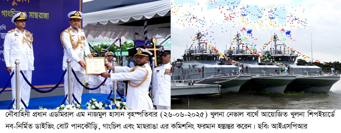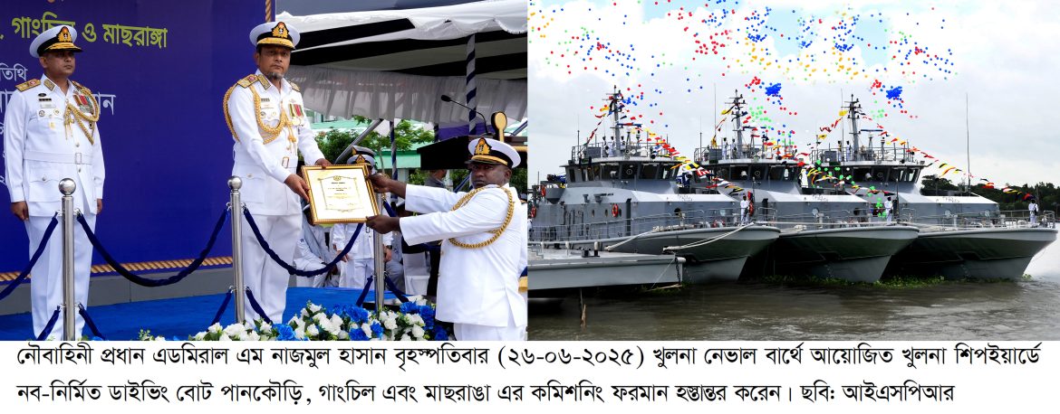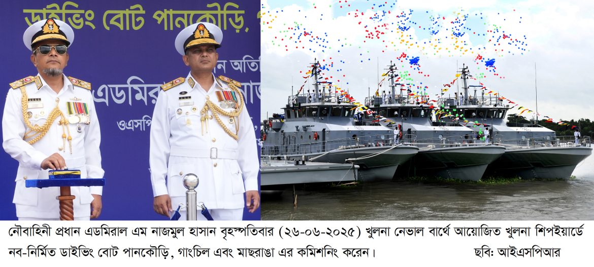 খুলনা, ২৬ জুন ২০২৫ঃ বাংলাদেশ নৌবাহিনীর আধুনিকায়ন ও ত্রিমাত্রিক সক্ষমতা বৃদ্ধির অংশ হিসেবে দেশীয় প্রযুক্তিতে নির্মিত ০৩টি ডাইভিং বোট পানকৌড়ি, গাংচিল এবং মাছরাঙ্গা বাংলাদেশ নৌবাহিনীর বহরে যুক্ত হলো। আজ বৃহস্পতিবার (২৬-০৬-২০২৫) খুলনা নেভাল বার্থে আয়োজিত কমিশনিং অনুষ্ঠানে মাননীয় নৌবাহিনী প্রধান এডমিরাল এম নাজমুল হাসান প্রধান অতিথি হিসেবে উপস্থিত থেকে বোটসমূহের অধিনায়কগণের নিকট কমিশনিং ফরমান তুলে দেন এবং নৌবাহিনীর রীতি অনুযায়ী আনুষ্ঠানিকভাবে নামফলক উন্মোচন করেন। এ সময় সামরিক ও অসামরিক উচ্চপদস্থ কর্মকর্তাগণ, বীর মুক্তিযোদ্ধা, জাহাজের কর্মকর্তা ও নাবিকবৃন্দ এবং আমন্ত্রিত অতিথিবৃন্দ উপস্থিত ছিলেন।