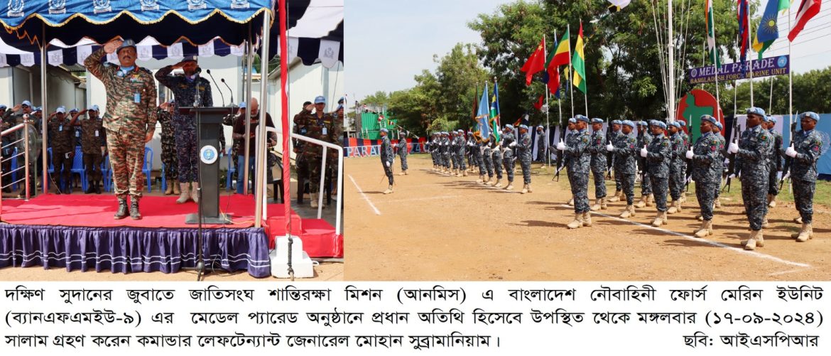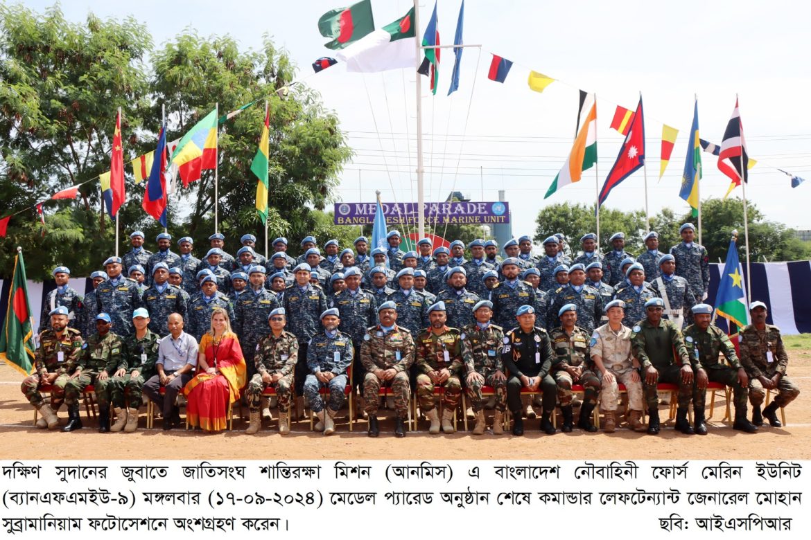 ঢাকা, ১৮ সেপ্টেম্বর ২০২৪ ঃ দক্ষিণ সুদানের জুবাতে জাতিসংঘ শান্তিরক্ষা মিশনে নিয়োজিত বাংলাদেশ নৌবাহিনী ফোর্স মেরিন ইউনিট (ব্যানএফএমইউ-৯) এর ২০০ জন সদস্য জাতিসংঘ শান্তিরক্ষা পদকে ভূষিত হয়েছেন। এ উপলক্ষ্যে মঙ্গলবার (১৭-০৯-২০২৪) দক্ষিণ সুদানের জুবাতে ব্যানএফএমইউ-৯ কন্টিনজেন্ট এর মেডেল প্যারেড অনুষ্ঠিত হয়। উক্ত অনুষ্ঠানে ইউনাইটেড নেশন্স মিশন ইন সাউথ সুদান (আনমিস) এর ফোর্স কমান্ডার লেফটেন্যান্ট জেনারেল মোহান সুব্রামানিয়াম প্রধান অতিথি হিসেবে উপস্থিত থেকে শান্তিরক্ষা কার্যক্রমে অসামান্য অবদানের স্বীকৃতি স্বরূপ নৌবাহিনীর কর্মকর্তা ও নাবিকসহ ২০০ জন নৌ সদস্যকে জাতিসংঘ শান্তিরক্ষা মেডেল প্রদান করেন। উক্ত অনুষ্ঠানে আনমিস ফোর্স হেডকোয়ার্টারের কর্মকর্তাগণসহ অন্যান্য ঊর্ধ্বতন কর্মকর্তা ও সংশ্লিষ্ট ব্যক্তিবর্গ উপস্থিত ছিলেন।
