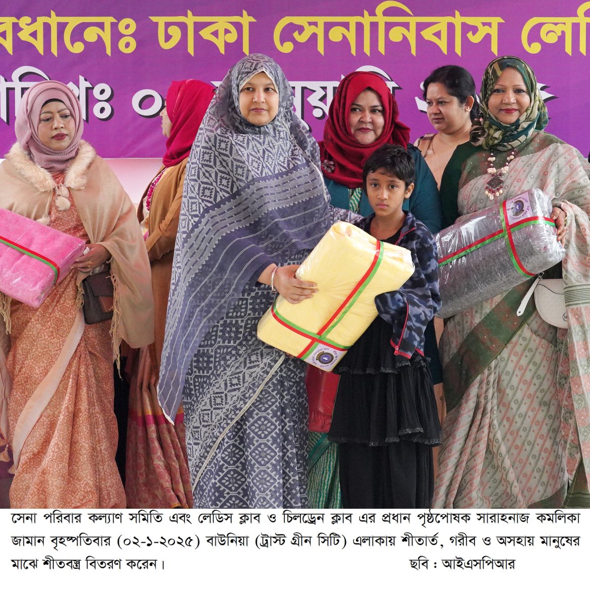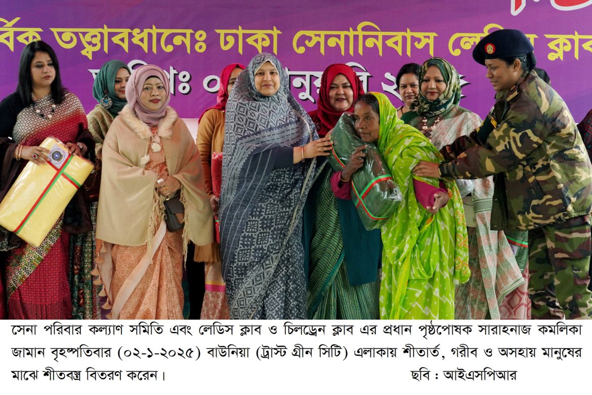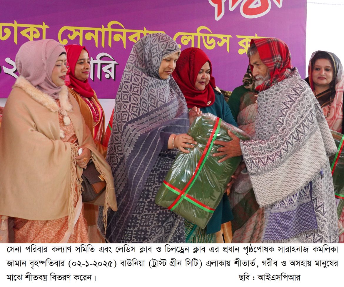 ঢাকা, ০২ জানুয়ারি ২০২৫: সদর দপ্তর লজিস্টিকস্ এরিয়া এর সার্বিক তত্ত্বাবধানে ঢাকা সেনানিবাস লেডিস ক্লাব এর প্রধান পৃষ্ঠপোষক সারাহনাজ কমলিকা জামান আজ বৃহস্পতিবার (০২-১-২০২৫) বাউনিয়া এলাকায় প্রধান অতিথি হিসেবে উপস্থিত থেকে সমাজের দরিদ্র ও শীতার্ত ২২০০টি পরিবারের মাঝে শীতবস্ত্র বিতরণ করেন। প্রধান অতিথি ঢাকা সেনানিবাস লেডিস ক্লাবের এই মানবিক কার্যক্রম অব্যাহত থাকবে বলে আশাবাদ ব্যক্ত করেন। এছাড়াও, এ ধরণের মানবিক কার্যক্রমে সহযোগিতা প্রদানের জন্য ঢাকা সেনানিবাস লেডিস ক্লাবের সকল সদস্যদের তিনি আন্তরিক ধন্যবাদ জ্ঞাপন করেন।
