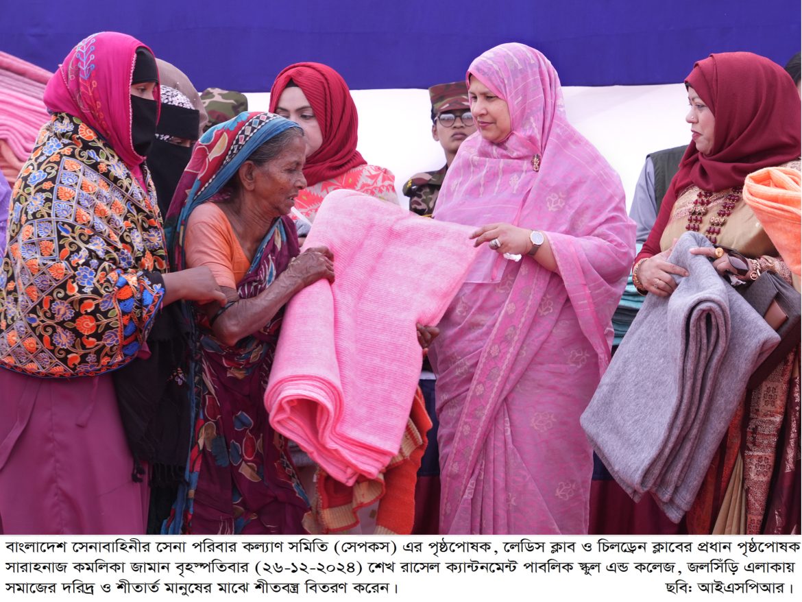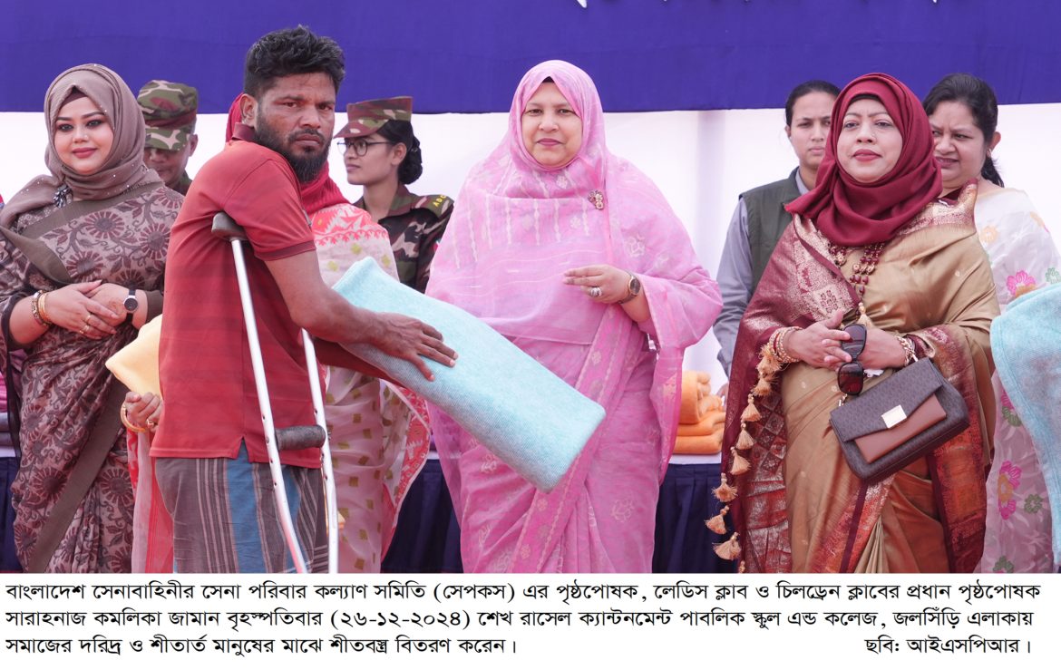 ঢাকা, ২৬ ডিসেম্বর ২০২৪: বাংলাদেশ সেনাবাহিনীর সেনা পরিবার কল্যাণ সমিতি (সেপকস) এর পৃষ্ঠপোষক, লেডিস ক্লাব ও চিলড্রেন ক্লাবের প্রধান পৃষ্ঠপোষক সারাহনাজ কমলিকা জামান বৃহস্পতিবার (২৬-১২-২০২৪) শেখ রাসেল ক্যান্টনমেন্ট পাবলিক স্কুল এন্ড কলেজ, জলসিঁড়ি এলাকায় প্রধান অতিথি হিসেবে উপস্থিত থেকে সমাজের দরিদ্র ও শীতার্ত মানুষের মাঝে শীতবস্ত্র বিতরণ করেন। উক্ত অনুষ্ঠানে প্রধান অতিথি সেপকস এর এই মানবিক কার্যক্রম অব্যাহত থাকবে বলে আশাবাদ ব্যক্ত করেন। এছাড়াও, এ ধরণের মানবিক কার্যক্রমে সহযোগিতা প্রদানের জন্য সেপকস এর সকল সদস্যদের আন্তরিক ধন্যবাদ জ্ঞাপন করেন।