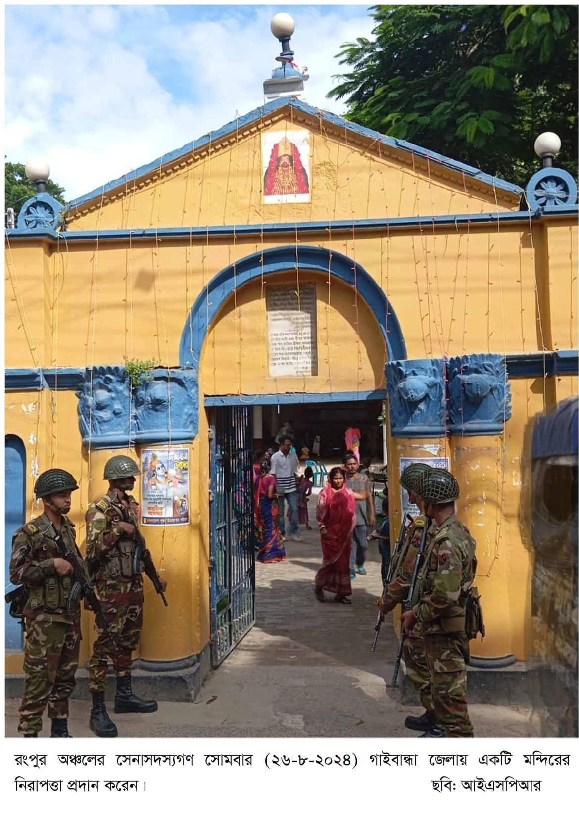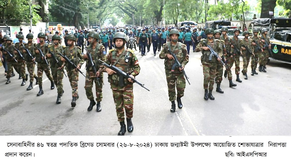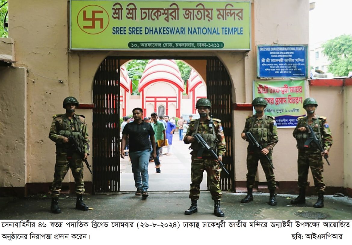 ঢাকা (২৬ আগস্ট ২০২৪,সোমবার) : আজ ২৬ আগস্ট ২০২৪ দেশ জুড়ে পালিত হচ্ছে সনাতন ধর্মাবলম্বীদের অন্যতম প্রধান উৎসব শ্রীকৃষ্ণের জন্মাষ্টমী। দিনটিকে কেন্দ্র করে আয়োজিত বিবিধ অনুষ্ঠান ও উপাসনালয় সমূহের বিশেষ নিরাপত্তায় অন্যান্য আইন-শৃঙ্খলা রক্ষাকারী বাহিনীর পাশাপাশি নিয়োজিত রয়েছে বাংলাদেশ সেনাবাহিনী। সেনাবাহিনীর এ তৎপরতাকে সাধুবাদ জানিয়েছেন সনাতন ধর্মাবলম্বী জনগণ।