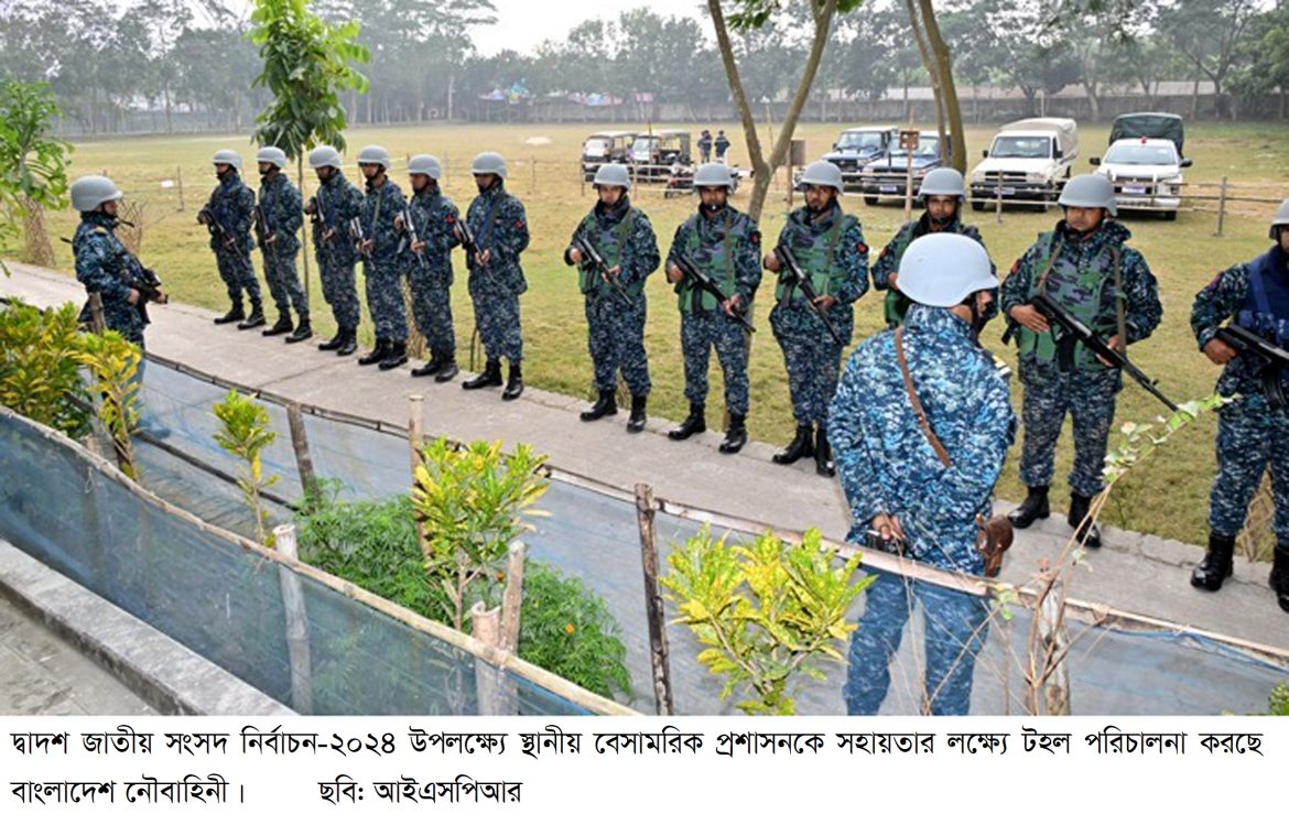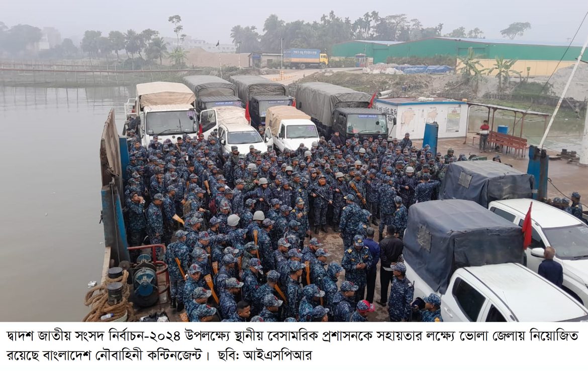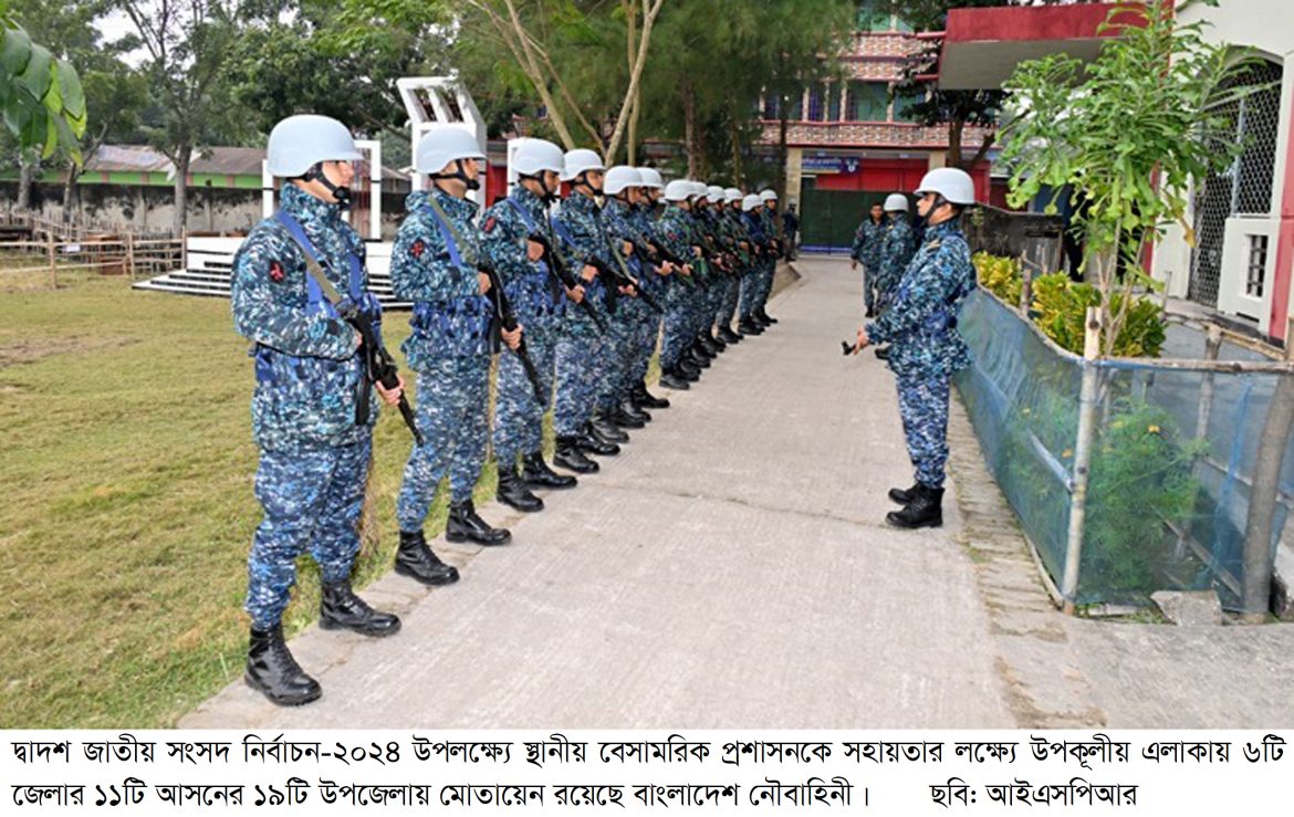 ঢাকা, ০৩ জানুয়ারি ২০২৪ঃ আসন্ন দ্বাদশ জাতীয় সংসদ নির্বাচন-২০২৪ উপলক্ষ্যে স্থানীয় বেসামরিক প্রশাসনকে সহায়তার লক্ষ্যে গণপ্রজাতন্ত্রী বাংলাদেশের সংবিধানের ১২৬ অনুচ্ছেদ অনুসারে ‘In Aid to the Civil Power’’ এর আওতায় বাংলাদেশ নৌবাহিনীকে উপক‚লীয় এলাকার ০৬টি জেলার ১১টি আসনে মোতায়েন করা হয়েছে। সংসদীয় আসনসমূহ হলো- ভোলা ১, ২, ৩ ও ৪, কক্সবাজার ২ ও ৪, চট্টগ্রাম ৩, নোয়াখালী ৬, বরগুনা ১ ও ২ এবং বাগেরহাট-৩। নির্বাচন উপলক্ষ্যে স্থানীয় বেসামরিক প্রশাসনকে সহায়তাষ জন্য বাংলাদেশ নৌবাহিনীর তিন হাজারের বেশি নৌ সদস্য এবং ৬টি যুদ্ধজাহাজ ১৯টি উপজেলায় ১০ জানুয়ারি ২০২৪ পর্যন্ত দায়িত্ব পালনের লক্ষ্যে মোতায়েন করা হয়েছে।
