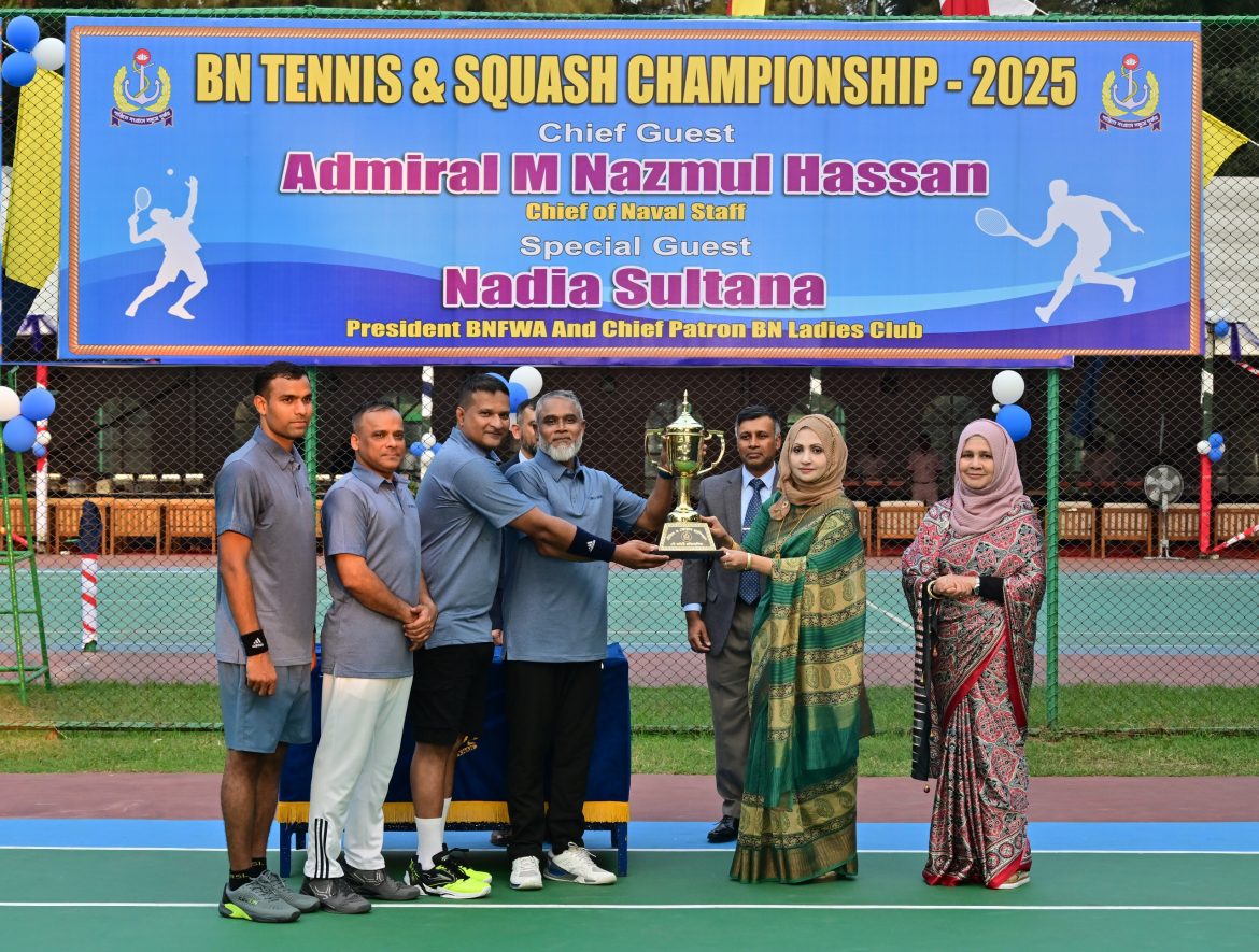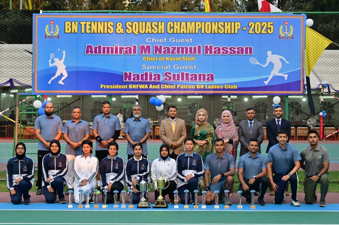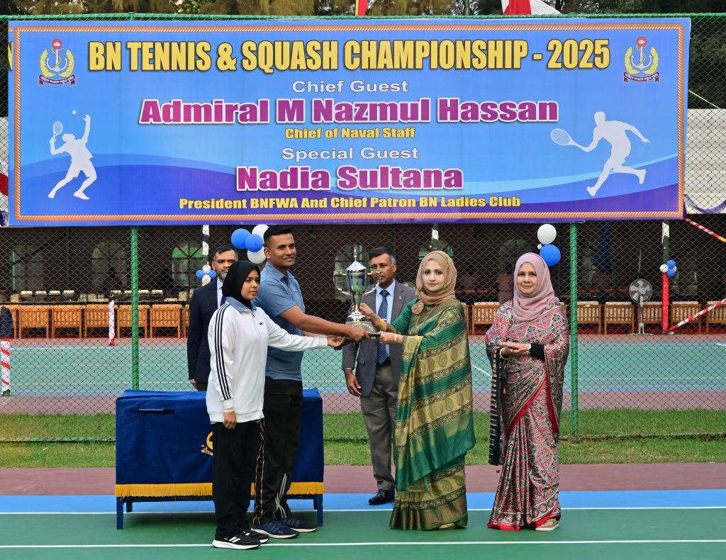 চট্টগ্রাম, ২৪ ডিসেম্বর ২০২৫ঃ বাংলাদেশ নৌবাহিনীর বাৎসরিক ‘টেনিস ও স্কোয়াশ প্রতিযোগিতা-২০২৫’ এর সমাপনী অনুষ্ঠান আজ বুধবার (২৪-১২-২০২৫) চট্টগ্রামের ‘এরিয়া টেনিস এন্ড স্কোয়াশ কমপ্লেক্স’-এ অনুষ্ঠিত হয়েছে। প্রতিযোগিতার সমাপনী দিনে মাননীয় নৌবাহিনী প্রধান এডমিরাল এম নাজমুল হাসান প্রধান অতিথি এবং বাংলাদেশ নৌবাহিনী পরিবার কল্যাণ সংঘের প্রেসিডেন্ট নাদিয়া সুলতানা বিশেষ অতিথি হিসেবে উপস্থিত থেকে খেলা উপভোগ করেন এবং বিজয়ীদের হাতে পুরস্কার তুলে দেন।