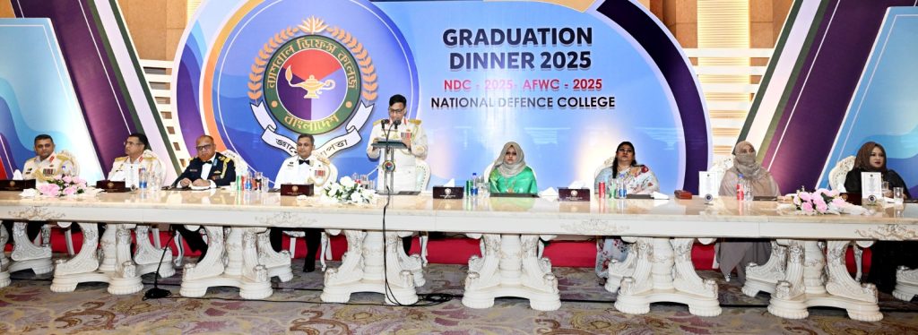 ঢাকা, ২৬ নভেম্বর ২০২৫ ঃ ন্যাশনাল ডিফেন্স কোর্স ২০২৫ ও আর্মড ফোর্সেস ওয়ার কোর্স ২০২৫ এর গ্র্যাজুয়েশন নৈশভোজ মঙ্গলবার (২৫-১১-২০২৫) ঢাকা সেনানিবাসস্থ আর্মি মাল্টিপারপাস কমপ্লেক্স ব্যাংকুয়েট হলে অনুষ্ঠিত হয়। ন্যাশনাল ডিফেন্স কলেজের কমান্ড্যান্ট লেফটেন্যান্ট জেনারেল মোহাম্মদ শাহীনুল হক, ওএসপি, বিএসপি, এনডিসি, এইচডিএমসি, পিএসসি প্রধান অতিথি হিসেবে নৈশভোজে উপস্থিত ছিলেন।