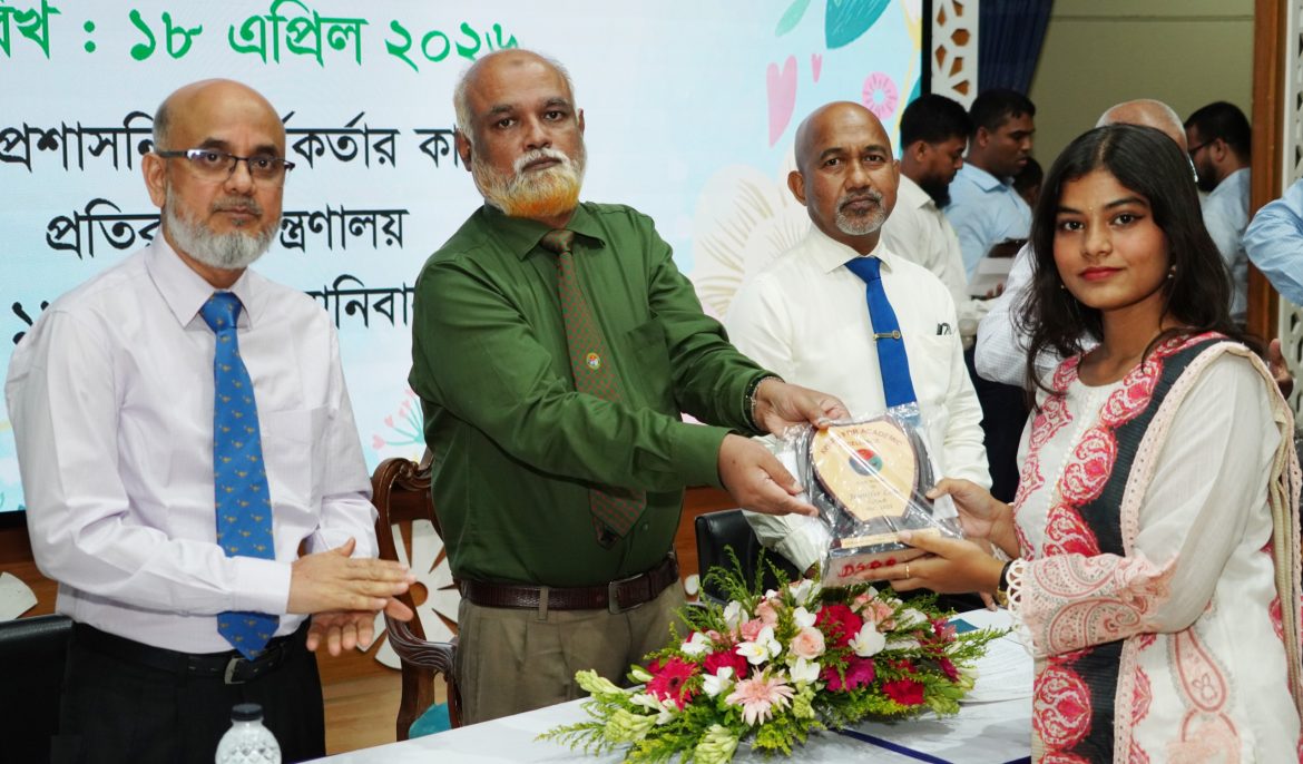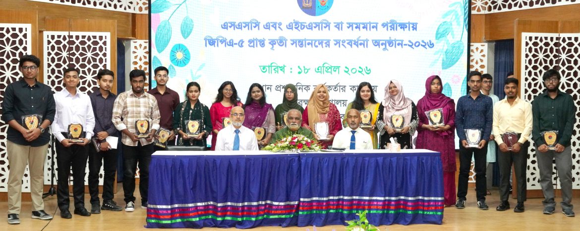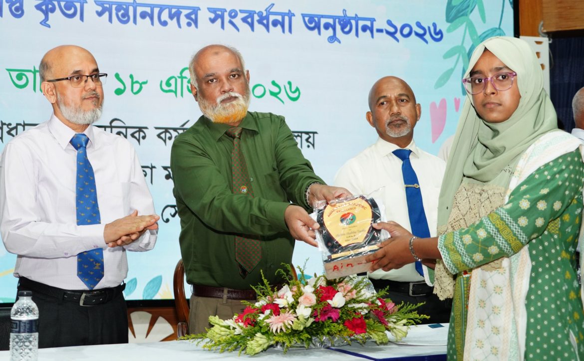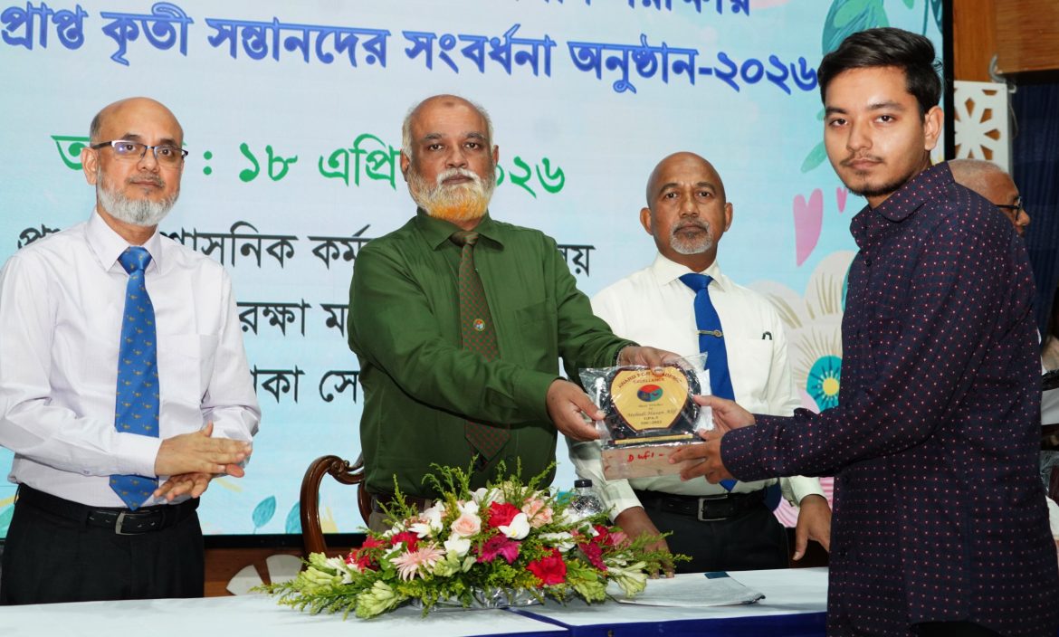 ঢাকা, ১৮ এপ্রিল ২০২৬: প্রতিরক্ষা মন্ত্রণালয়ের ঢাকা সেনানিবাসস্থ প্রধান প্রশাসনিক কর্মকর্তার কার্যালয়ের উদ্যোগে প্রশাসনিক আওতাধীন বাহিনী সদর দপ্তর ও আন্তঃবাহিনী সংস্থাসমূহে কর্মরত বেসামরিক কর্মকর্তা ও কর্মচারীগণের সন্তানদের মধ্যে এসএসসি, এইচএসসি বা সমমান পরীক্ষায় জিপিএ-৫ প্রাপ্ত কৃতী সন্তানদেরকে ঢাকা সেনানিবাসস্থ শহিদ বীর উত্তম লে: আনোয়ার গার্লস কলেজ অডিটোরিয়ামে সংবর্ধনা ও পুরস্কার প্রদান করা হয়।