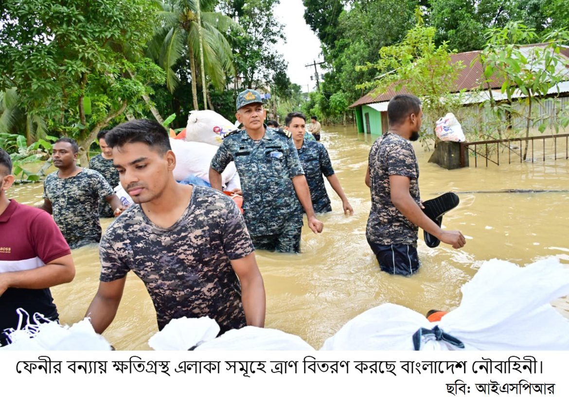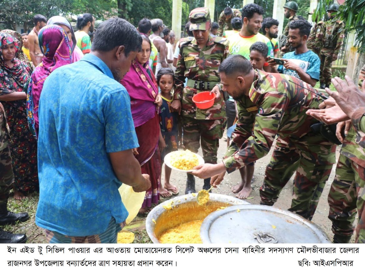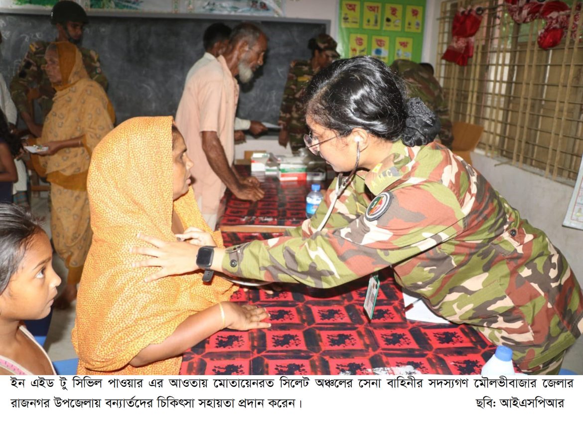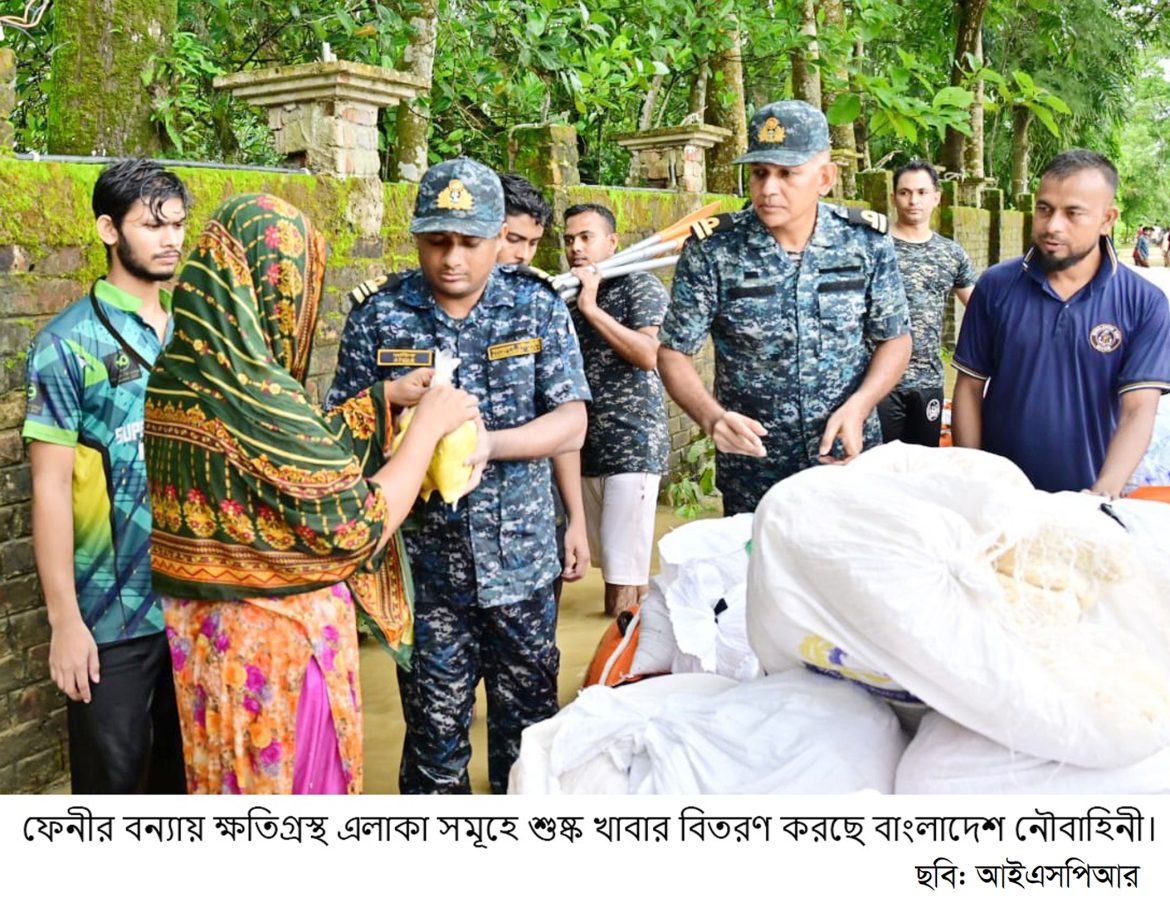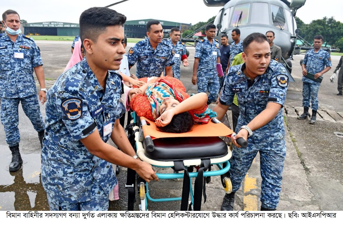 বন্যা পরিস্থিতি মোকাবিলায় গতকাল (২৫ আগস্ট ২০২৪) বাংলাদেশ সেনাবাহিনী জল, স্থল ও আকাশ পথে উদ্ধার অভিযান ও ত্রাণ বিতরণ কার্যক্রম পরিচালনা করে। মানবতার সেবায় পরিচালিত এই অভিযানকে ত্বরান্বিত করার লক্ষ্যে সেনাবাহিনীর আর্মি এভিয়েশন গ্রæপ ২১টি হেলিকপ্টার সর্টির মাধ্যমে উদ্ধার ও ত্রাণ বিতরণ কার্যক্রম পরিচালনা করে। উল্লেখ্য, হেলিকপ্টারের মাধ্যমে ১৬ জন মুমূর্ষ রোগীকে দুর্যোগপূর্ণ এলাকা হতে উদ্ধারপূর্বক হাসপাতালে স্থানান্তর করা হয়েছে। যাদের মধ্যে ৩ জন শিশু, ৬ জন অন্তঃসত্ত¡া নারী, ২ জন পক্ষাঘাতগ্রস্ত রোগী ও ৫ জন বার্ধক্য জনিত রোগে আক্রান্ত ব্যক্তি রয়েছেন। দুর্যোগপূর্ণ আবহাওয়া সত্তে¡ও ২,১৪৭ প্যাকেট ত্রাণ ফেনী সদর, ফাজিলপুর, ছাগলনাইয়া, সোনাগাজী, পরশুরাম ও মধুগ্রাম এলাকায় সেনাবাহিনীর হেলিকপ্টার এর মাধ্যমে বিতরণ করা হয়েছে। এছাড়া বন্যা কবলতি পাইকগাছার দুর্গত মানুষের সেবায় কাজ করে যাচ্ছে বাংলাদশে নৌবাহিনী। একইসাথে বাংলাদেশ বিমান বাহিনী অব্যাহতভাবে বন্যা দুর্গত এলাকায় উদ্ধার ও ত্রাণ কার্যক্রম চলমান রেখেছে। দুর্যোগপূর্ণ পরিস্থিতি মোকাবিলায় সশস্ত্র বাহিনীর এ কার্যক্রম চলমান থাকবে।