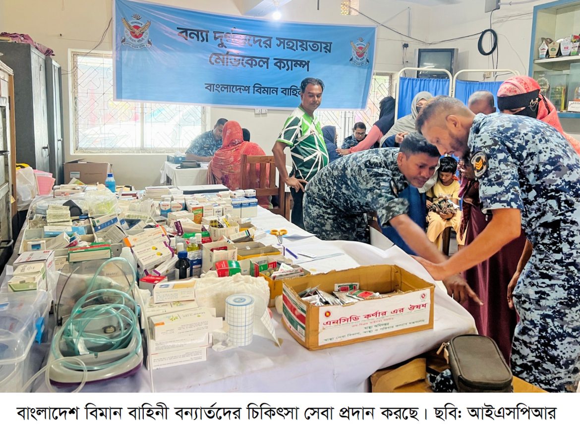 ঢাকা, ৩০ আগস্ট ২০২৪ (শুক্রবার)ঃ সশস্ত্র বাহিনী অব্যাহতভাবে বন্যা পরিস্থিতির উন্নতির জন্য কাজ করে যাচ্ছে এবং বন্যা দুর্গত এলাকায় সব ধরণের সহযোগিতা ও সেবা প্রদান অব্যাহত রেখেছে। বন্যা পরিস্থিতি মোকাবেলায় উদ্ধার, ত্রাণ কার্যক্রম ও চিকিৎসা সেবা প্রদানে বাংলাদেশ সশস্ত্র বাহিনীর বর্তমানে ৩৪টি ক্যাম্প, ২,৮৮১ জন সদস্য, ১০০টি বোট ও ১০টি হেলিকপ্টার মোতায়েন রয়েছে। জরুরি চিকিৎসা সেবা প্রদানের জন্য সশস্ত্র বাহিনীর মেডিকেল টিম বিভিন্ন স্থানে অস্থায়ী ক্যাম্প স্থাপন করেছে এবং বন্যা দুর্গত মানুষের জন্য প্রাথমিক চিকিৎসা, ঔষধ ও স্বাস্থ্যসেবা প্রদান করা হচ্ছে। এর অংশ হিসেবে বিশেষজ্ঞ ডাক্তারের সমন্বয়ে অস্থায়ী মেডিকেল টিমের মাধ্যমে আজ সর্বমোট ৫,১৮১ জনকে চিকিৎসা সহায়তা প্রদান করা হয়েছে। পাশাপাশি গত ২৪ ঘন্টায় (৩০ আগস্ট ২০২৪) সশস্ত্র বাহিনী কর্তৃক সর্বমোট ৫০ জন বন্যা দুর্গত ব্যক্তিকে উদ্ধার, ৪১,৯৫৩ প্যাকেট খাদ্য সামগ্রী এবং ১,১৫০ জনকে রান্না করা খাবার বন্যার্তদের মাঝে বিতরণ করা হয়েছে। এ সময় সশস্ত্র বাহিনী ১৬টি হেলিকপ্টার সর্টির মাধ্যমে বন্যা কবলিত এলাকায় উদ্ধার ও ত্রাণ বিতরণ কার্যক্রম পরিচালনা করেছে।