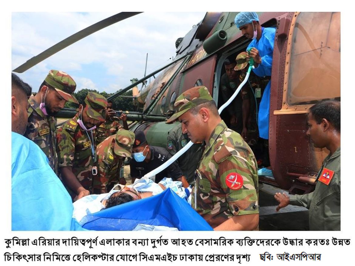 উল্লেখ্য, এ পর্যন্ত (৩০ আগস্ট ২০২৪) সশস্ত্র বাহিনী কর্তৃক প্রায় ৪২,৮১৬ জন বন্যা দুর্গত ব্যক্তিকে উদ্ধার, প্রায় ২,৩৬,২৩৮ প্যাকেট খাদ্য সামগ্রী ও প্রায় ২০,৪১০ জনকে রান্না করা খাবার বন্যার্তদের মাঝে বিতরণ এবং ২৩,৫৭০ জনকে চিকিৎসা সেবা প্রদান করা হয়েছে। বন্যা পরিস্থিতির উন্নতির জন্য সশস্ত্র বাহিনীর এ কার্যক্রম চলমান থাকবে।
