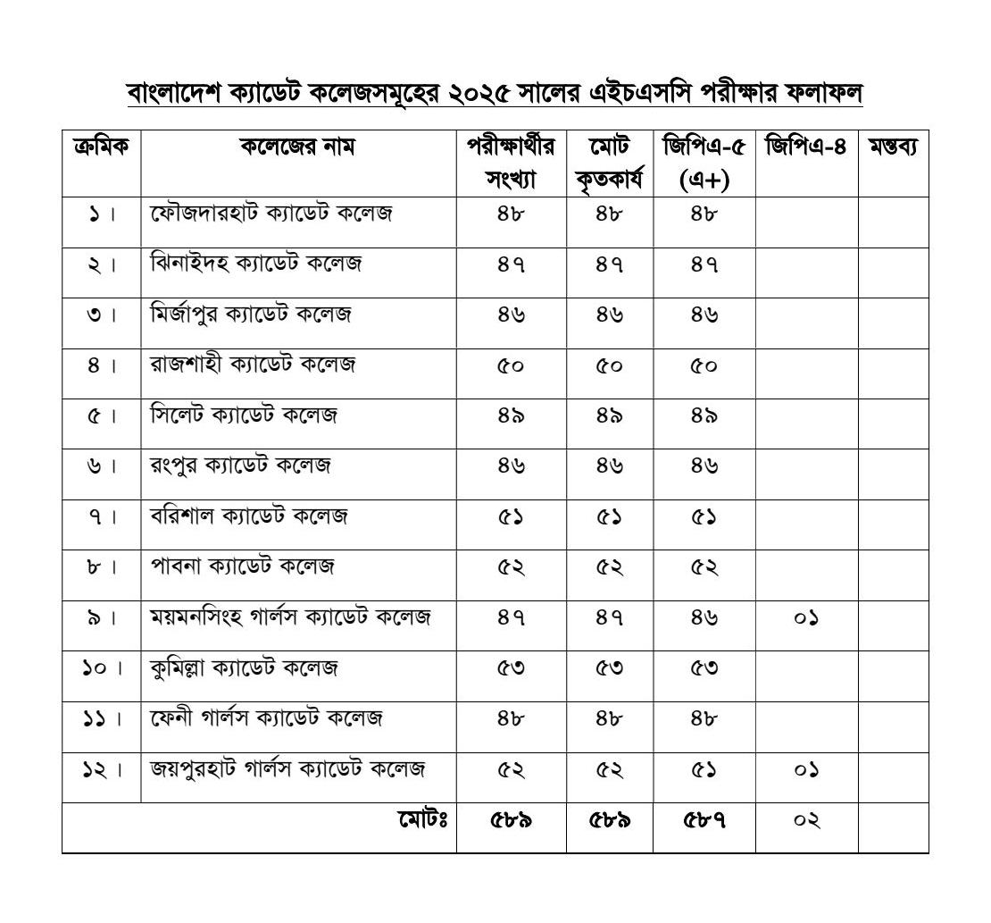 ঢাকা, ১৬ অক্টোবর ২০২৫ (বৃহস্পতিবার): বাংলাদেশের ক্যাডেট কলেজসমূহ ২০২৫ সালের এইচএসসি পরীক্ষায় ঈর্ষণীয় ফলাফল অর্জন করেছে। এবারের পরীক্ষায় ১২টি ক্যাডেট কলেজ হতে সর্বমোট ৫৮৯ জন পরীক্ষার্থীর মধ্যে ৫৮৭ জন জিপিএ-৫ পেয়েছে, পাশের হার শতভাগ এবং জিপিএ-৫ প্রাপ্ত ৯৯.৬৬%। বিগত ২০২৪ সালেও এইচএসসি পরীক্ষায় ১২টি ক্যাডেট কলেজের জিপিএ-৫ প্রাপ্তির হার ছিল ৯৯.৬৬%।