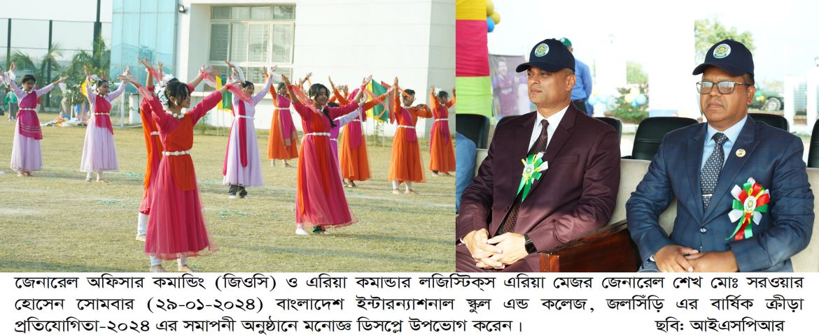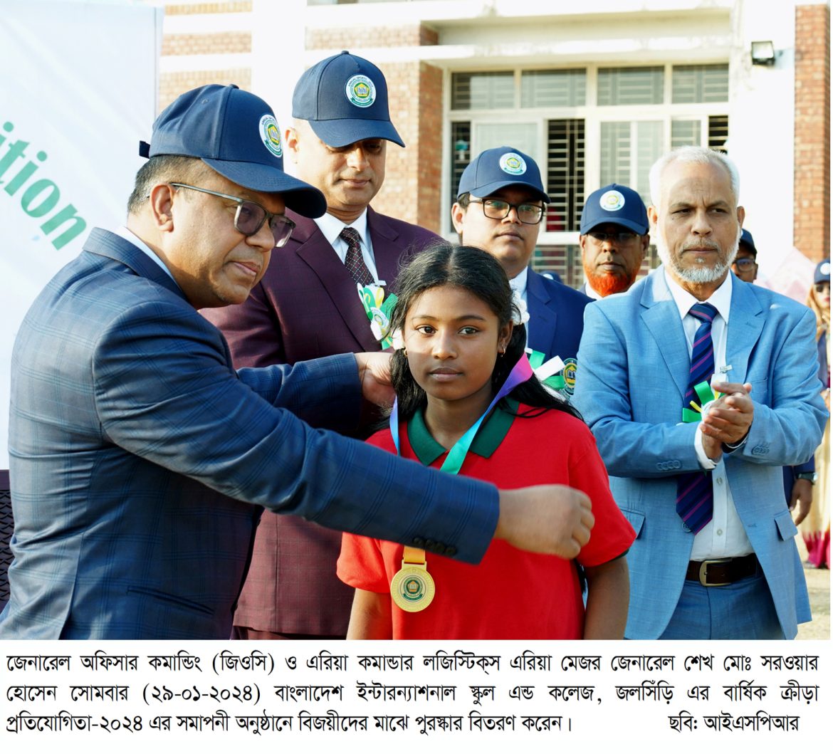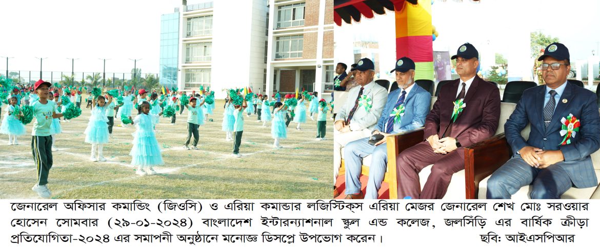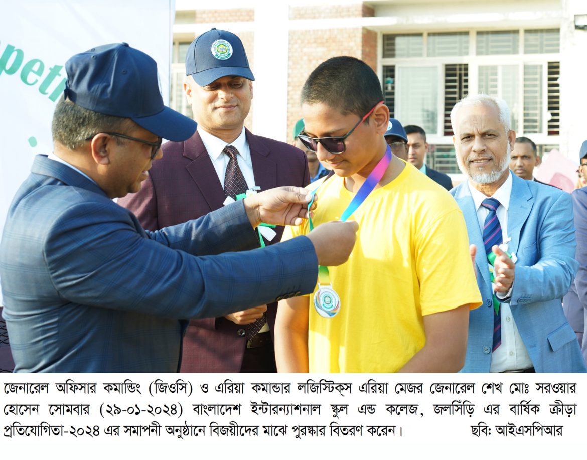 ঢাকা, ২৯ জানুয়ারি ২০২৪ঃ বাংলাদেশ ইন্টারন্যাশনাল স্কুল এন্ড কলেজ, জলসিঁড়ি এর বার্ষিক ক্রীড়া প্রতিযোগিতা-২০২৪ আজ সোমবার (২৯ জানুয়ারি ২০২৪) অনুষ্ঠিত হয়। উক্ত অনুষ্ঠানে প্রধান অতিথি হিসেবে উপস্থিত ছিলেন জেনারেল অফিসার কমান্ডিং (জিওসি) ও এরিয়া কমান্ডার লজিস্টিক্স এরিয়া মেজর জেনারেল শেখ মোঃ সরওয়ার হোসেন, এসইউপি, এনডিসি, পিএসসি।