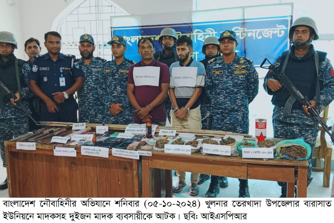 ঢাকা ০৫ অক্টোবর ২০২৪: ‘ইন এইড টু সিভিল পাওয়ার’ এর আওতায় নিয়োজিত বাংলাদেশ নৌবাহিনী অবৈধ অস্ত্র উদ্ধার ও মাদক প্রতিহত করতে নিজ দায়িত্বপ্রাপ্ত এলাকাসমূহে নিয়মিত অভিযান পরিচালনা করে আসছে। এরই ধারাবাহিকতায় গোয়েন্দা তথ্যের ভিত্তিতে লেঃ কমান্ডার হাসিব এর নেতৃত্বে আজ শনিবার (০৫-১০-২০২৪) ভোর রাতে খুলনার তেরখাদা উপজেলার বারাসাত ইউনিয়নের কাটেঙ্গা এলাকা থেকে মোঃ মেজবা উদ্দিন এবং মোঃ বাহারুল শিকদারসহ দুইজন মাদক ব্যবসায়ীকে ইয়াবা, ২ কেজি ২০০ গ্রাম গাঁজা, দেশীয় মদ, দেশীয় অস্ত্র (০৯ টি রামদা, চাকু ০১টি, বল্লম ০৮টি), নগদ ৩৫,৬৯০ টাকা এবং ১১টি মোবাইল ফোনসহ আটক করা হয়। এদের নামে তেরখাদা থানায় একাধিক মাদক মামলা রয়েছে বলে জানা যায়। পরবর্তীতে উদ্ধারকৃত টাকা, গাঁজা, মোবাইল ও দেশীয় অস্ত্রসহ দুইজনকে তেরখাদা থানায় হস্তান্তর করা হয়েছে। এ সময় পুলিশ ও মাদকদ্রব্য নিয়ন্ত্রণ অধিদপ্তর এর প্রতিনিধি উপস্থিত ছিলেন।