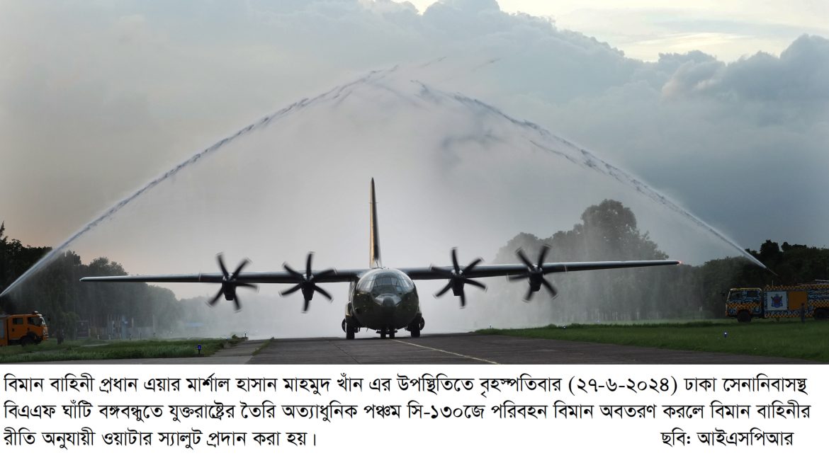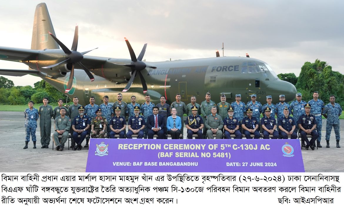 ঢাকা, ২৭ জুন ২০২৪ঃ- গণপ্রজাতন্ত্রী বাংলাদেশ সরকারের মাননীয় প্রধানমন্ত্রী শেখ হাসিনার দিক নির্দেশনা ও ঐকান্তিক প্রচেষ্টায় বর্তমান সরকার বাংলাদেশ বিমান বাহিনীর আধুনিকায়নে অত্যন্ত সচেষ্ট। তারই ধারাবাহিকতায়, যুক্তরাষ্ট্রের তৈরী ০৫টি অত্যাধুনিক সি-১৩০জে পরিবহন বিমান যুক্তরাজ্যের রয়েল এয়ার ফোর্সের সাথে সরাসরি ক্রয় চুক্তি এবং মার্শাল এরোস্পেস এন্ড ডিফেন্স গ্রæপ এর সাথে রক্ষণাবেক্ষণ চুক্তির মাধ্যমে বিমান বাহিনীতে সংযোজনের কার্যক্রম চলমান রয়েছে। উক্ত বিমানগুলোর মধ্যে পঞ্চম সি-১৩০জে বিমানটি যুক্তরাজ্য হতে বাংলাদেশ বিমান বাহিনীর নিজস্ব বৈমানিক কর্তৃক সফল ফেরী মিশনের মাধ্যমে ২৭ জুন ২০২৪, বৃহস্পতিবার সন্ধ্যা ৬টা ০৭ মিনিটে বাংলাদেশ বিমান বাহিনী ঘাঁটি বঙ্গবন্ধুতে অবতরণ করে। এই মিশনের নেতৃত্বে ছিলেন বাংলাদেশ বিমান বাহিনীর এয়ার কমডোর সৈয়দ ফকরুদ্দিন মাসুদ, বিএসপি, এনডিসি, পিএসসি। যাত্রাপথে বিমানটি আনতালিয়া (তুরস্ক) ও মাসকাট (ওমান) এ যাত্রাবিরতি করে।