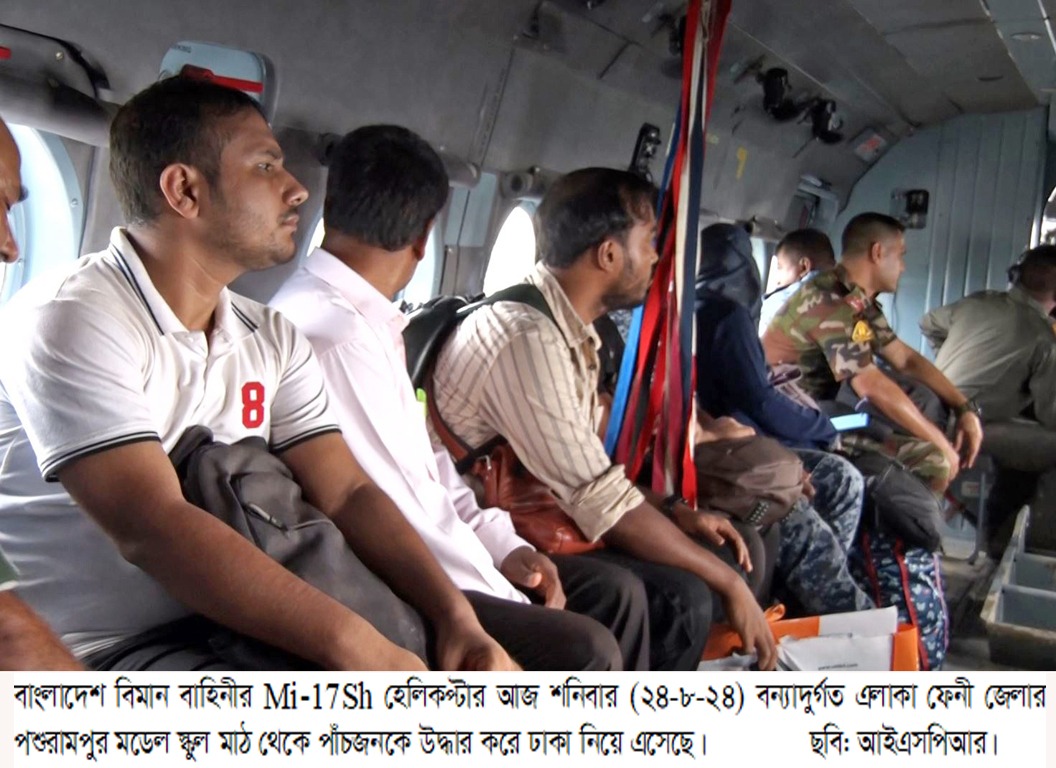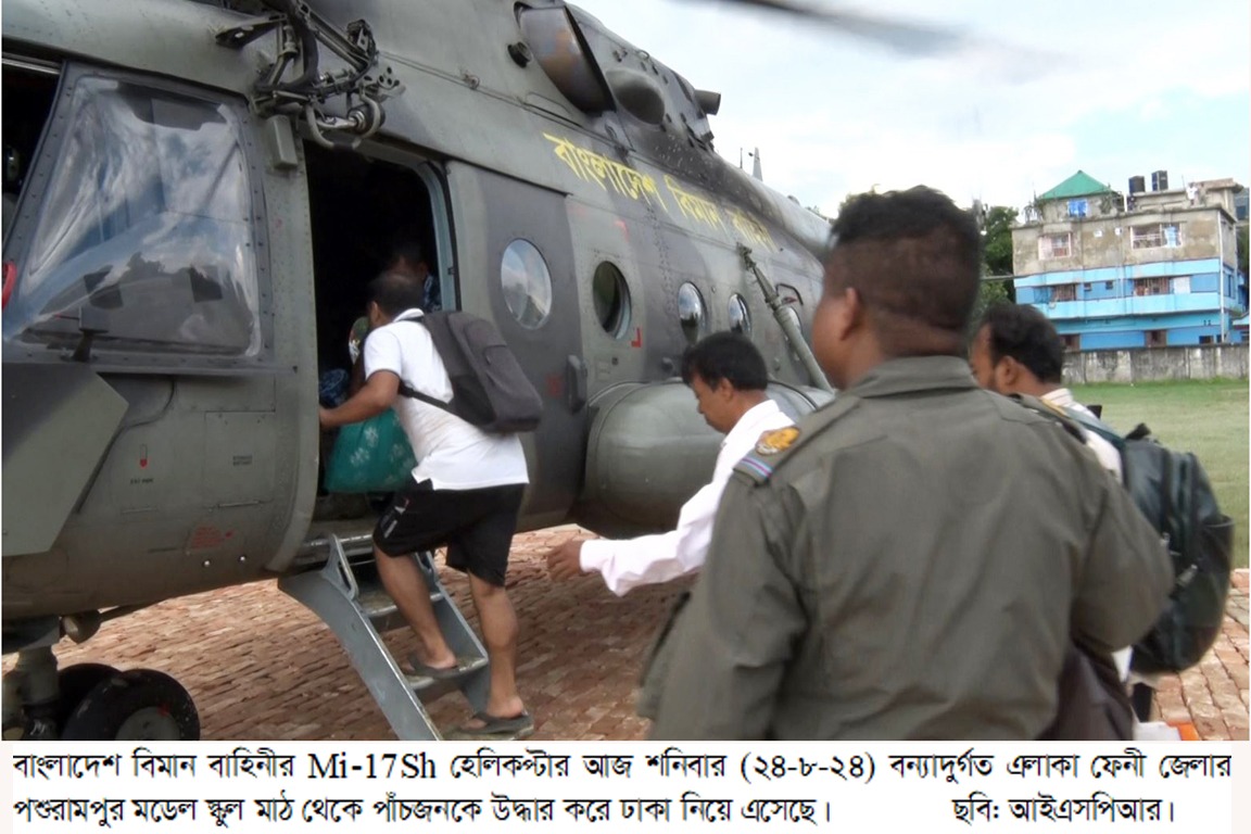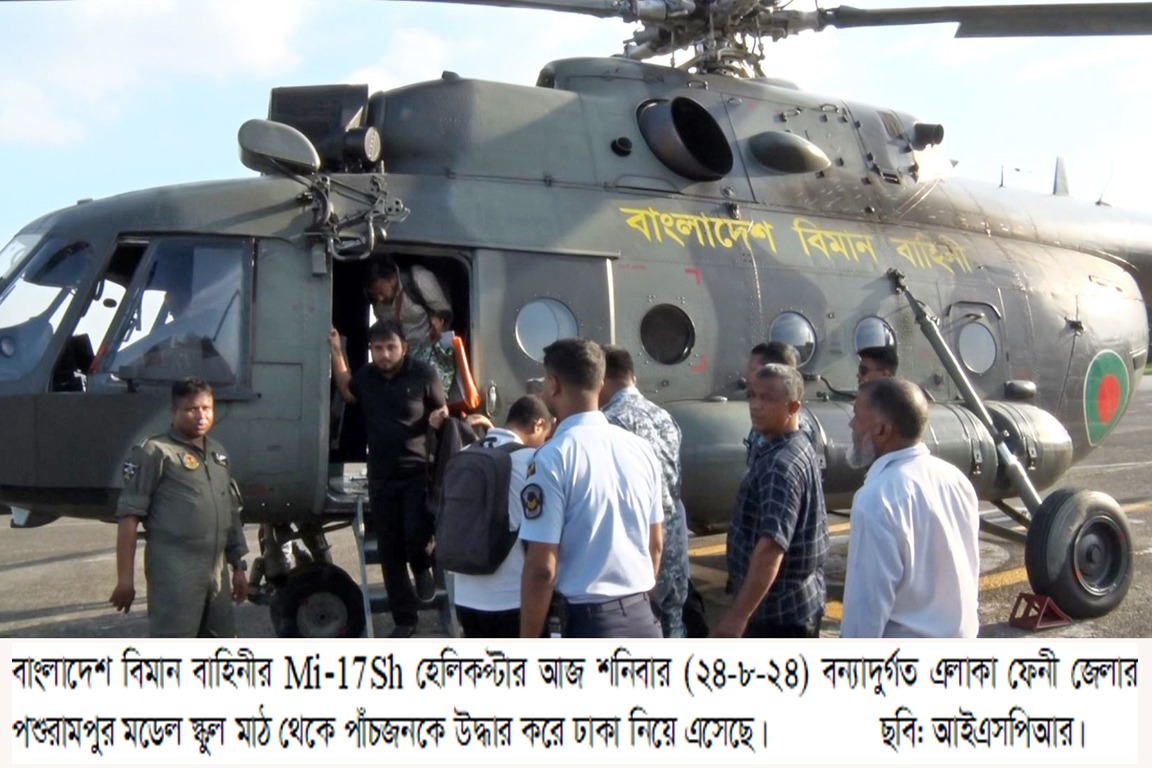 ঢাকা, ২৪ আগস্ট ২০২৪: বাংলাদেশ বিমান বাহিনী আবারও প্রমাণ করেছে যে, জাতীয় সংকটে তারা সর্বদা মানুষের পাশে রয়েছে। আজ, ২৪ আগস্ট ২০২৪, বন্যাকবলিত ফেনী জেলার পশুরামপুর মডেল স্কুল মাঠ থেকে বিমান বাহিনীর Mi-17Sh হেলিকপ্টারের মাধ্যমে পাঁচজনকে উদ্ধার করা হয়েছে। উদ্ধারকৃতদের মধ্যে ছিলেন তারিকুল ইসলাম, অজিত কর্মকার, অভিজিত কর্মকার, শারমিন এবং সাইদুর রহমান।