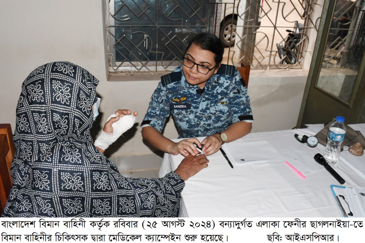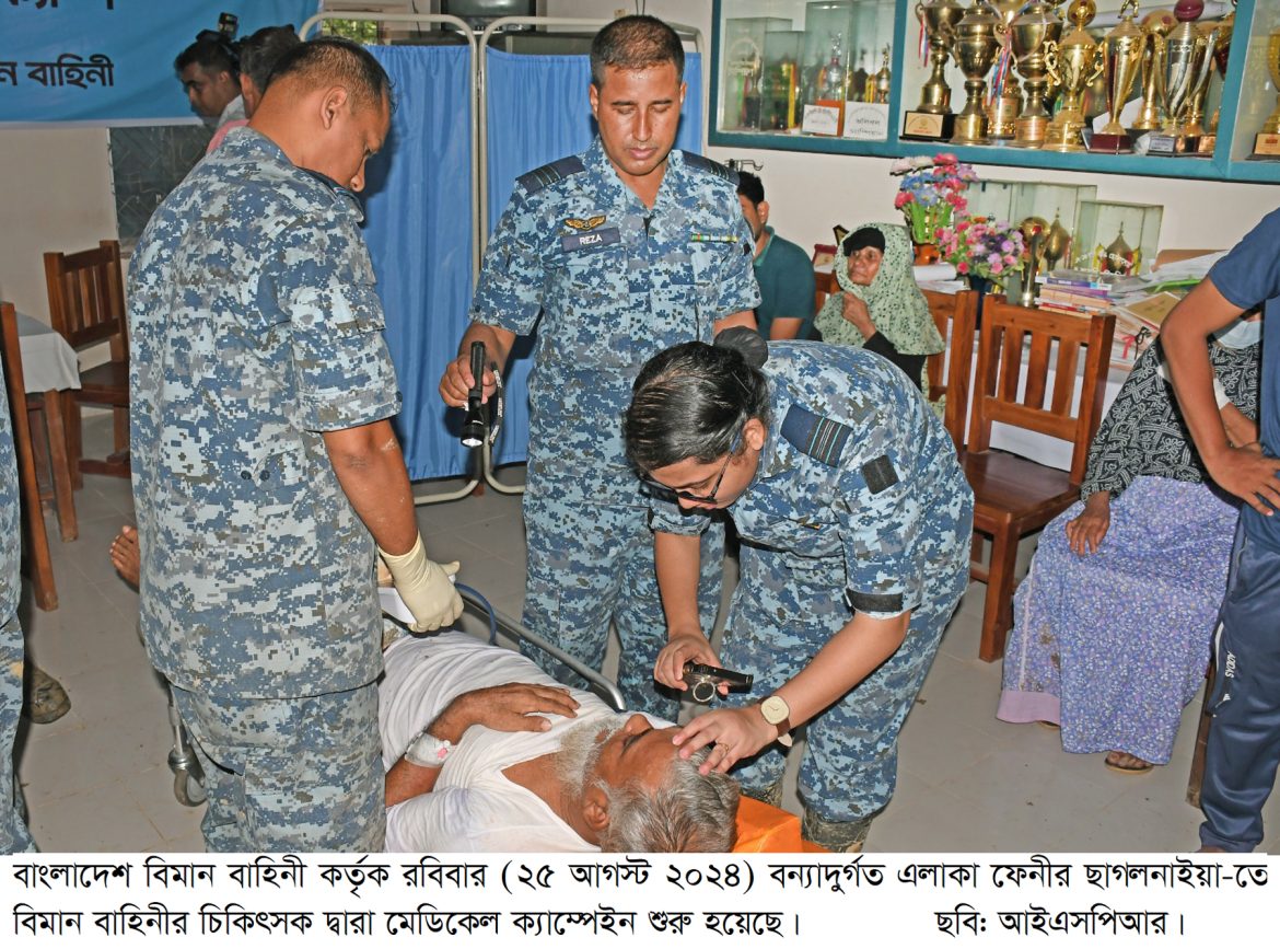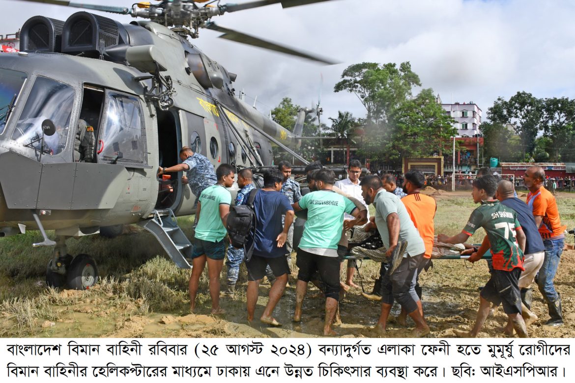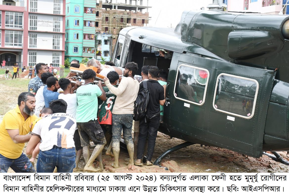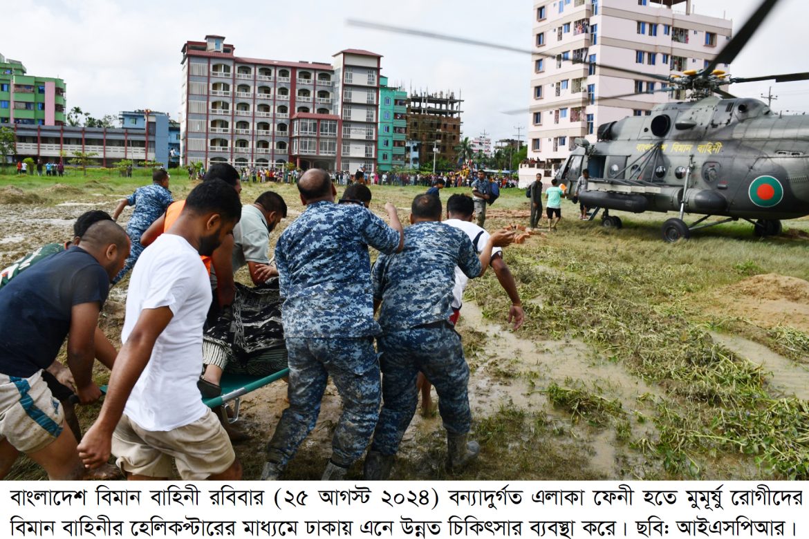 ঢাকা, ২৫ আগস্ট ২০২৪ ঃ বন্যা দুর্গত এলাকা ফেনীর ছাগলনাইয়া-তে রবিবার (২৫ আগস্ট ২০২৪) হতে বাংলাদেশ বিমান বাহিনীর বিশেষজ্ঞ চিকিৎসক দ্বারা মেডিকেল ক্যাম্পেইন পরিচালনা শুরু হয়েছে। এরই ধারাবাহিকতায় রোগীদেরকে বিমান বাহিনী কর্তৃক চিকিৎসা সেবা ও ওষুধ প্রদান করা হচ্ছে। এছাড়াও, বন্যা দুর্গত এলাকা ফেনী হতে জরুরি সেবা প্রদানের লক্ষ্যে গর্ভবতী মহিলাসহ অন্যান্য মুমূর্ষু রোগীদেরকে বাংলাদেশ বিমান বাহিনীর হেলিকপ্টারের মাধ্যমে বিমান বাহিনী ঘাঁটি বাশারে আনা হয় এবং প্রাথমিক চিকিৎসা শেষে উন্নত চিৎিসার জন্য তাদেরকে বিভিন্ন হাসপাতালে প্রেরণ করা হয়। পাশাপাশি বাংলাদেশ বিমান বাহিনীর হেলিকপ্টারের মাধ্যমে ত্রাণ সামগ্রী বিতরণ কার্যক্রম চলমান রয়েছে।