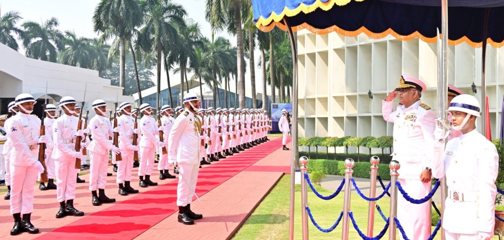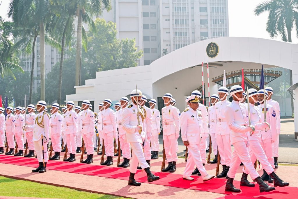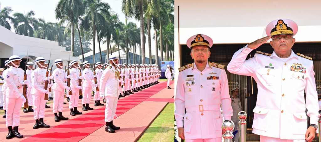 ঢাকা, ০৯ নভেম্বর ২০২৫ঃ পাকিস্তান নৌবাহিনী প্রধান এডমিরাল নাভিদ আশরাফ (Admiral Naveed Ashraf) তিন দিনের সরকারি সফরে বাংলাদেশে এসেছেন। সফরের অংশ হিসেবে আজ রবিবার (০৯-১১-২০২৫) বনানীস্থ নৌবাহিনী সদর দপ্তরে বাংলাদেশ নৌবাহিনী প্রধান এডমিরাল এম নাজমুল হাসান এর সাথে সৌজন্য সাক্ষাৎ করেন। এর আগে তিনি নৌবাহিনী সদর দপ্তরে এসে পৌঁছালে নৌবাহিনী প্রধান তাঁকে স্বাগত জানান। এ সময় বাংলাদেশে নৌবাহিনীর একটি সুসজ্জিত দল তাঁকে গার্ড অব অনার প্রদান করে। তিনি গার্ড পরিদর্শন এবং অভিবাদন গ্রহণ করেন।