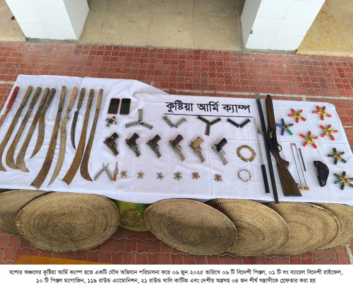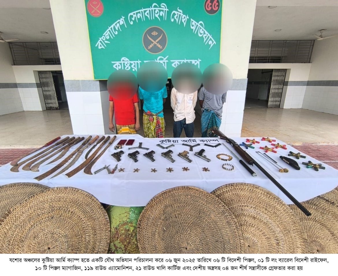 ঢাকা, ০৬ জুন ২০২৫ (শুক্রবার): আজ আনুমানিক ভোর চারটায় বাংলাদেশ সেনাবাহিনী কর্তৃক পরিচালিত অভিযানে কুষ্টিয়া জেলার ইবি থানাধীন দুর্বাচারা গ্রাম থেকে শীর্ষ সন্ত্রাসী জাহাঙ্গীর কবির লিপটন ও তার ঘনিষ্ঠ ৩ জন সহযোগীকে গ্রেফতার করা হয়। অভিযানকালে ০৬ টি বিদেশী পিস্তল, ০১ টি লং ব্যারেল বিদেশী গান, ১০ টি পিস্তল ম্যাগাজিন, ৩৩ রাউন্ড ৯ এমএম পিস্তল এ্যাম্যুনিশন, ৫০ রাউন্ড ৭.৬২ এমএম এ্যাম্যুনিশন, ৩৬ রাউন্ড ১২ বোর এ্যাম্যুনিশন, ২১ রাউন্ড খালি কার্তুজ, ১০ টি দেশীয় ধারালো অস্ত্র, ০৩ টি অস্ত্রের ক্লিনিং কীট, ০১ টি পিস্তল কভার, ০৮ টি শীল্ড ও ০৬ টি বল্লম উদ্ধার করা হয়।
