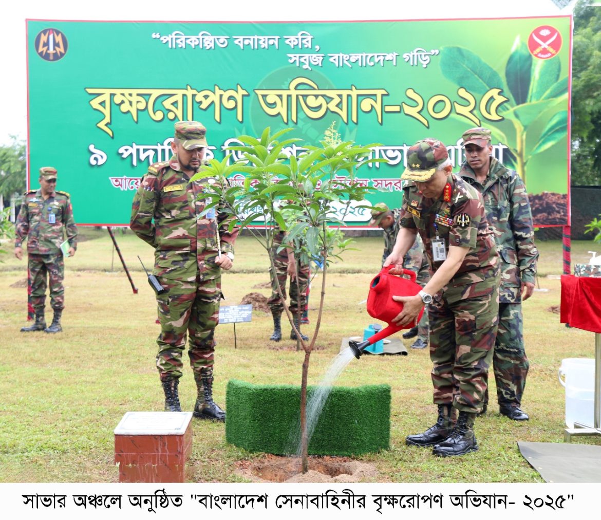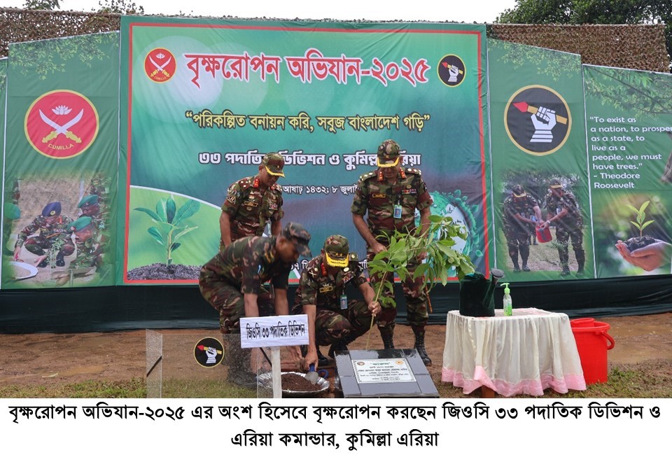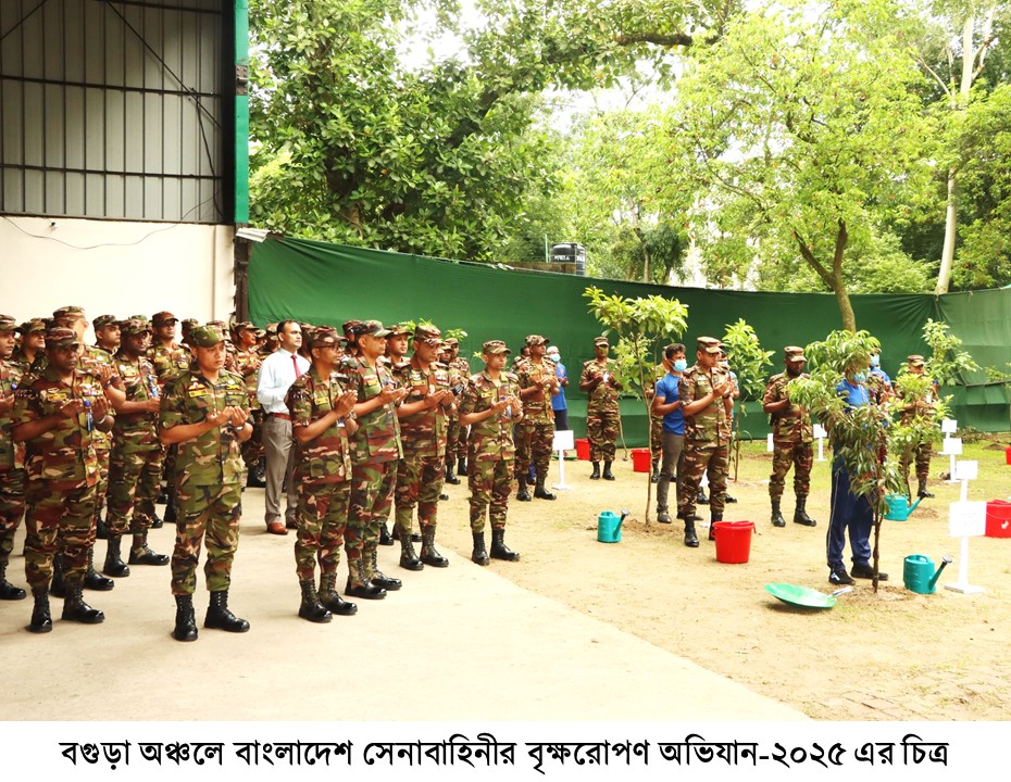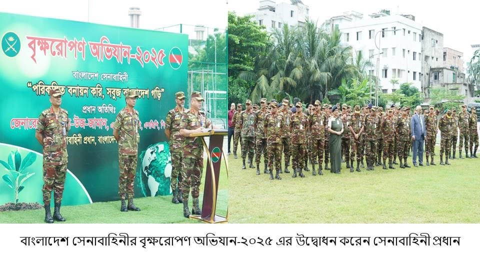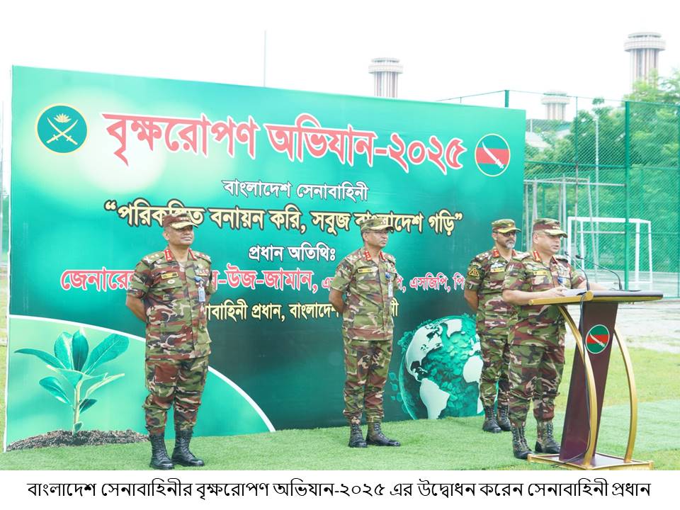 ‘পরিকল্পিত বনায়ন করি, সবুজ বাংলাদেশ গড়ি’ এই প্রতিপাদ্যে বাংলাদেশ সেনাবাহিনীর বৃক্ষরোপণ অভিযান-২০২৫ এ সকল সেনানিবাসের প্রশিক্ষণ ও ফায়ারিং রেঞ্জ এলাকা, ডিওএইচএস এবং জলসিঁড়ি আবাসন প্রকল্পে ফলজ, বনজ ও ঔষধি প্রজাতির বৃক্ষসহ সৌন্দর্য্যবর্ধক গাছের চারা রোপণের মাধ্যমে এই বৃক্ষরোপন কর্মসূচী একযোগে বাস্তবায়ন করা হবে, যা সেপ্টেম্বর ২০২৫ পর্যন্ত চলমান থাকবে।