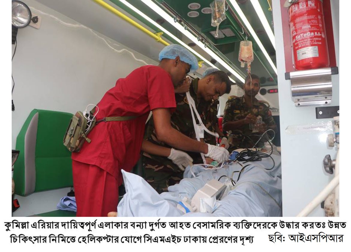 বাংলাদেশ সেনাবাহিনী কর্তৃক বন্যার্তদের উদ্ধার ও ত্রাণ বিতরণ কার্যক্রমের অগ্রগতি প্রতিবেদন ঢাকা, ২৬ আগস্ট ২০২৪ (সোমবার): বন্যা পরিস্থিতি মোকাবিলায় আজ (২৬ আগস্ট ২০২৪) বাংলাদেশ সেনাবাহিনী জল, স্থল ও আকাশ পথে উদ্ধার অভিযান ও ত্রাণ বিতরণ কার্যক্রম পরিচালনা করে। দ্রুততার সাথে উদ্ধার কার্যক্রম পরিচালনা ও ত্রাণ বিতরণের লক্ষ্যে সেনাবাহিনীর আর্মি এভিয়েশন গ্রুপ ১৫ টি হেলিকপ্টার সর্টির মাধ্যমে উদ্ধার ও ত্রাণ বিতরণ কার্যক্রম পরিচালনা করে। উল্লেখ্য, হেলিকপ্টারের মাধ্যমে ১১ জন মুমূর্ষ রোগীকে উদ্ধারপূর্বক হাসপাতালে স্থানান্তর ও ২৪ জন ব্যক্তিকে দুর্যোগপূর্ণ এলাকা হতে নিরাপদ স্থানে স্থানান্তর করা হয়। প্রতিকূল আবহাওয়া সত্ত্বেও ৪,৮৩৯ প্যাকেট ত্রান, ৫০,৪০০ লিটার বিশুদ্ধ পানি, ৫০০ মোবাইল ফোন ও এক লাখ পিস পানি বিশুদ্ধকরণ ট্যাবলেট সিলেট, চট্টগ্রাম,ফেনী সদর, ফাজিলপুর, ছাগলনাইয়া, সোনাগাজী, পরশুরাম ও মধুগ্রাম এলাকায় সেনাবাহিনীর হেলিকপ্টার এর মাধ্যমে বিতরণ করা হয়েছে। দুর্যোগপূর্ণ পরিস্থিতি মোকাবিলায় সেনাবাহিনীর এ কার্যক্রম চলমান থাকবে।