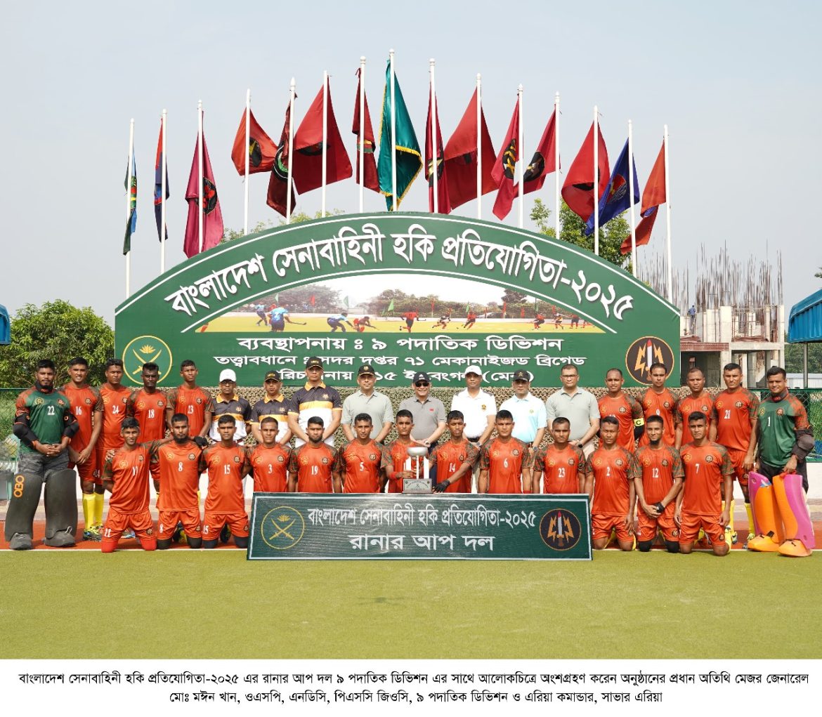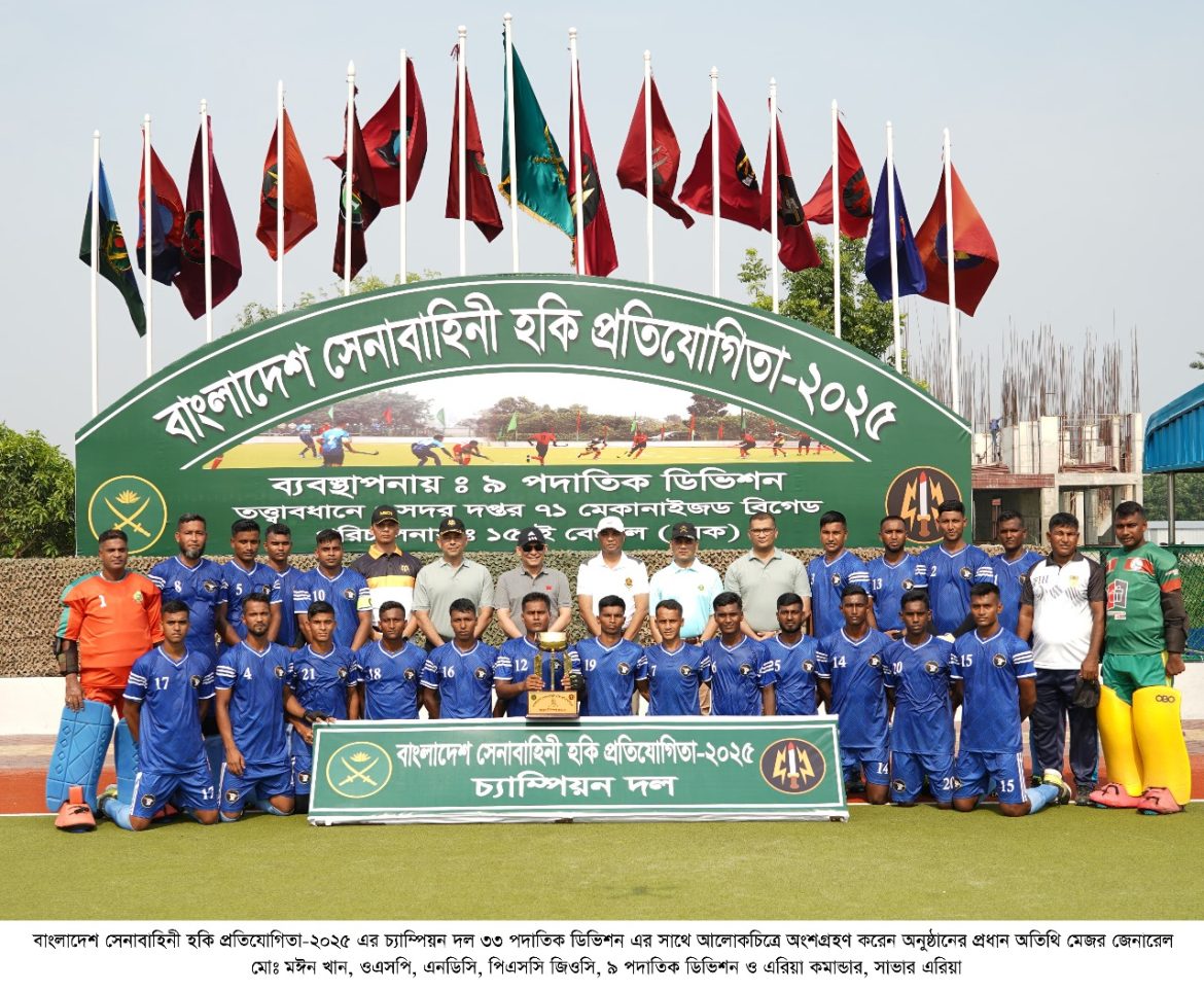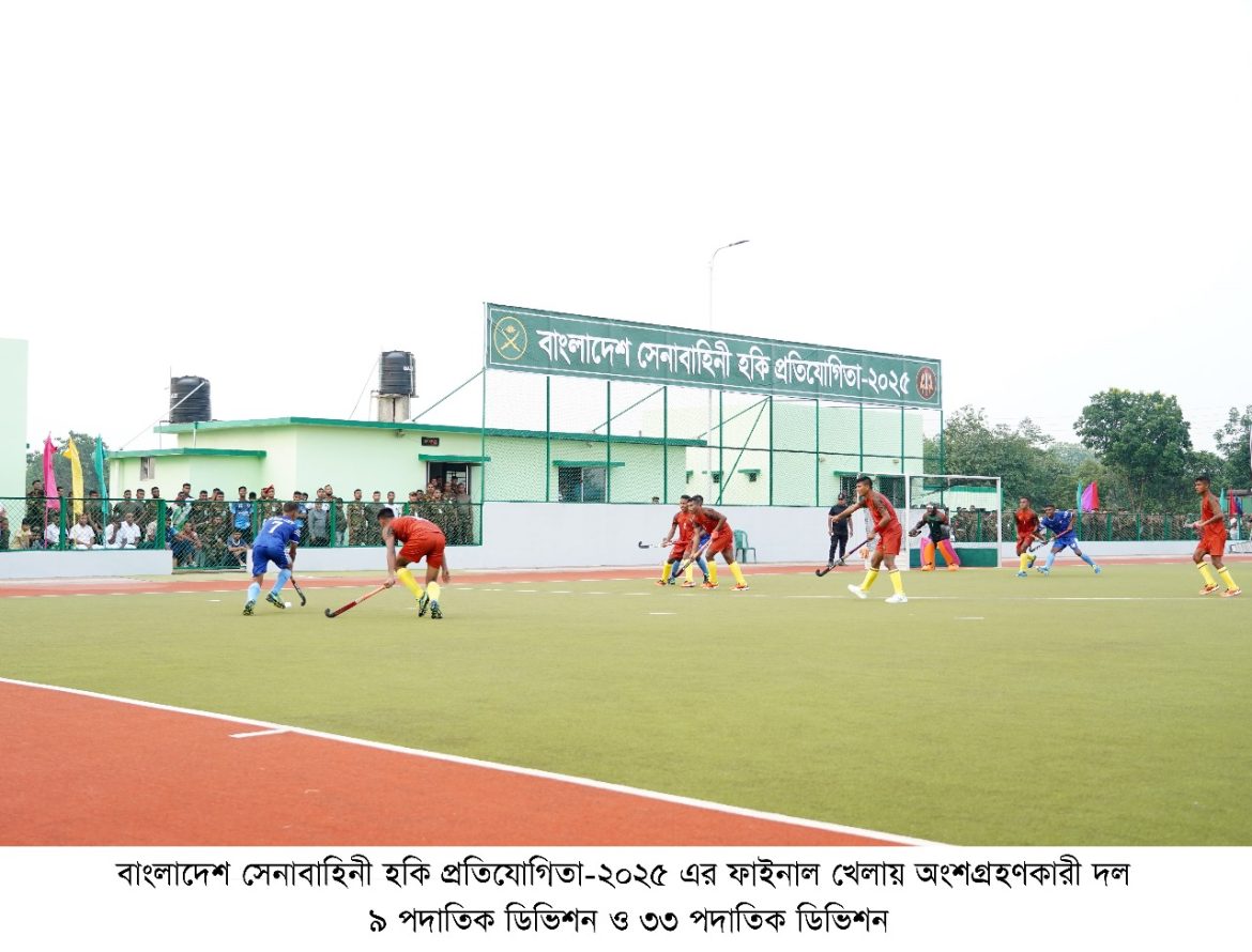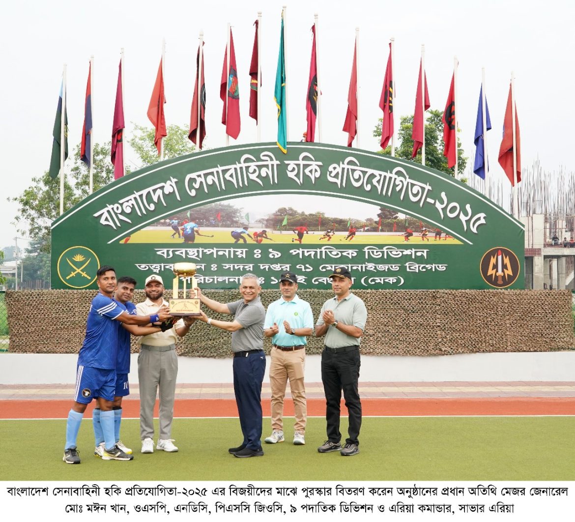 ঢাকা, ০৮ মে ২০২৫ (বৃহস্পতিবার): আজ ০৮ মে ২০২৫ বাংলাদেশ সেনাবাহিনী হকি প্রতিযোগিতা-২০২৫ এর সমাপনী ও পুরস্কার বিতরণী অনুষ্ঠান ৯ পদাতিক ডিভিশন, সাভার সেনানিবাসে অনুষ্ঠিত হয়। সমাপনী অনুষ্ঠানে মেজর জেনারেল মোঃ মঈন খান, ওএসপি, এনডিসি, পিএসসি, জিওসি ৯ পদাতিক ডিভিশন ও এরিয়া কমান্ডার সাভার এরিয়া প্রধান অতিথি হিসেবে উপস্থিত থেকে বিজয়ীদের মাঝে পুরস্কার বিতরণ করেন। প্রতিযোগিতায় ৩৩ পদাতিক ডিভিশন দল চ্যাম্পিয়ন ও ৯ পদাতিক ডিভিশন দল রানারআপ হওয়ার গৌরব অর্জন করে। প্রতিযোগিতায় ল্যান্স কর্পোরাল ইয়াসিন আরাফাত, ৯ পদাতিক ডিভিশন শ্রেষ্ঠ খেলোয়াড় এবং সৈনিক মোঃ হাবিব হোসেন, ৯ পদাতিক ডিভিশন শ্রেষ্ঠ নবীন খেলোয়াড় হওয়ার গৌরব অর্জন করেন।