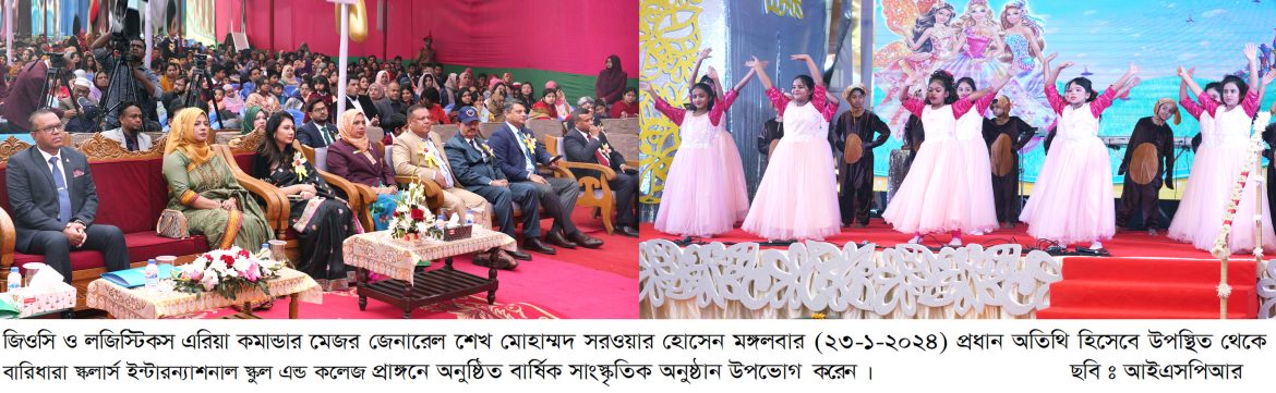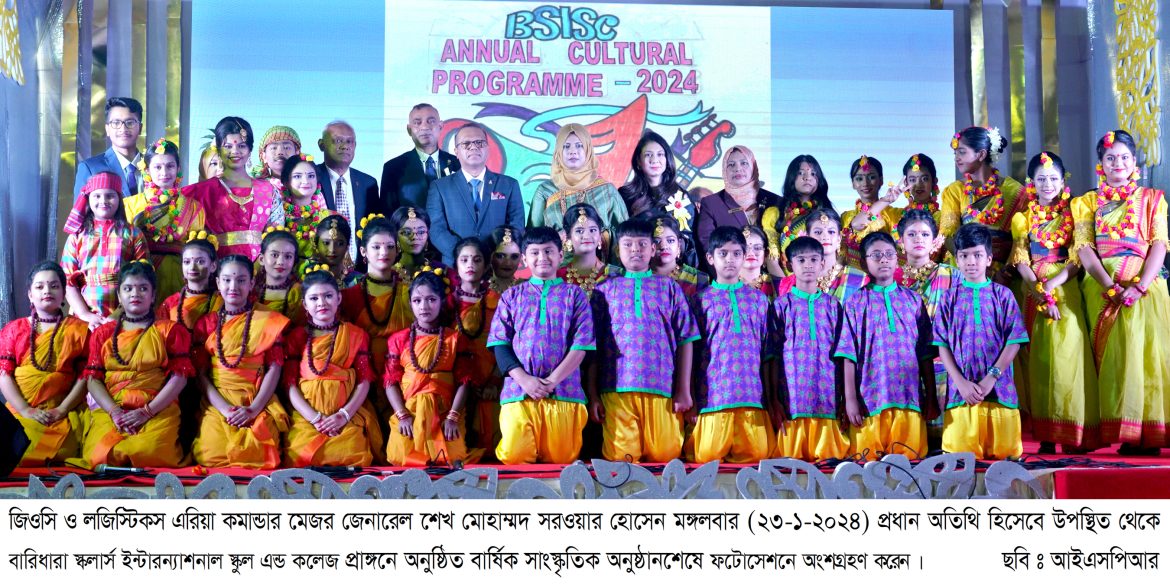 ঢাকা, ২৩ জানুয়ারি ২০২৪ : বারিধারা স্কলার্স ইন্টারন্যাশনাল স্কুল এ্যান্ড কলেজের (বিএসআইএসসি) বার্ষিক সাংস্কৃতিক অনুষ্ঠান-২০২৪ আজ মঙ্গলবার (২৩-১-২০২৪) প্রতিষ্ঠান প্রাঙ্গনে অনুষ্ঠিত হয় । উক্ত অনুষ্ঠানে প্রধান অতিথি হিসেবে উপস্থিত ছিলেন কলেজের সম্মানিত প্রধান পৃষ্ঠপোষক, মেজর জেনারেল শেখ মোহাম্মদ সারওয়ার হোসেন, এসইউপি, এনডিসি, পিএসসি, জিওসি, ও এরিয়া কমান্ডার, লজিস্টিকস এরিয়া, ঢাকা সেনানিবাস। এছাড়াও বিশেষ অতিথি হিসেবে উপস্থিত ছিলেন তাঁর সহধর্মিণী মিসেস ফারহানা সারওয়ার। ব্রিগেডিয়ার জেনারেল সাইফুল হক খান, এনডিসি, পিএসসি, কমান্ড্যান্ট সিওডি, ঢাকা সেনানিবাস ও সভাপতি, পরিচালনা পর্ষদ, বিএসআইএসসি এ অনুষ্ঠানে উপস্থিত থেকে অনুষ্ঠানটি উপভোগ করেন। উক্ত অনুষ্ঠানে আরও উপস্থিত ছিলেন অনেক সামরিক ও বেসামরিক কর্মকর্তাবৃন্দ। বিএসআইএসসি এর অধ্যক্ষ ব্রিগেডিয়ার জেনারেল শেখ শরিফুল ইসলাম, পিএইচডি (অব:) উক্ত অনুষ্ঠানকে সাফল্য মÐিত করতে সর্বাত্মক ভূমিকা রাখেন।