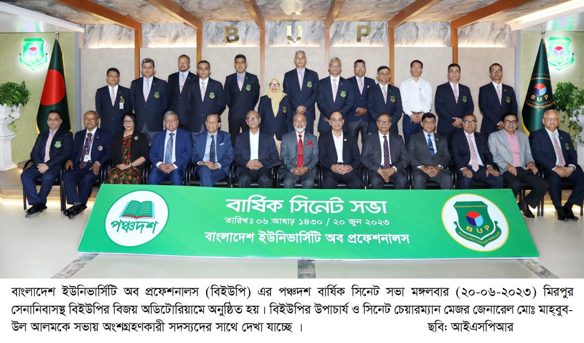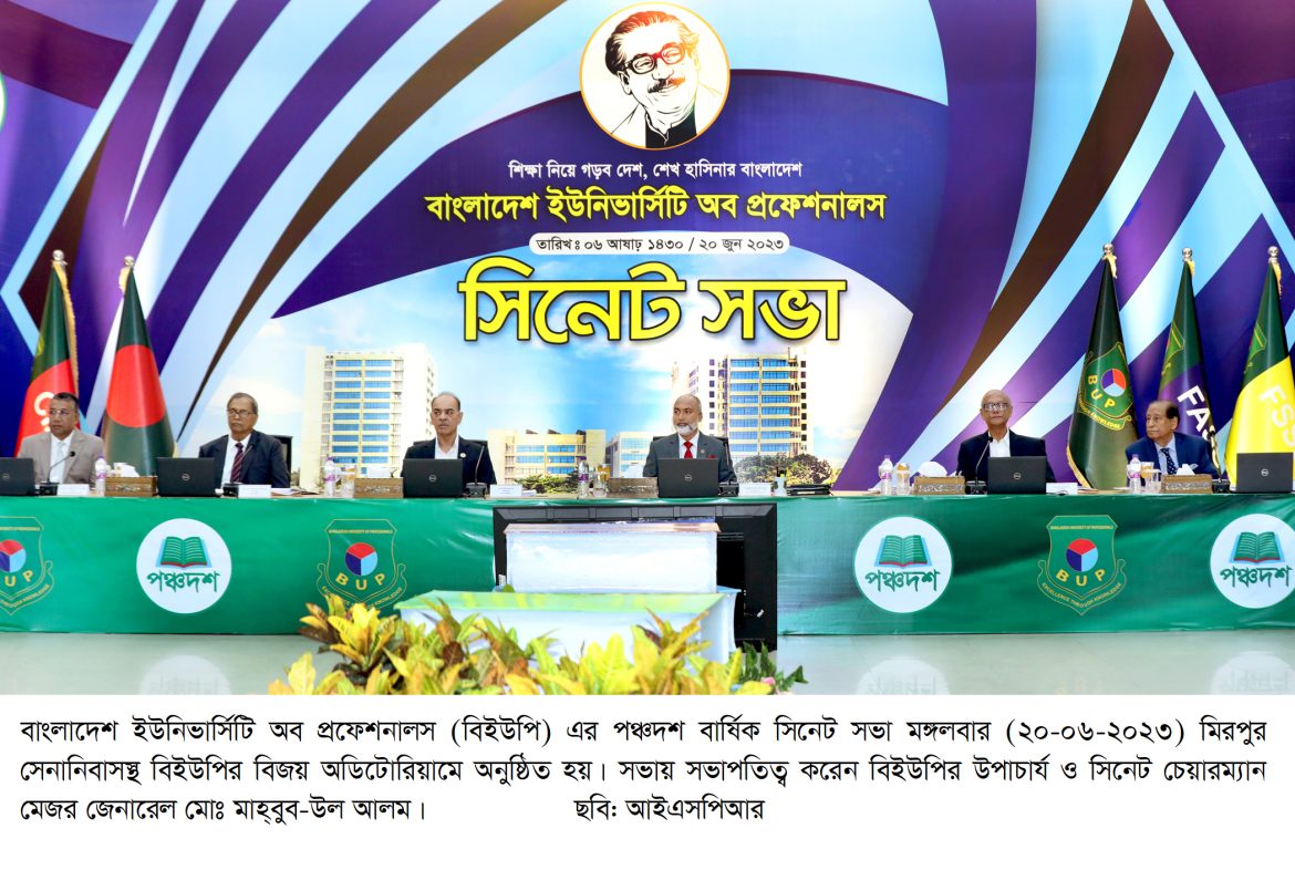 ঢাকা, ২০ জুন, ২০২৩: ২০ জুন ২০২৩ তারিখে বাংলাদেশ ইউনিভার্সিটি অব প্রফেশনালস (বিইউপি) এর পঞ্চদশ বার্ষিক সিনেট সভা বিইউপির বিজয় অডিটোরিয়ামে অনুষ্ঠিত হয়। সভায় সভাপতিত্ব করেন বিইউপির উপাচার্য ও সিনেট চেয়ারম্যান মেজর জেনারেল মোঃ মাহ্বুব-উল আলম, এনডিসি, এএফডবিøউসি, পিএসসি, এমফিল, পিএইচডি (Major General Md Mahbub-ul Alam, ndc, afwc, psc, MPhil, PhD) ।