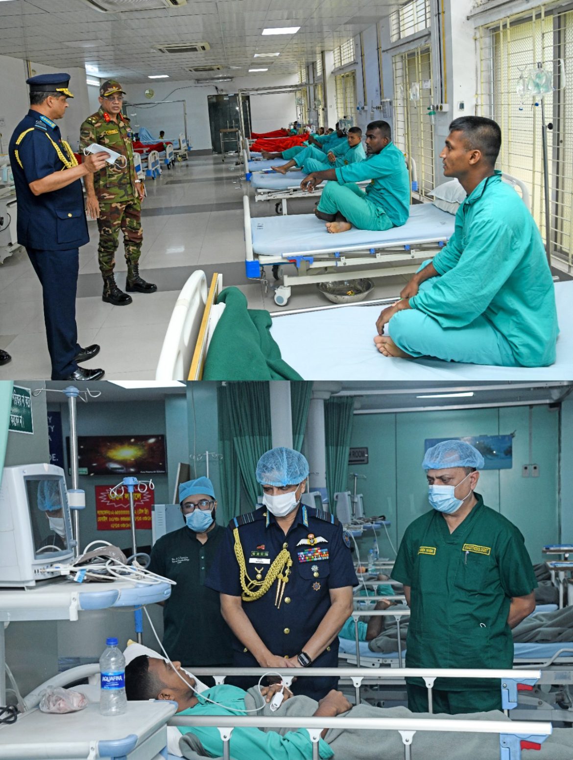 ঢাকায় পৌঁছেই তিনি রাজধানীর সম্মিলিত সামরিক হাসপাতাল (সিএমএইচ) এবং বার্ন ও প্লাস্টিক সার্জারি ইনস্টিটিউট পরিদর্শন করেন। সেখানে তিনি আহতদের চিকিৎসা এবং তাঁদের শারীরিক অবস্থার খোঁজখবর নেন। তিনি সেখানে বলেন, সরকার আহতদের সুচিকিৎসা নিশ্চিতে সব ধরণের সহায়তা দিয়ে যাচ্ছে এবং ভবিষ্যতেও তা অব্যাহত থাকবে। এছাড়া আহতদের দ্রুত ও মানসম্পন্ন সুচিকিৎসা নিশ্চিত করতে এবং ক্ষতিগ্রস্থদের সর্বোচ্চ সহযোগিতা করতে মাননীয় প্রধান উপদেষ্টার দিক নিদের্শনা অনুসারে যা যা করণীয়, বিমান বাহিনী অন্যান্য বাহিনী ও সংস্থার সাথে প্রয়োজনীয় সমন্বয় করতঃ সবকিছু করবে।