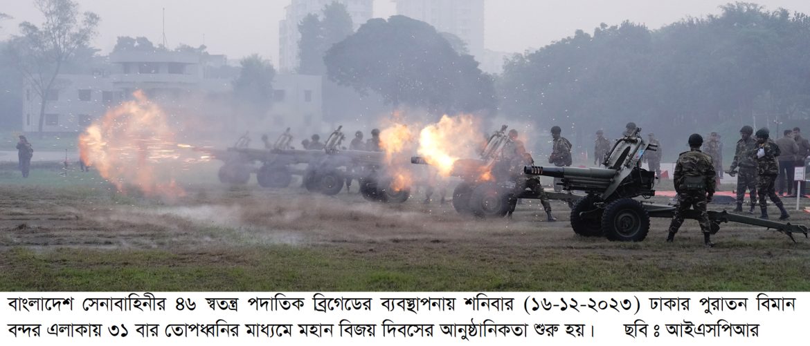 ঢাকা, ১৬ ডিসেম্বর ২০২৩ মহান বিজয় দিবস-২০২৩ উদ্যাপন উপলক্ষে ঢাকা পুরাতন বিমান বন্দর এলাকায় (তেজগাঁও) আজ শনিবার (১৬-১২-২০২৩) সূর্যোদয়ের সাথে সাথে ৩১ বার তোপধ্বনির মাধ্যমে মহান বিজয় দিবসের আনুষ্ঠানিকতা শুরু হয়। বাংলাদেশ সেনাবাহিনীর একটি আর্টিলারি রেজিমেন্টের ০৬ টি গান ৩১ বার তোপধ¡নির মাধ্যমে মহান স্বাধীনতা যুদ্ধে আত্বোৎসর্গকারী বীর শহিদদের প্রতি গান স্যালুট প্রদর্শন করে।