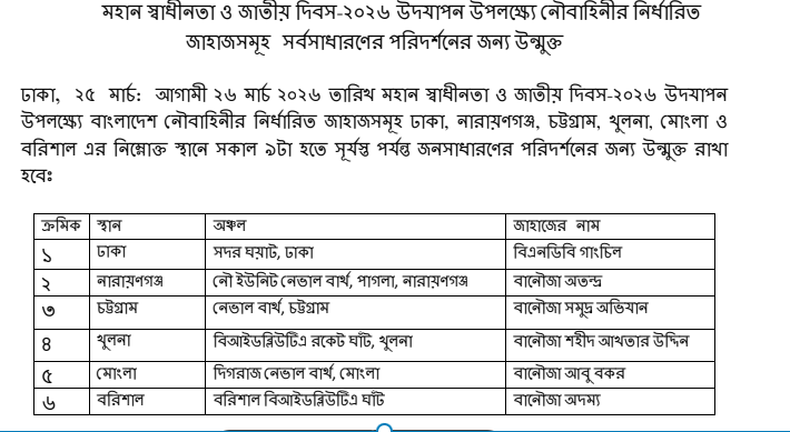 এএফডিনৌবাহিনীব্রেকিং নিউজহোম মহান স্বাধীনতা ও জাতীয় দিবস-২০২৬ উদযাপন উপলক্ষ্যে নৌবাহিনীর নির্ধারিত জাহাজসমূহ সর্বসাধারণের পরিদর্শনের জন্য উন্মুক্ত Author: আইএসপিআর মার্চ ২৪, ২০২৬ Author: আইএসপিআর মার্চ ২৪, ২০২৬ ১৬ 0 FacebookTwitterPinterestEmail আইএসপিআর এই সংবাদটি আন্তঃবাহিনী জনসংযোগ পরিদপ্তর কর্তৃক যাচাইকৃত ও প্রকাশিত। Before Post সেনাবাহিনী প্রধান কর্তৃক পার্বত্য চট্টগ্রামে সেনা ক্যাম্প পরিদর্শন Next Post শুভেচ্ছা সফরে রাশিয়ান নৌবাহিনী জাহাজের চট্টগ্রামে আগমন সম্পর্কিত পোস্ট সরকারি সফরে যুক্তরাষ্ট্র গমন করলেন সেনাবাহিনী প্রধান মার্চ ২৯, ২০২৬ মহান স্বাধীনতা দিবস- ২০২৬ উপলক্ষ্যে বিমান বাহিনীতে অনারারি... মার্চ ২৮, ২০২৬ মহান স্বাধীনতা ও জাতীয় দিবস-২০২৬ উপলক্ষ্যে সাংস্কৃতিক অনুষ্ঠান... মার্চ ২৬, ২০২৬ মহান স্বাধীনতা ও জাতীয় দিবস উপলক্ষে নৌবাহিনীতে অনারারী... মার্চ ২৬, ২০২৬ মহান স্বাধীনতা ও জাতীয় দিবস কুচকাওয়াজ-২০২৬ মার্চ ২৬, ২০২৬ মহান স্বাধীনতা ও জাতীয় দিবস-২০২৬ উপলক্ষ্যে সেনাবাহিনী কর্তৃক... মার্চ ২৬, ২০২৬ মহান স্বাধীনতা ও জাতীয় দিবস উপলক্ষে সেনাবাহিনীতে অনারারী... মার্চ ২৬, ২০২৬ মহান স্বাধীনতা ও জাতীয় দিবস-২০২৬ উদযাপন উপলক্ষ্যে নৌবাহিনীর... মার্চ ২৫, ২০২৬ শুভেচ্ছা সফরে রাশিয়ান নৌবাহিনী জাহাজের চট্টগ্রামে আগমন মার্চ ২৪, ২০২৬ সেনাবাহিনী প্রধান কর্তৃক পার্বত্য চট্টগ্রামে সেনা ক্যাম্প পরিদর্শন মার্চ ২২, ২০২৬