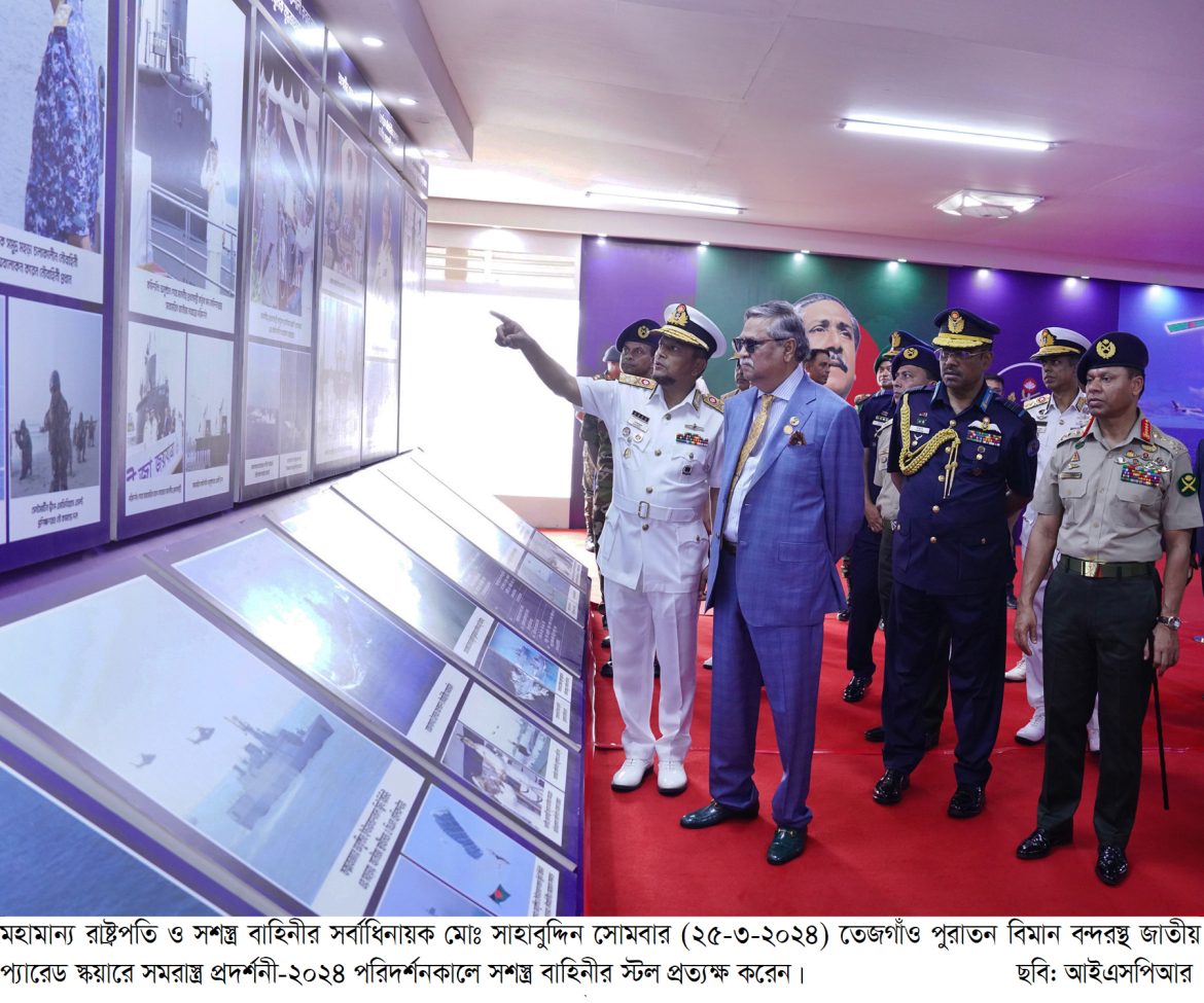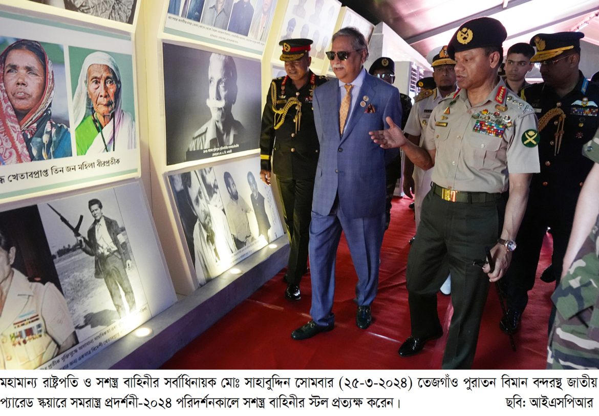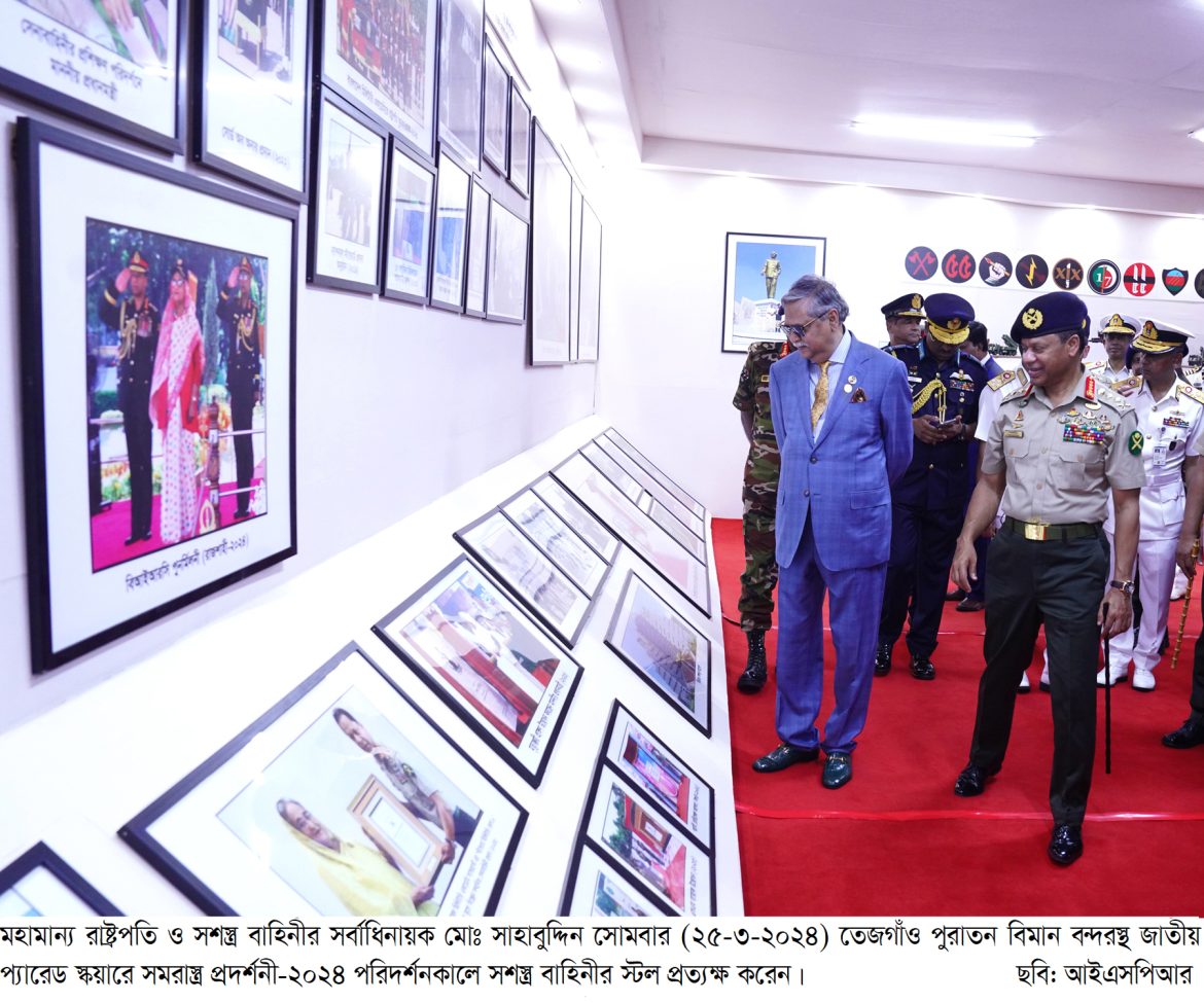 ঢাকা, ২৫ মার্চ ২০২৪ঃ- মহামান্য রাষ্ট্রপতি ও সশস্ত্র বাহিনীর সর্বাধিনায়ক মোঃ সাহাবুদ্দিন আজ, সোমবার (২৫-৩-২০২৪) মহান স্বাধীনতা ও জাতীয় দিবস-২০২৪ উদ্যাপন উপলক্ষ্যে ঢাকার তেজগাঁও পুরাতন বিমান বন্দরস্থ জাতীয় প্যারেড স্কয়ারে আয়োজিত সমরাস্ত্র প্রদর্শনী পরিদর্শন করেন।