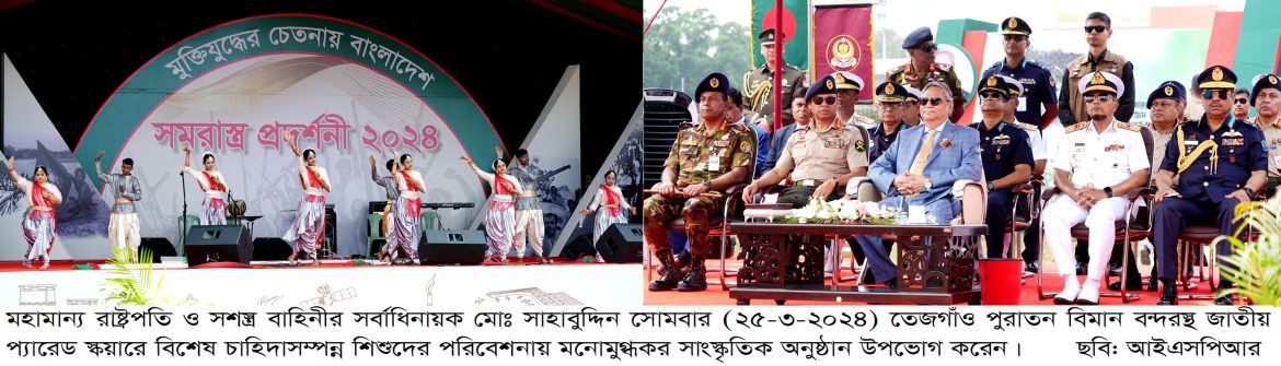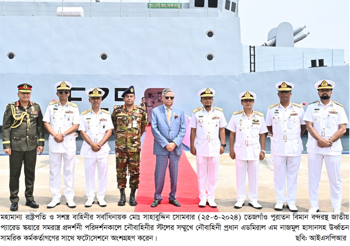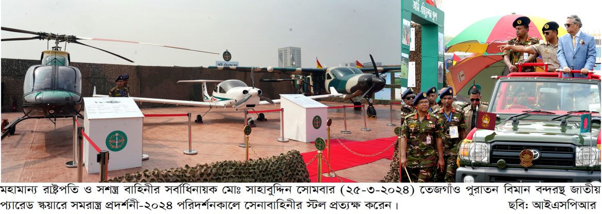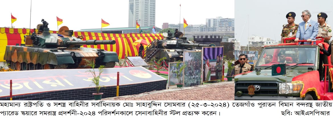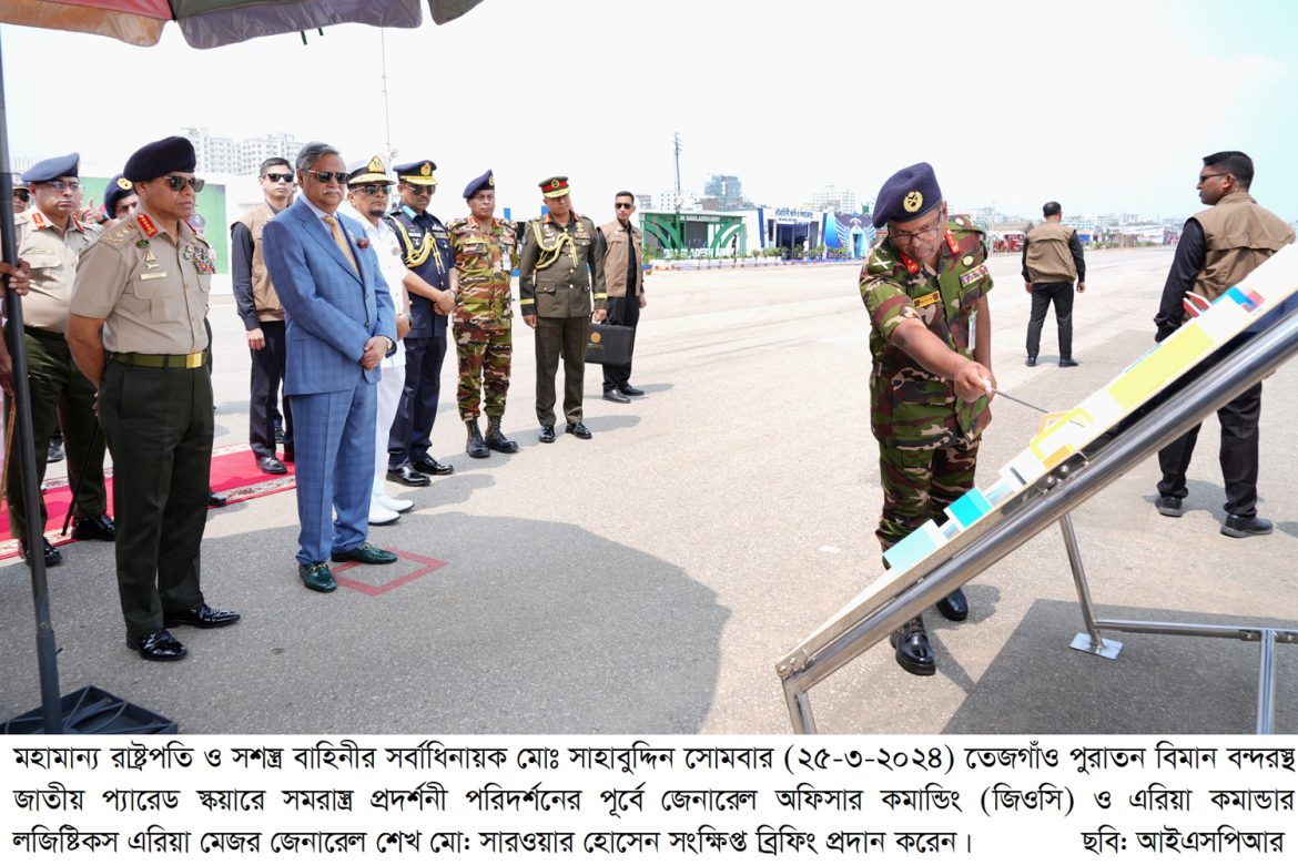 ঢাকা, ২৫ মার্চ ২০২৪ঃ- মহামান্য রাষ্ট্রপতি ও সশস্ত্র বাহিনীর সর্বাধিনায়ক মোঃ সাহাবুদ্দিন আজ, সোমবার (২৫-৩-২০২৪) মহান স্বাধীনতা ও জাতীয় দিবস-২০২৪ উদ্যাপন উপলক্ষ্যে ঢাকার তেজগাঁও পুরাতন বিমান বন্দরস্থ জাতীয় প্যারেড স্কয়ারে আয়োজিত সমরাস্ত্র প্রদর্শনী পরিদর্শন করেন।
