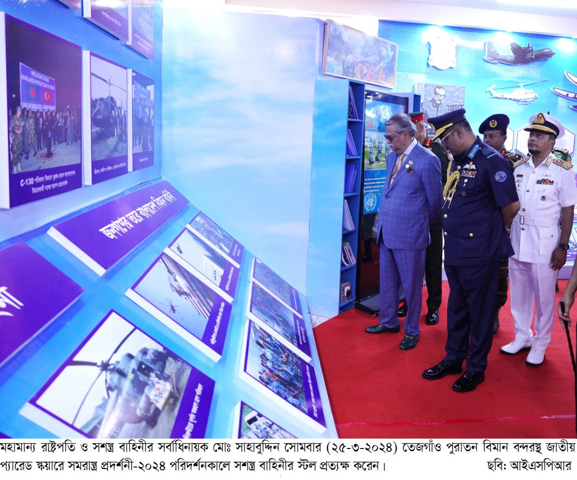 রাষ্ট্রপতি মোঃ সাহাবুদ্দিন বাংলাদেশ সেনাবাহিনীর চৌকস ছত্রীসেনা কর্তৃক প্যারা ট্রুপিং প্রত্যক্ষ করেন। তিনি বিভিন্ন স্টল ঘুরে দেখেন এবং স্টলসমূহে প্রদশিত সেনা, নৌ ও বিমান বাহিনীর বিভিন্ন সমরাস্ত্র ও যুদ্ধ সরঞ্জাম পরিদর্শন করেন।