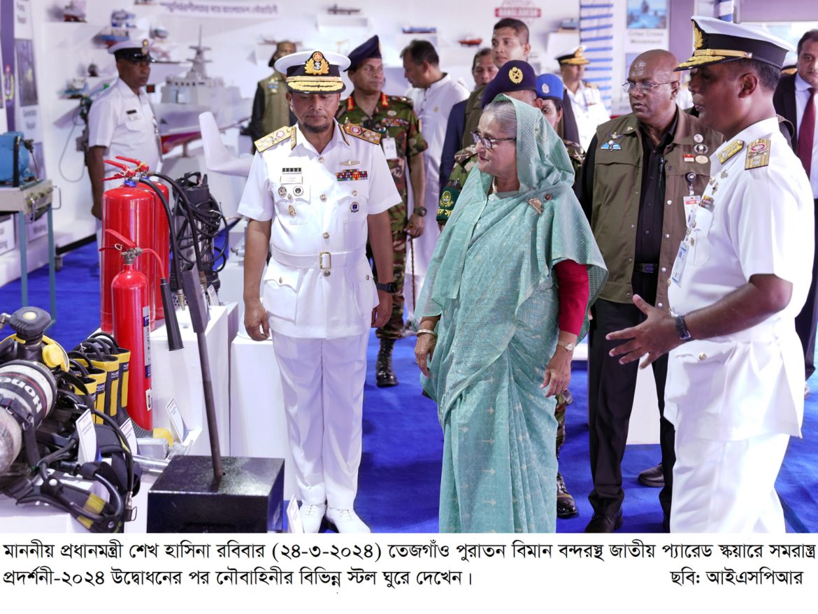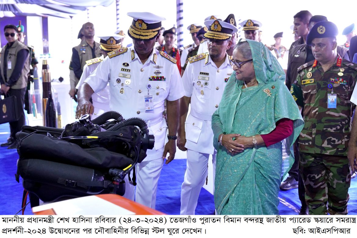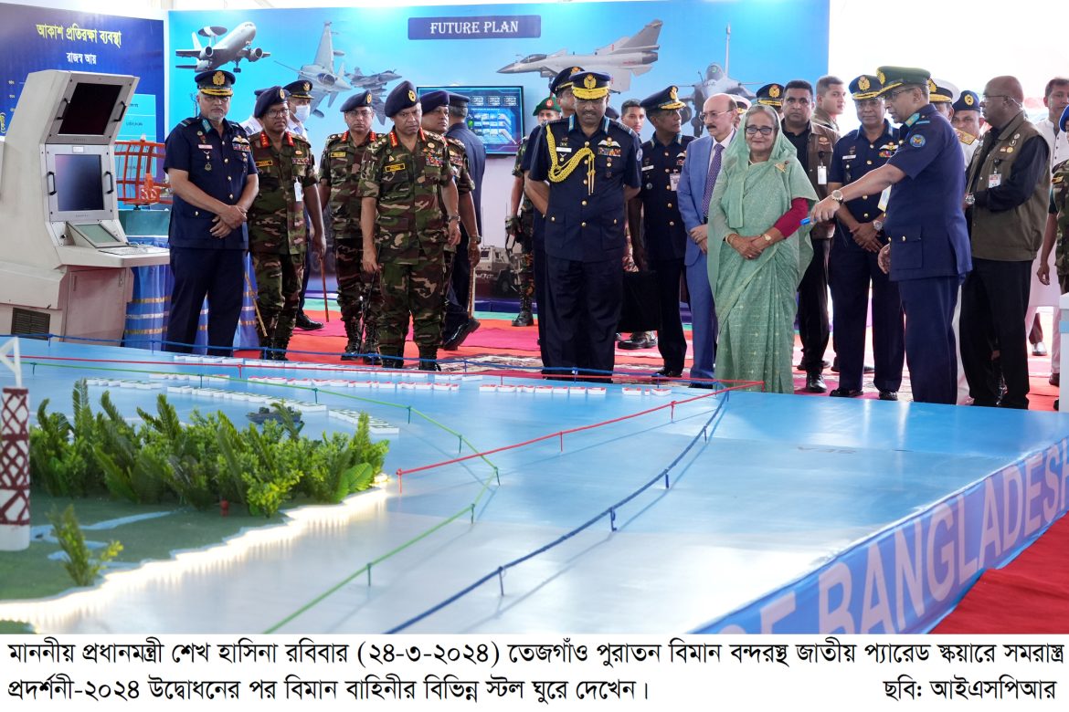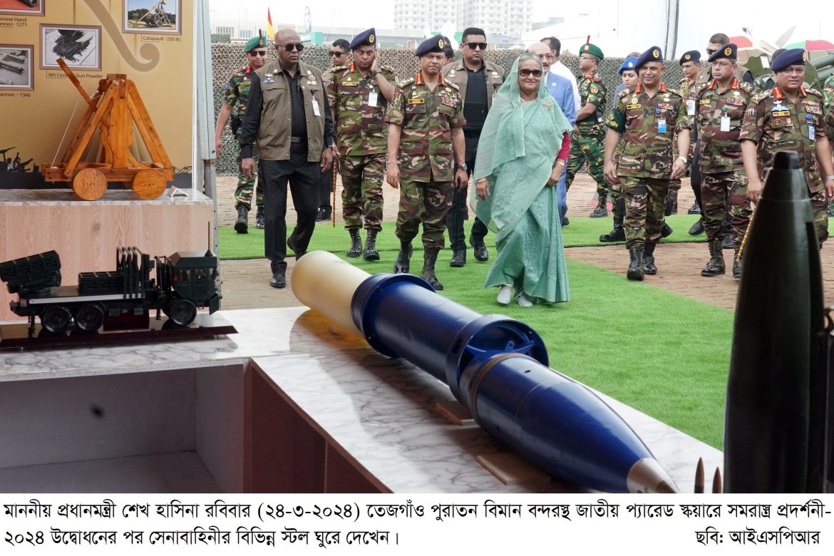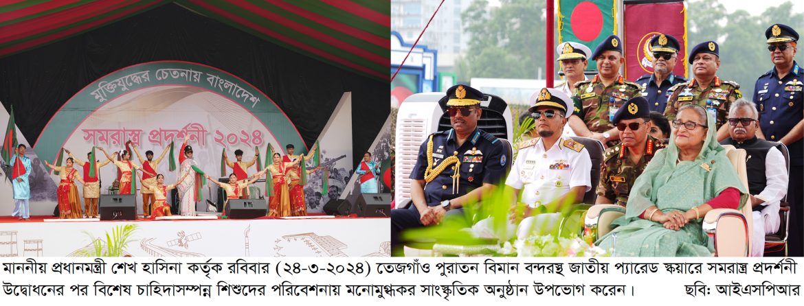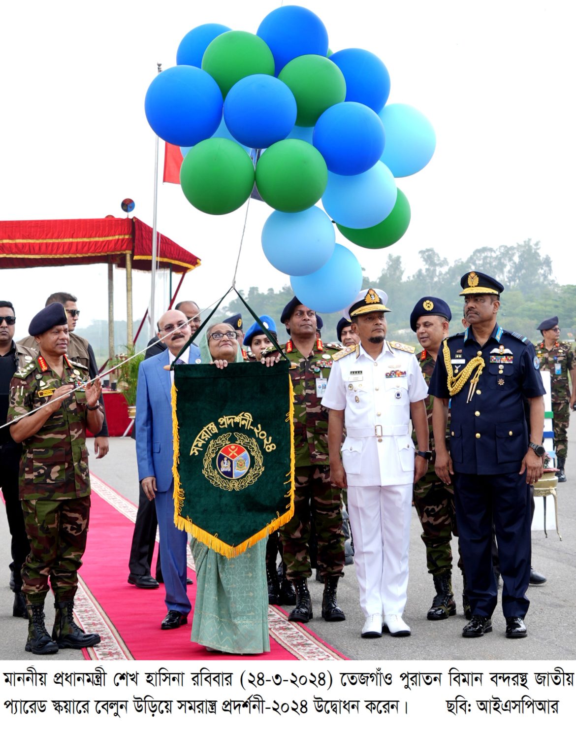 ঢাকা, ২৪ মার্চ ২০২৪ঃ মাননীয় প্রধানমন্ত্রী শেখ হাসিনা মহান স্বাধীনতা ও জাতীয় দিবস-২০২৪ উদ্যাপন উপলক্ষ্যে আজ, রবিবার (২৪-৩-২০২৪) ঢাকার তেজগাঁও পুরাতন বিমান বন্দরস্থ জাতীয় প্যারেড স্কয়ারে বাংলাদেশ সেনা, নৌ ও বিমান বাহিনীর সম্মিলিত সমরাস্ত্র প্রদর্শনীর উদ্বোধন করেন।